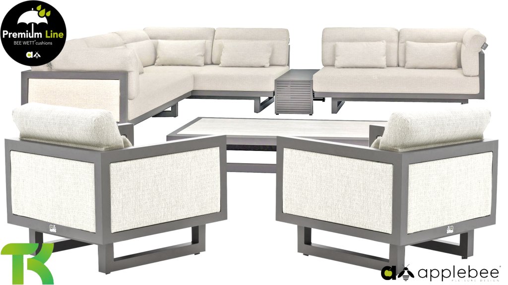 Apple Bee Santorini Lounge: Wenn Sie ein straffes und kubistisches Lounge-Set mögen, aber nicht auf Eigenwilligkeit verzichten möchten... hier ist Santorini! Ein straffes, Aluminium-Vierkantrohrgestell, pulverbeschichtet in warmem Taupe. Dieses Set ist in zwei Ausführungen erhältlich. Der Unterschied liegt in den Paneelen in den Armlehnen und der Rückenlehne, die durch den Rahmen wie ein Gemälde umrahmt wirken. In der ersten Ausführung ist das Paneel mit wunderschön meliertem Seil umwickelt. Dadurch behält das Set Leichtigkeit mit einem zeitgemäßen Look. Die andere Ausführung hat gepolsterte Paneelen im selben Stoff wie die Kissen. Dadurch erhält das Set sofort mehr Klasse und Luxus.