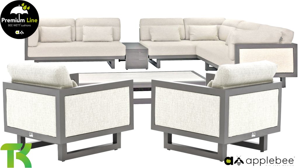 Apple Bee Santorini Lounge: Wenn Sie ein straffes und kubistisches Lounge-Set mögen, aber nicht auf Eigenwilligkeit verzichten möchten... hier ist Santorini! Ein straffes, Aluminium-Vierkantrohrgestell, pulverbeschichtet in warmem Taupe. Dieses Set ist in zwei Ausführungen erhältlich. Der Unterschied liegt in den Paneelen in den Armlehnen und der Rückenlehne, die durch den Rahmen wie ein Gemälde umrahmt wirken. In der ersten Ausführung ist das Paneel mit wunderschön meliertem Seil umwickelt. Dadurch behält das Set Leichtigkeit mit einem zeitgemäßen Look. Die andere Ausführung hat gepolsterte Paneelen im selben Stoff wie die Kissen. Dadurch erhält das Set sofort mehr Klasse und Luxus.