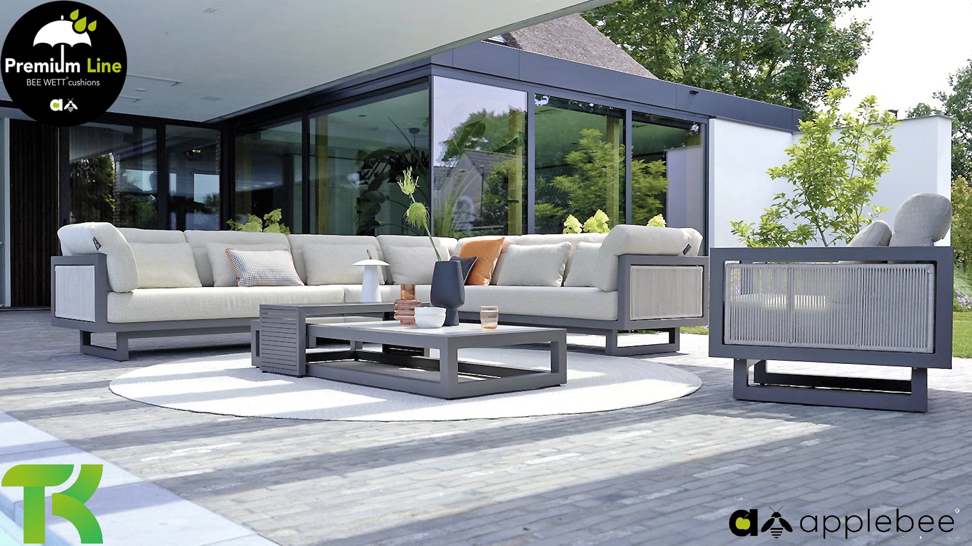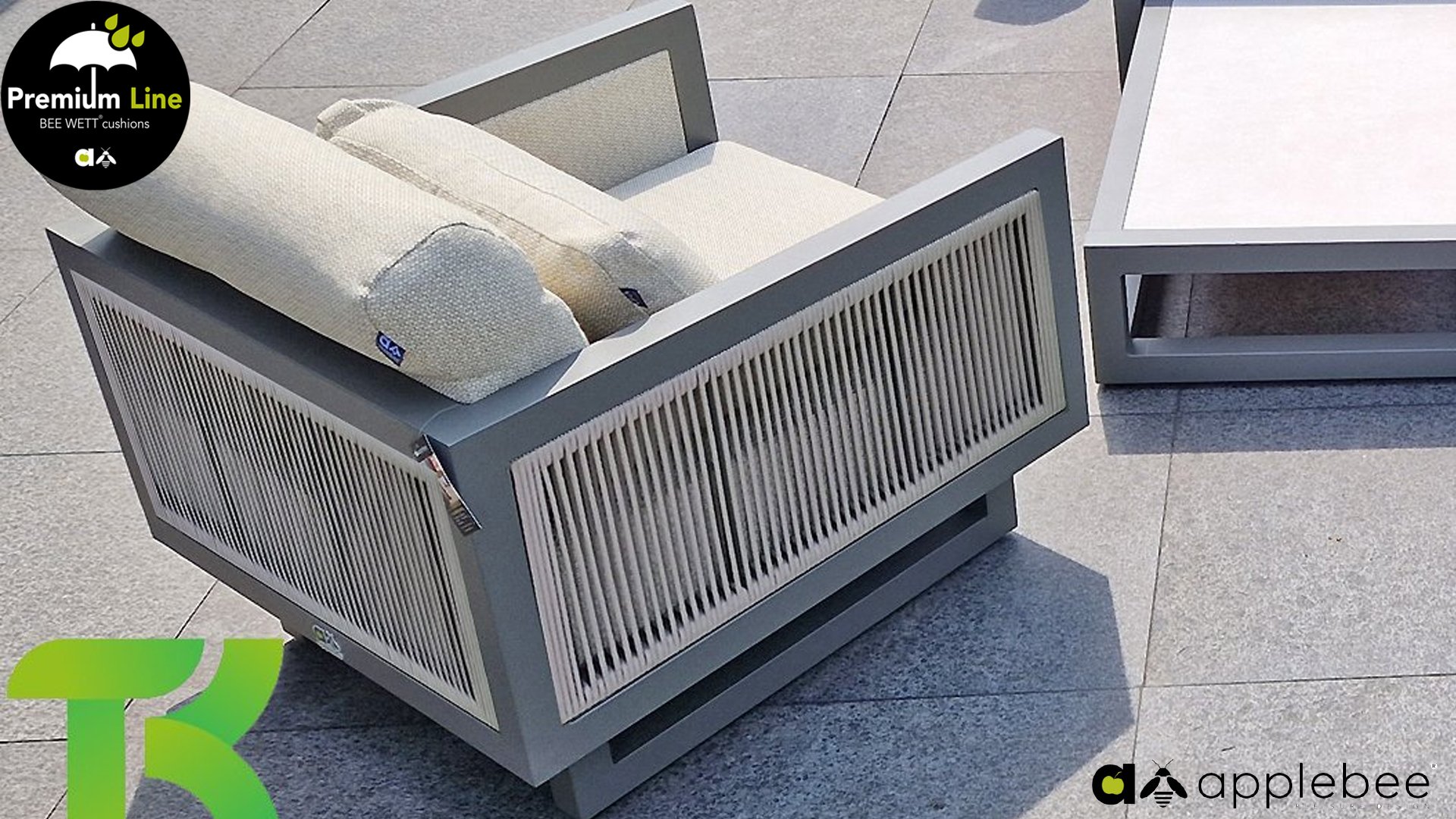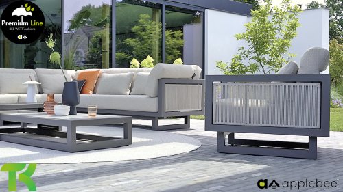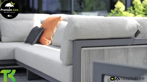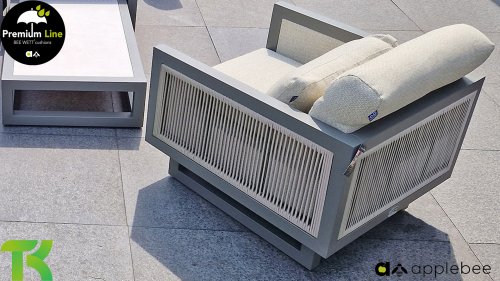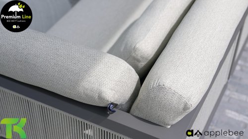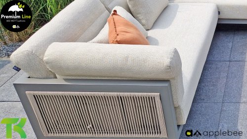 Apple Bee Santorini Lounge Rope: Wenn Sie eine elegante, kubistische Lounge-Garnitur lieben, aber dennoch Wert auf Individualität legen, dann ist die Santorini genau das Richtige für Sie! Ein schlankes, quadratisches Aluminiumrohrgestell, pulverbeschichtet in warmem Taupe. Diese Garnitur ist in zwei Ausführungen erhältlich. Der Unterschied liegt in den Paneelen an Armlehnen und Rückenlehne, die wie ein Gemälde vom Gestell eingerahmt werden. Bei der ersten Ausführung sind die Paneele mit einem wunderschönen, melierten Seil umwickelt. Dies verleiht der Garnitur eine luftige und zugleich moderne Optik. Die zweite Ausführung besticht durch gepolsterte Paneele im gleichen Stoff wie die Kissen und verleiht ihr so einen Hauch von Klasse und Luxus.