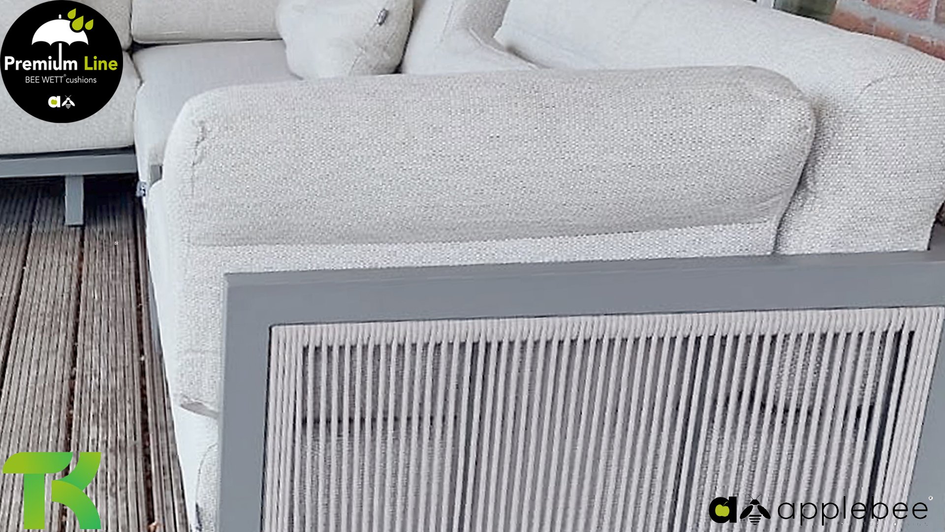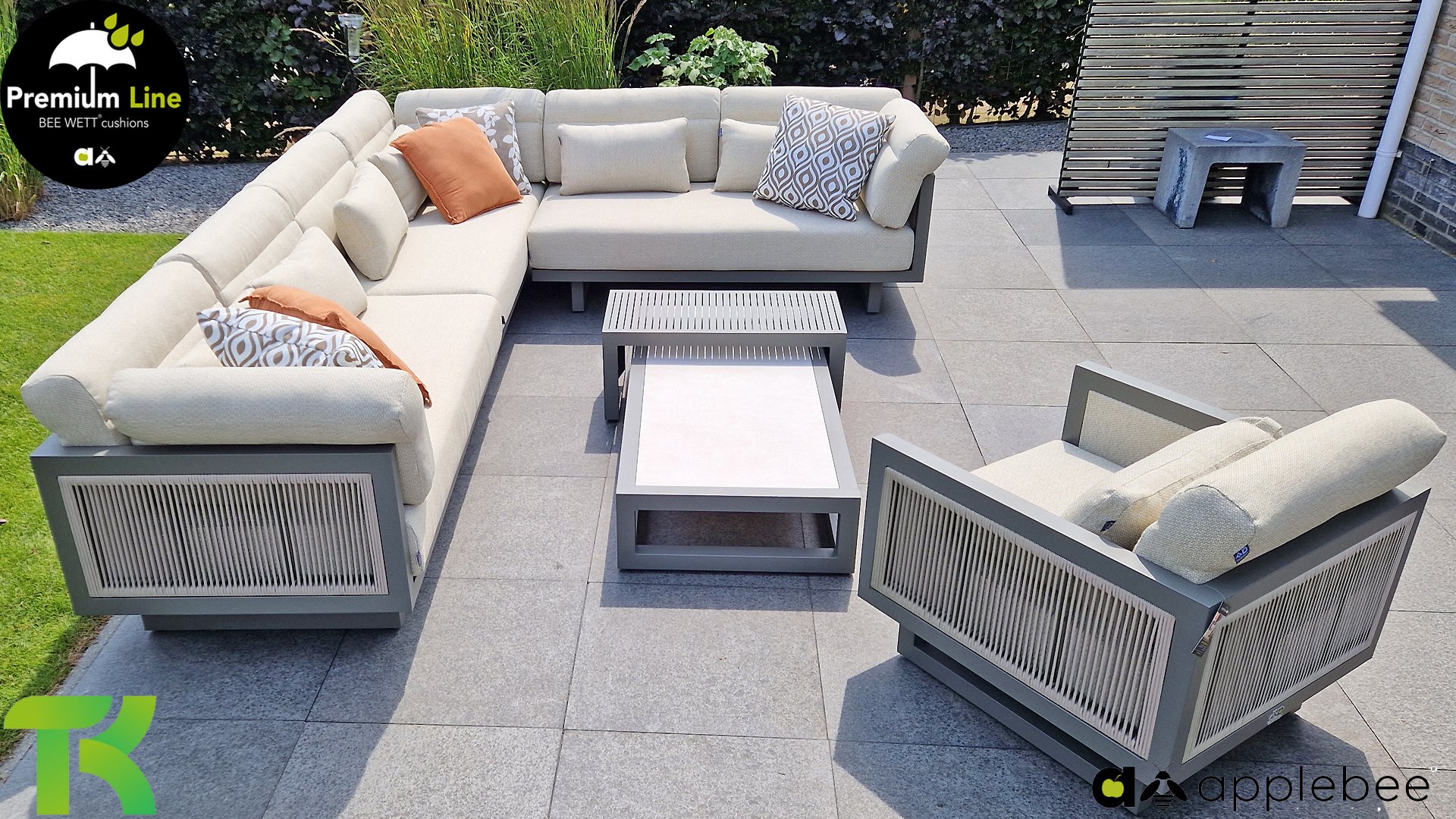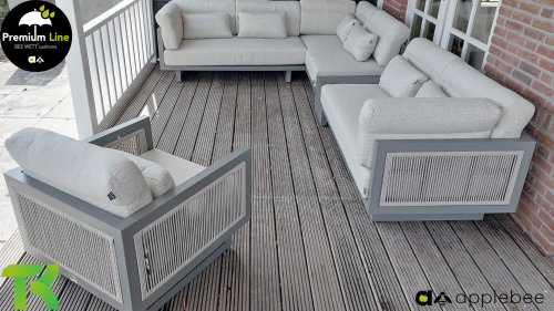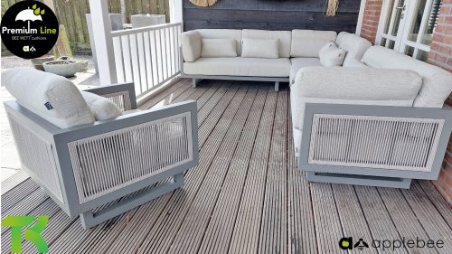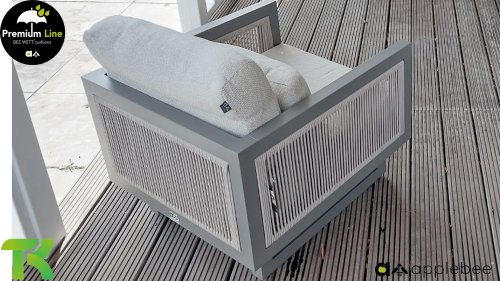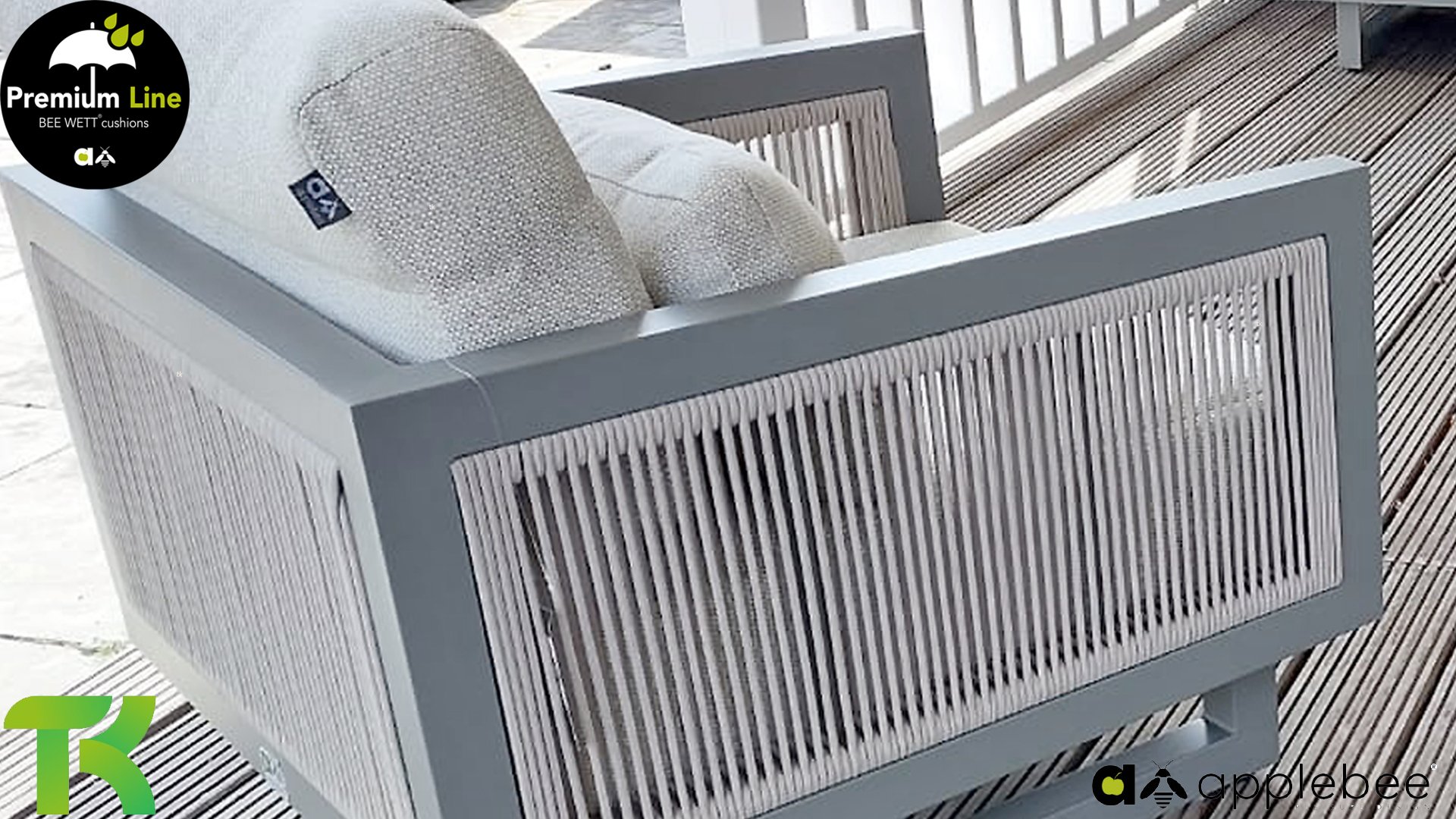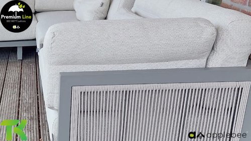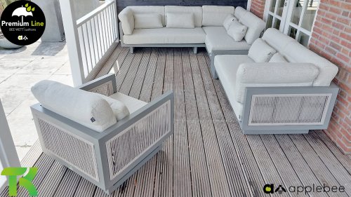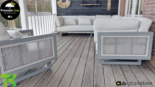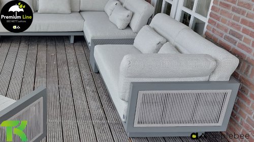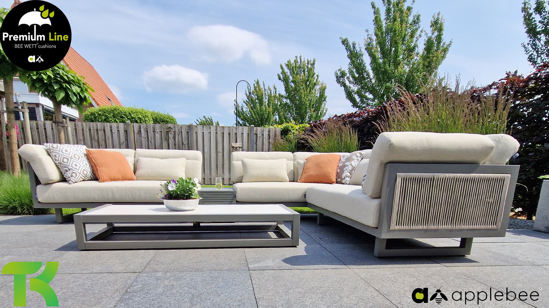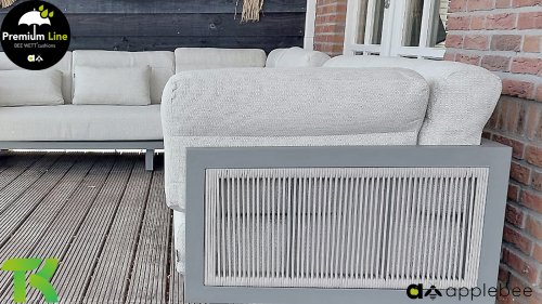 Apple Bee Santorini Lounge Rope: Wenn Sie ein elegantes und kubistisches Lounge-Set mögen, aber keine Kompromisse bei Launen eingehen wollen … schauen Sie hier, das Santorini! Ein schlanker Vierkantrohrrahmen aus Aluminium, pulverbeschichtet in warmem Taupe. Dieses Set ist in zwei Versionen erhältlich. Der Unterschied liegt in den Paneelen in den Armen und im Rücken, die wie ein Gemälde vom Rahmen eingerahmt zu sein scheinen. In der ersten Version ist das Panel mit einem schönen gemischten Seil umwickelt. Dadurch bleibt das Set luftig mit einem zeitgemäßen Look. Die andere Version hat gepolsterte Paneele im gleichen Stoff wie die Kissen. Das verleiht dem Set sofort mehr Klasse und Luxus. Die Arm- und Rückenkissen des Santorini sind etwas Besonderes und biegen sich leicht über die Armlehnen. Sie verleihen den ansonsten klaren Linien einen weichen Touch. Dadurch können Sie sich auch bequem hinlegen. Bequeme Lendenkissen sind im Lieferumfang des Santorini enthalten. So können Sie sich voll und ganz einleben und auch an kühleren Tagen ein gemütliches Plätzchen schaffen.