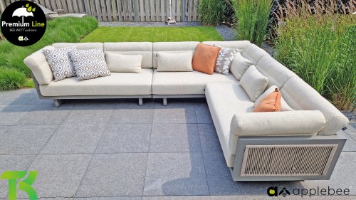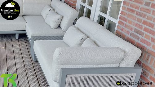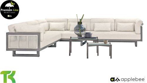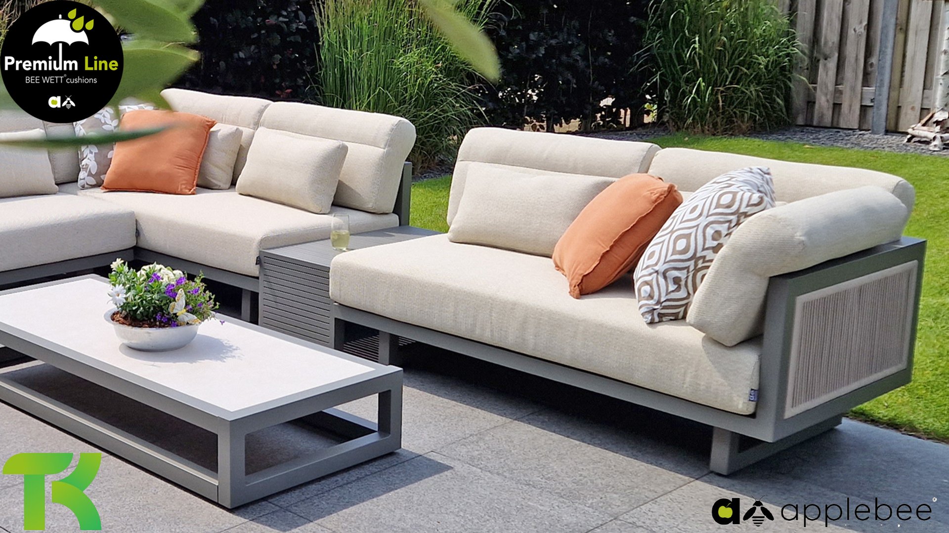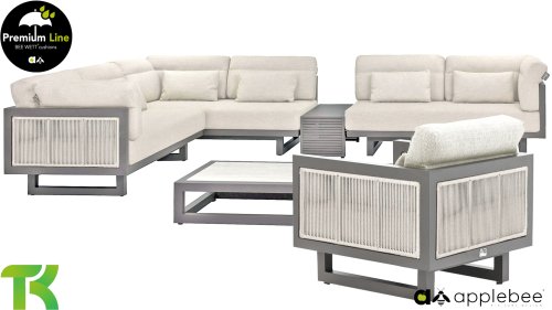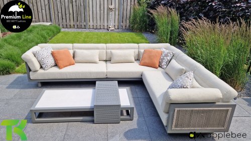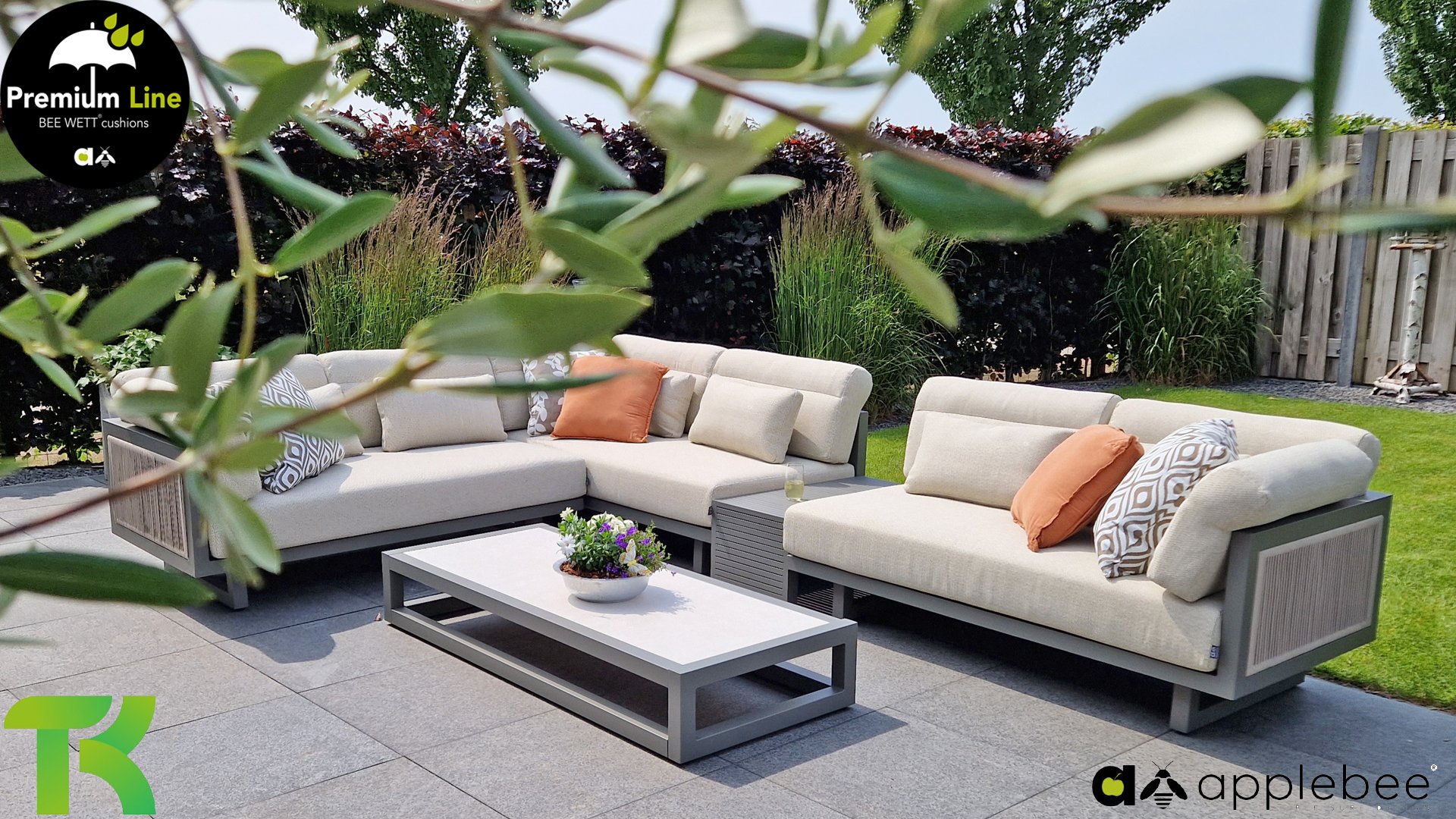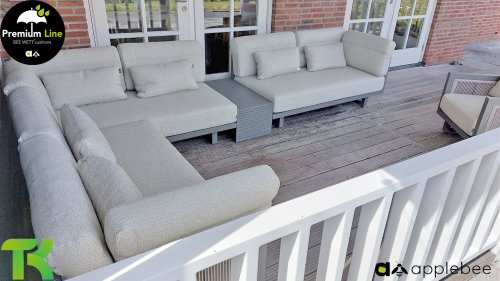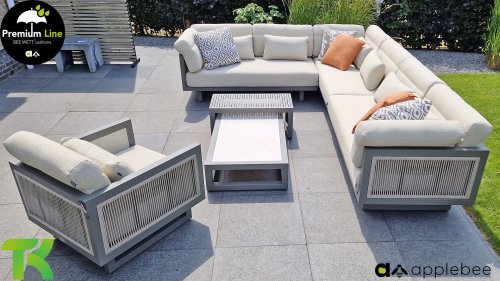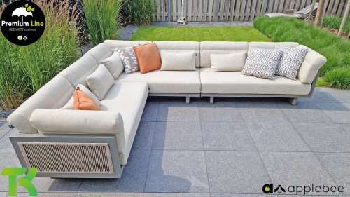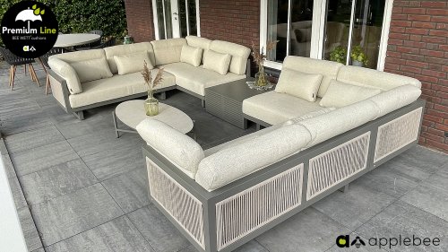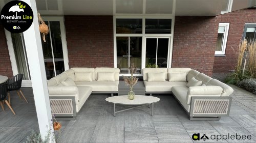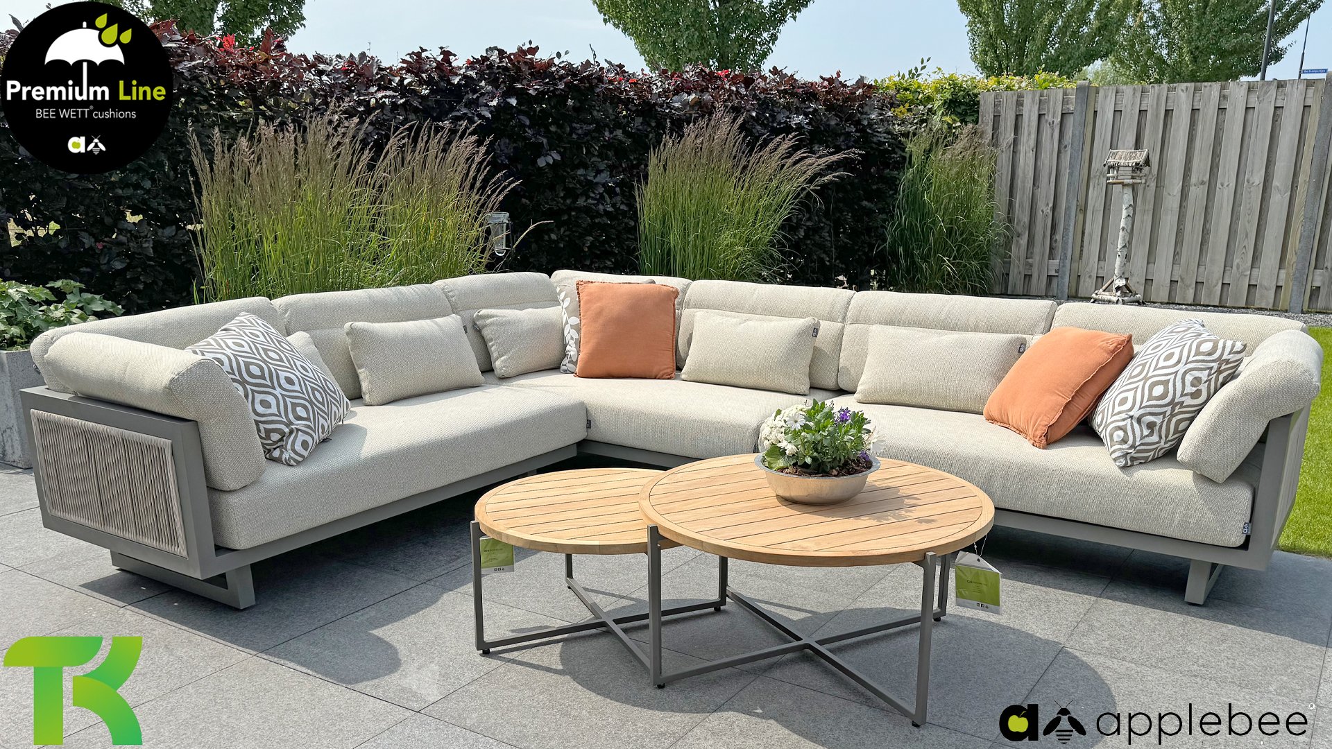 Apple Bee Santorini Lounge Rope: Wenn Sie ein elegantes und kubistisches Lounge-Set mögen, aber keine Kompromisse bei Launen eingehen wollen … schauen Sie hier, das Santorini! Ein schlanker Vierkantrohrrahmen aus Aluminium, pulverbeschichtet in warmem Taupe. Dieses Set ist in zwei Versionen erhältlich. Der Unterschied liegt in den Paneelen in den Armen und im Rücken, die wie ein Gemälde vom Rahmen eingerahmt zu sein scheinen. In der ersten Version ist das Panel mit einem schönen gemischten Seil umwickelt. Dadurch bleibt das Set luftig mit einem zeitgemäßen Look. Die andere Version hat gepolsterte Paneele im gleichen Stoff wie die Kissen. Das verleiht dem Set sofort mehr Klasse und Luxus. Die Arm- und Rückenkissen des Santorini sind etwas Besonderes und biegen sich leicht über die Armlehnen. Sie verleihen den ansonsten klaren Linien einen weichen Touch. Dadurch können Sie sich auch bequem hinlegen. Bequeme Lendenkissen sind im Lieferumfang des Santorini enthalten. So können Sie sich voll und ganz einleben und auch an kühleren Tagen ein gemütliches Plätzchen schaffen.