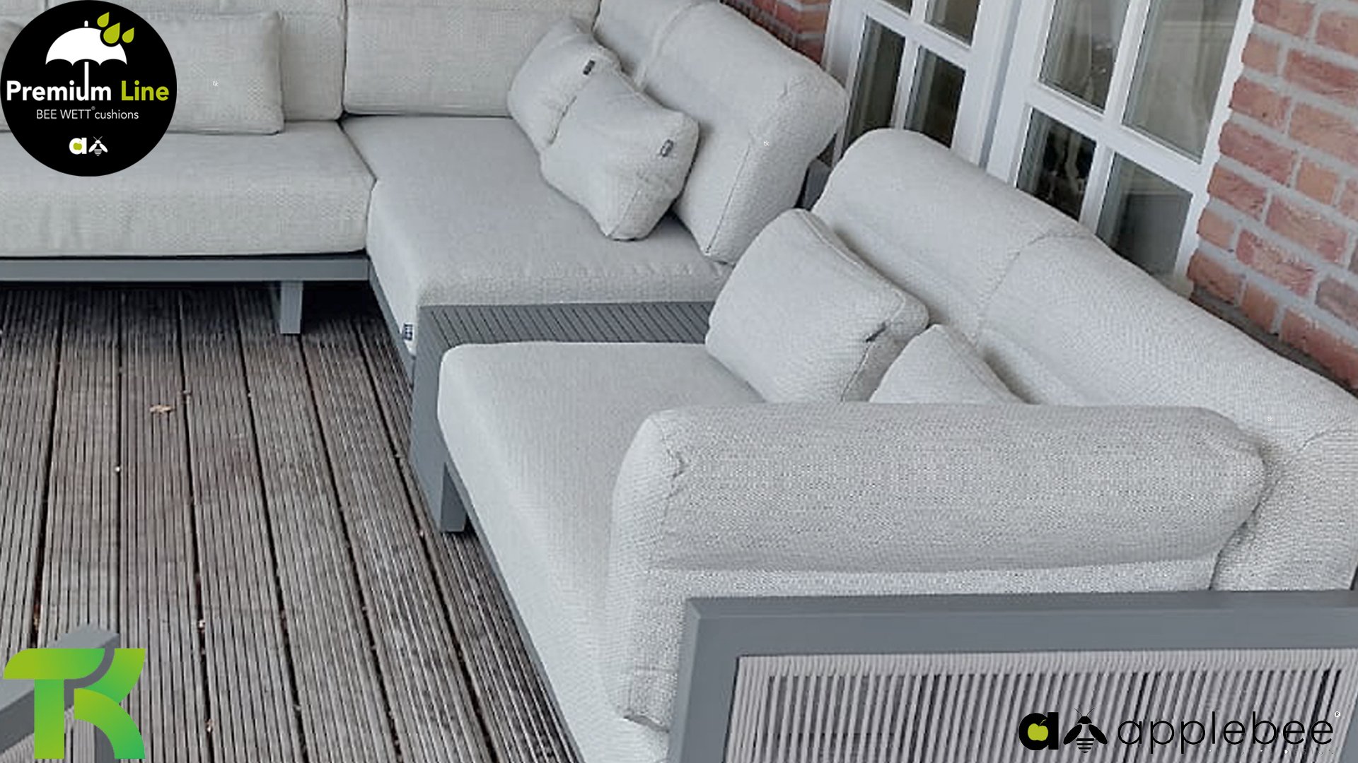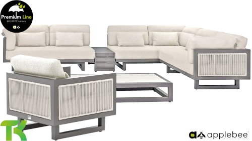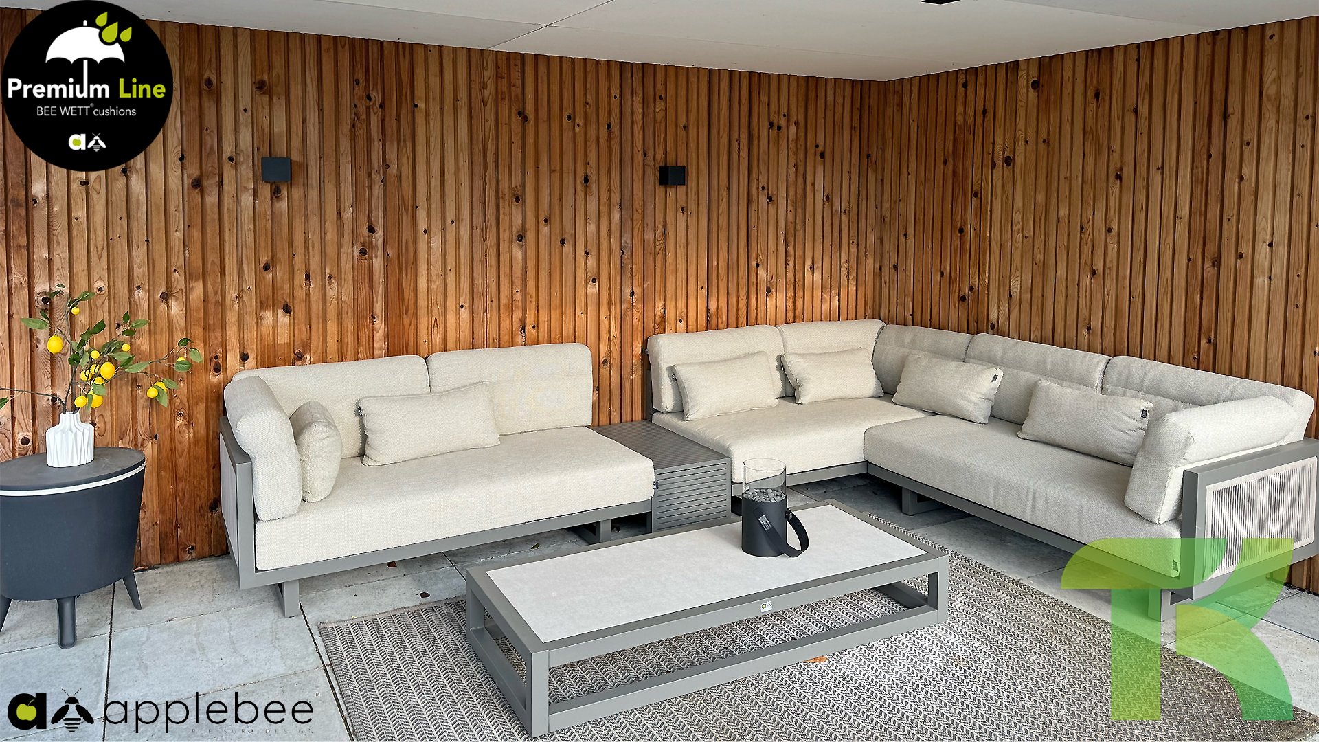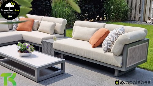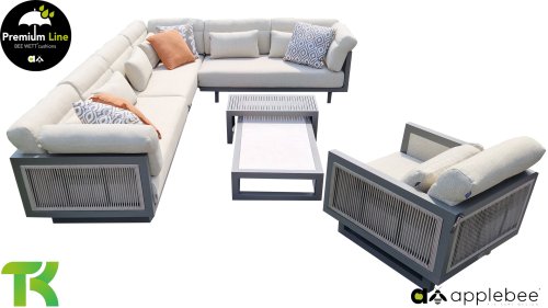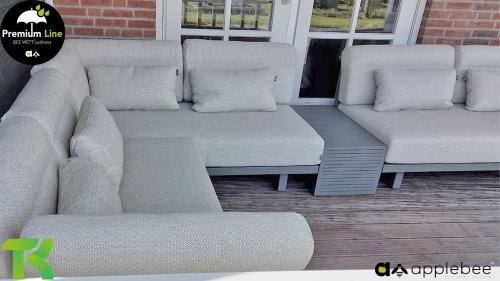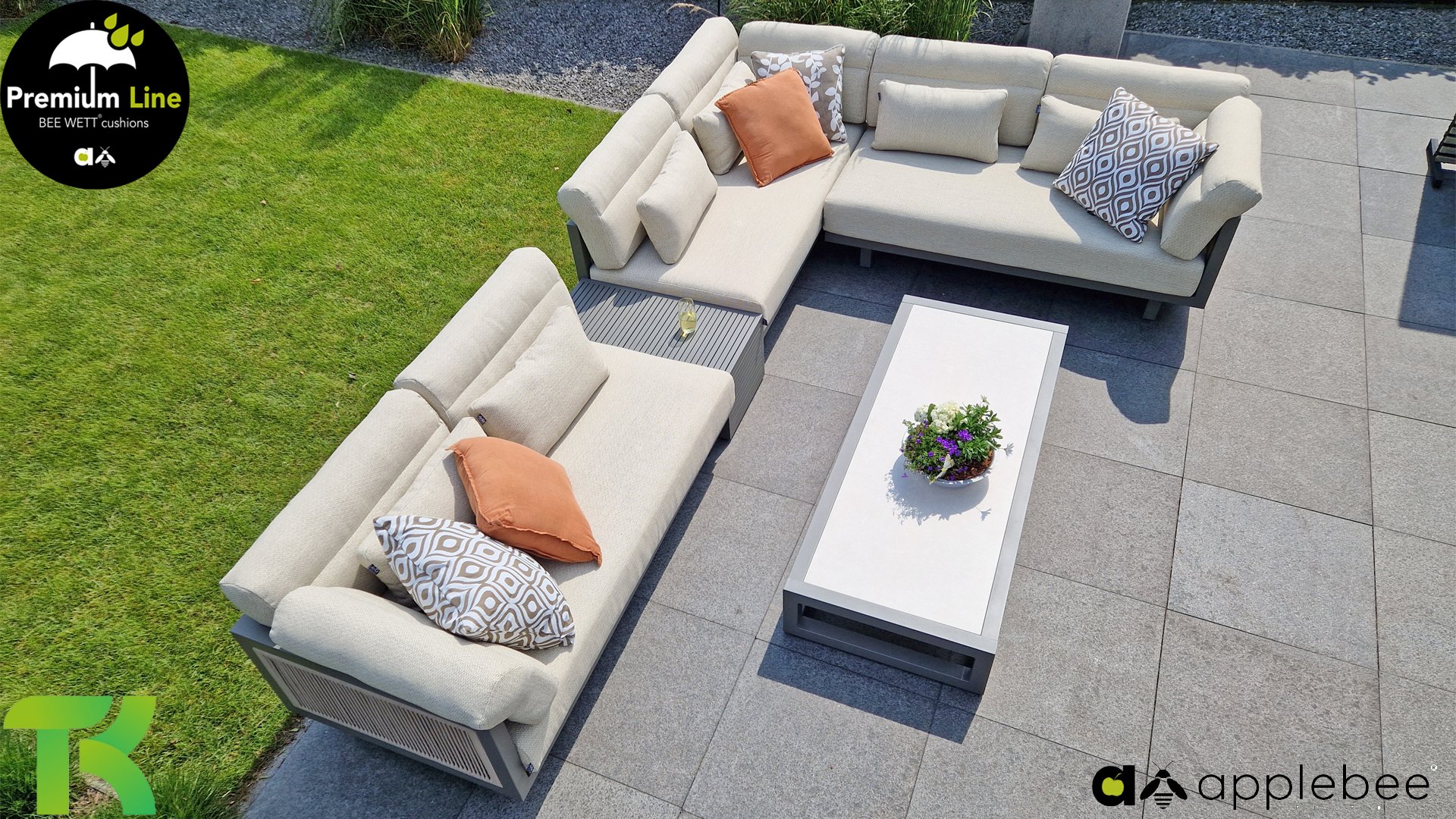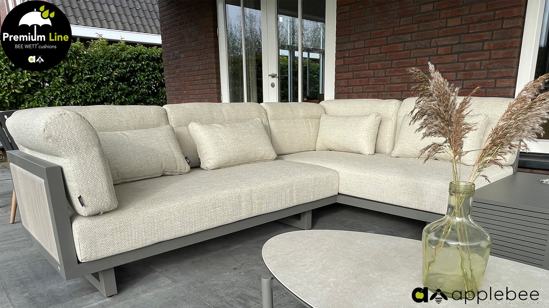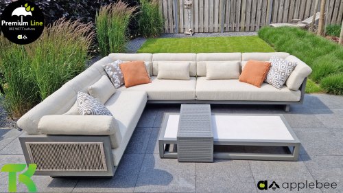 Apple Bee Santorini Lounge Rope: Wenn Sie ein elegantes und kubistisches Lounge-Set mögen, aber keine Kompromisse bei Launen eingehen wollen … schauen Sie hier, das Santorini! Ein schlanker Vierkantrohrrahmen aus Aluminium, pulverbeschichtet in warmem Taupe. Dieses Set ist in zwei Versionen erhältlich. Der Unterschied liegt in den Paneelen in den Armen und im Rücken, die wie ein Gemälde vom Rahmen eingerahmt zu sein scheinen. In der ersten Version ist das Panel mit einem schönen gemischten Seil umwickelt. Dadurch bleibt das Set luftig mit einem zeitgemäßen Look. Die andere Version hat gepolsterte Paneele im gleichen Stoff wie die Kissen. Das verleiht dem Set sofort mehr Klasse und Luxus. Die Arm- und Rückenkissen des Santorini sind etwas Besonderes und biegen sich leicht über die Armlehnen. Sie verleihen den ansonsten klaren Linien einen weichen Touch. Dadurch können Sie sich auch bequem hinlegen. Bequeme Lendenkissen sind im Lieferumfang des Santorini enthalten. So können Sie sich voll und ganz einleben und auch an kühleren Tagen ein gemütliches Plätzchen schaffen.