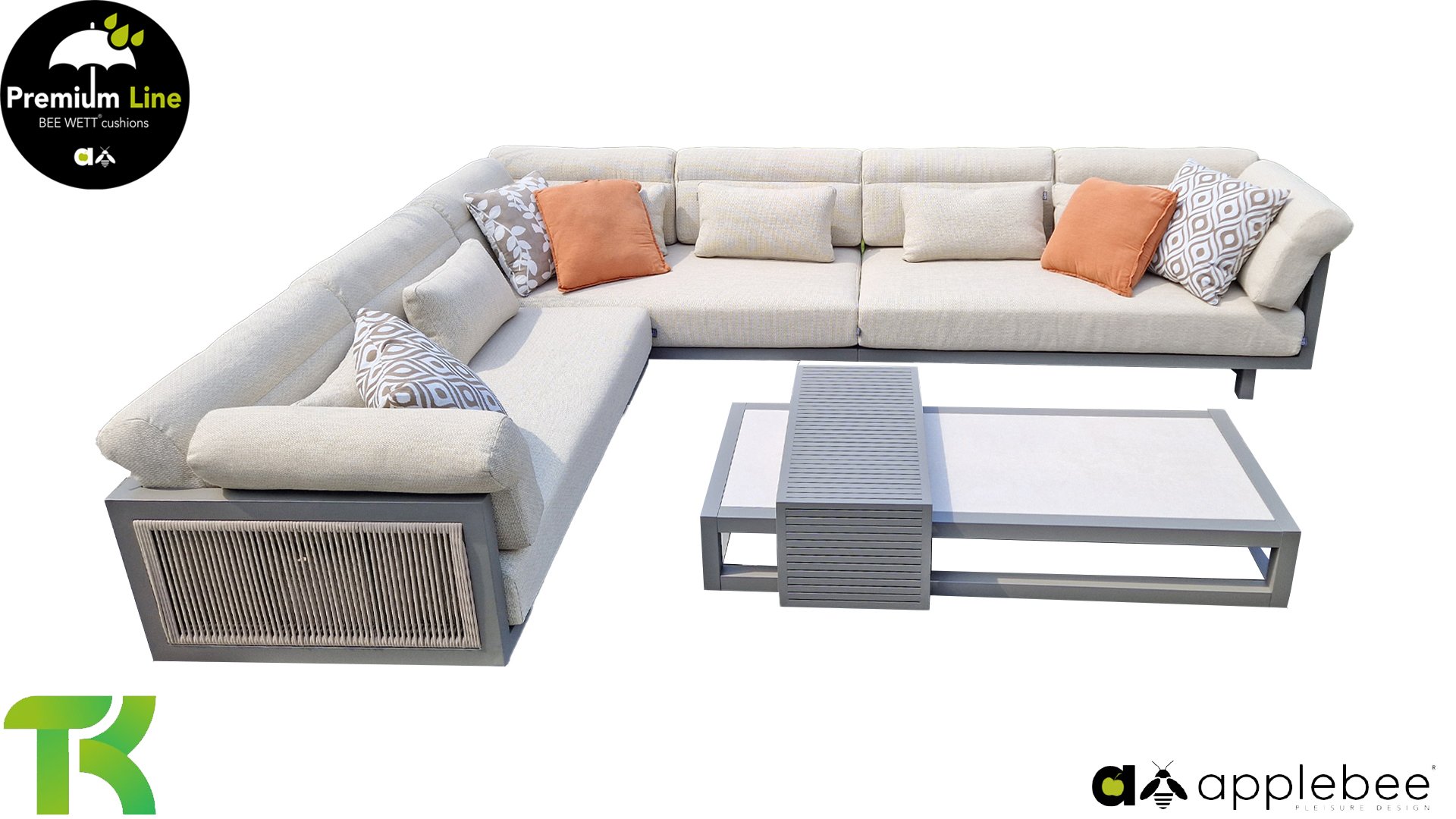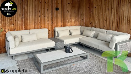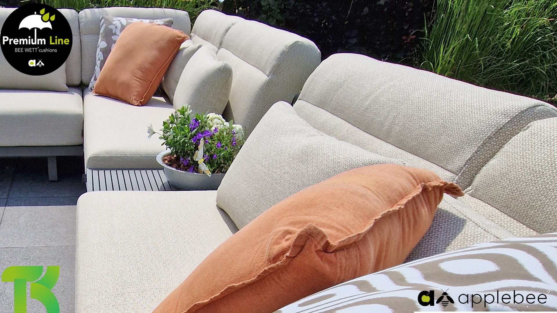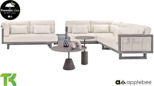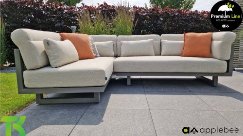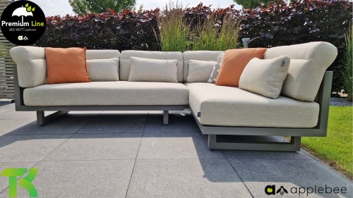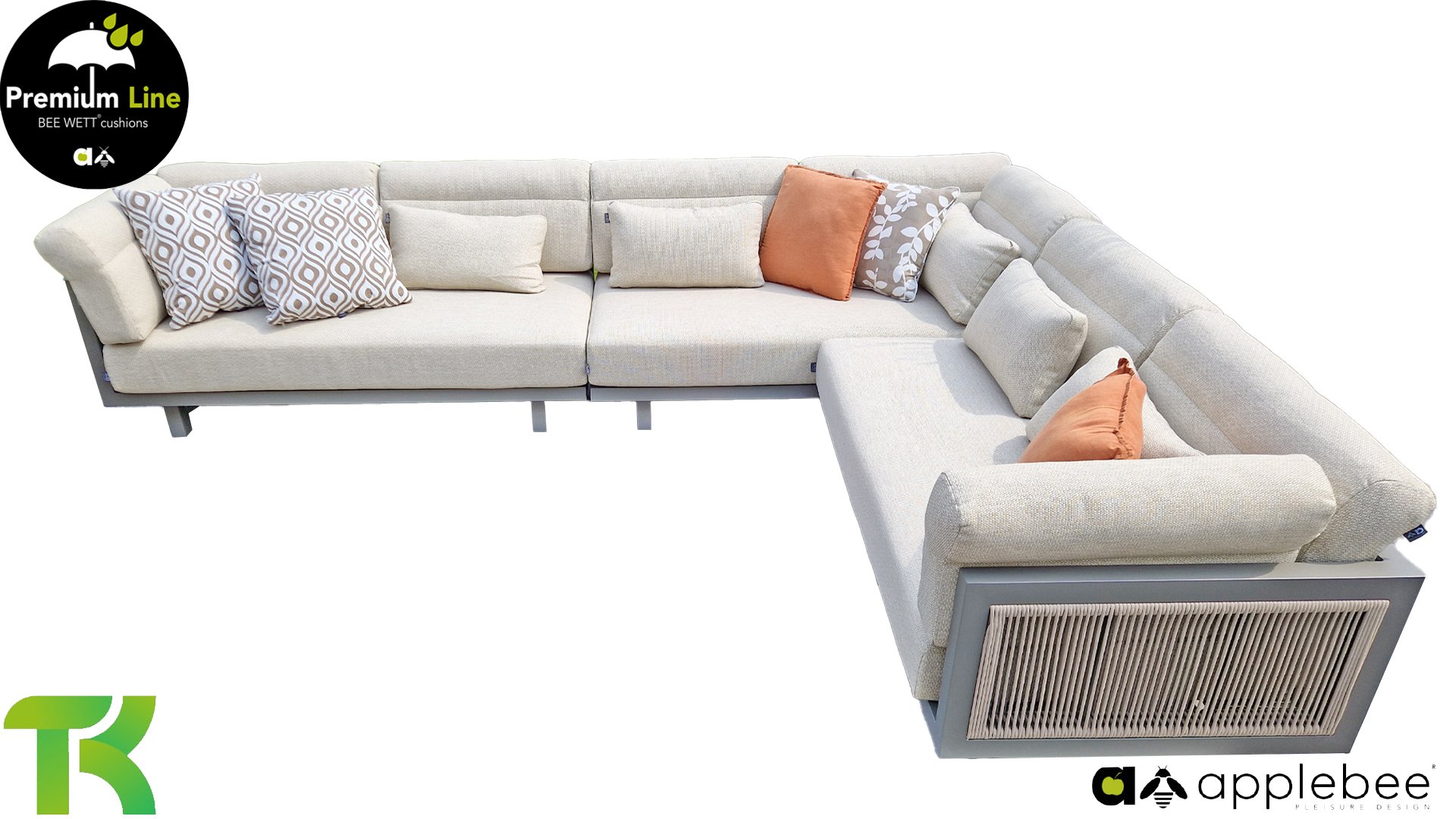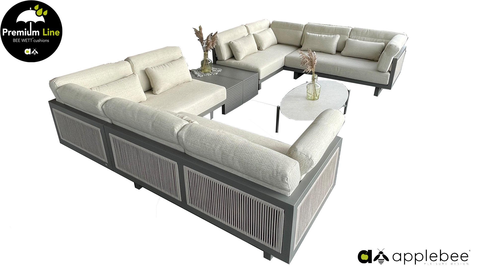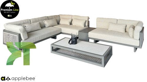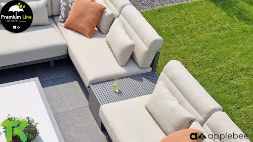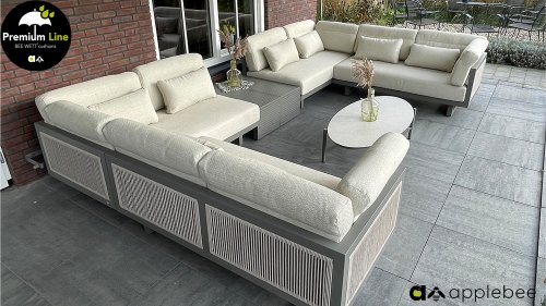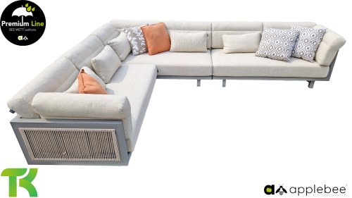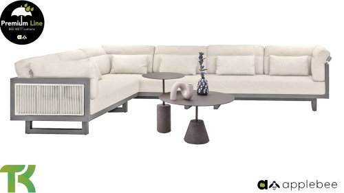Apple Bee Santorini Lounge Rope: Wenn Sie ein elegantes und kubistisches Lounge-Set mögen, aber keine Kompromisse bei Launen eingehen wollen … schauen Sie hier, das Santorini! Ein schlanker Vierkantrohrrahmen aus Aluminium, pulverbeschichtet in warmem Taupe. Dieses Set ist in zwei Versionen erhältlich. Der Unterschied liegt in den Paneelen in den Armen und im Rücken, die wie ein Gemälde vom Rahmen eingerahmt zu sein scheinen. In der ersten Version ist das Panel mit einem schönen gemischten Seil umwickelt. Dadurch bleibt das Set luftig mit einem zeitgemäßen Look. Die andere Version hat gepolsterte Paneele im gleichen Stoff wie die Kissen. Das verleiht dem Set sofort mehr Klasse und Luxus. Die Arm- und Rückenkissen des Santorini sind etwas Besonderes und biegen sich leicht über die Armlehnen. Sie verleihen den ansonsten klaren Linien einen weichen Touch. Dadurch können Sie sich auch bequem hinlegen. Bequeme Lendenkissen sind im Lieferumfang des Santorini enthalten. So können Sie sich voll und ganz einleben und auch an kühleren Tagen ein gemütliches Plätzchen schaffen.