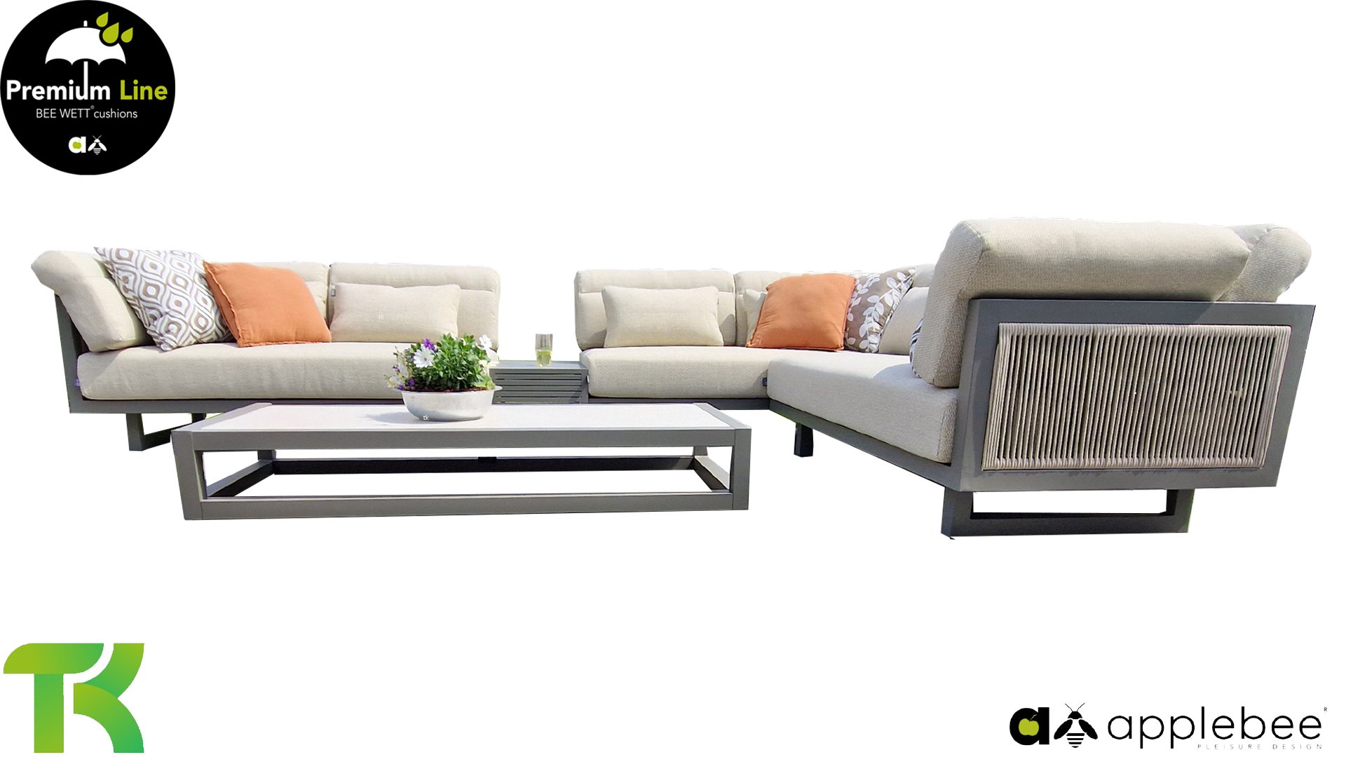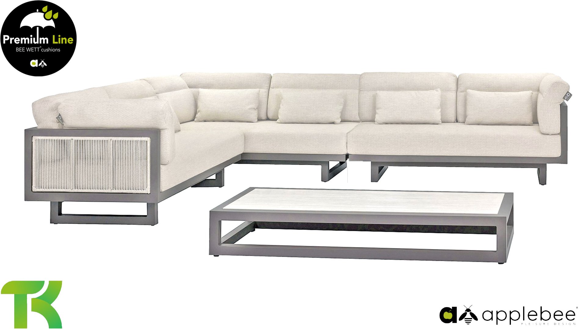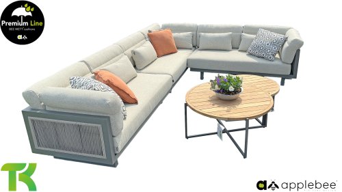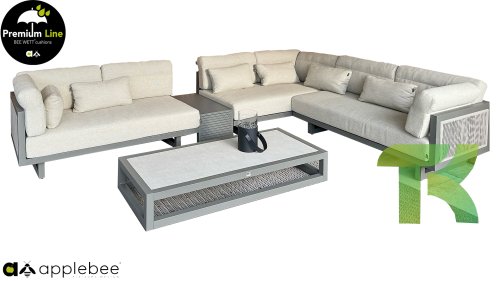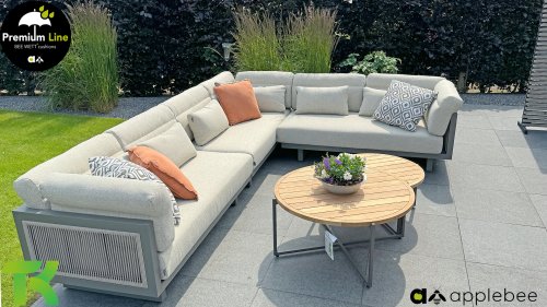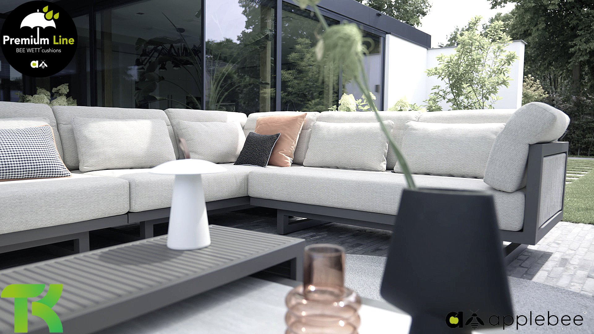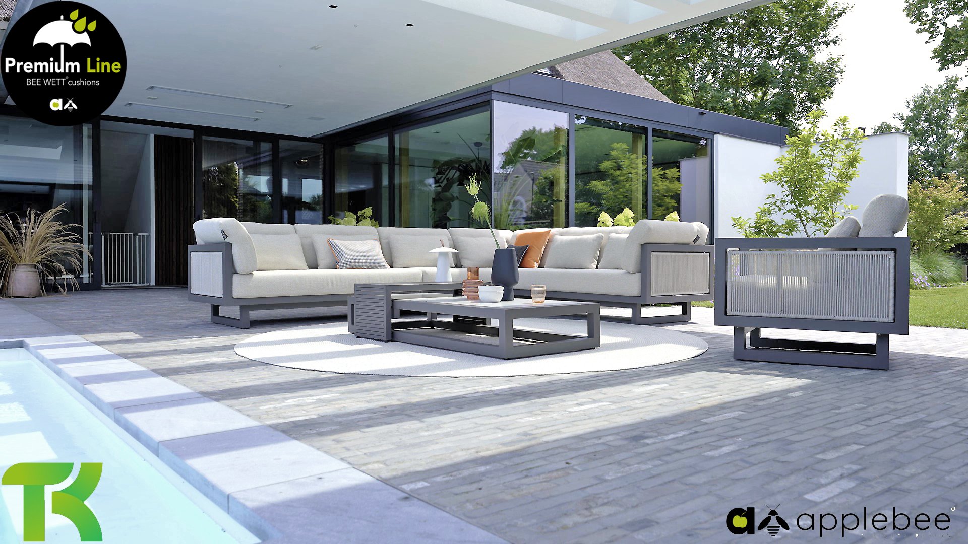 Apple Bee Santorini Lounge Rope: Wenn Sie ein elegantes und kubistisches Lounge-Set mögen, aber keine Kompromisse bei Launen eingehen wollen … schauen Sie hier, das Santorini! Ein schlanker Vierkantrohrrahmen aus Aluminium, pulverbeschichtet in warmem Taupe. Dieses Set ist in zwei Versionen erhältlich. Der Unterschied liegt in den Paneelen in den Armen und im Rücken, die wie ein Gemälde vom Rahmen eingerahmt zu sein scheinen. In der ersten Version ist das Panel mit einem schönen gemischten Seil umwickelt. Dadurch bleibt das Set luftig mit einem zeitgemäßen Look. Die andere Version hat gepolsterte Paneele im gleichen Stoff wie die Kissen. Das verleiht dem Set sofort mehr Klasse und Luxus. Die Arm- und Rückenkissen des Santorini sind etwas Besonderes und biegen sich leicht über die Armlehnen. Sie verleihen den ansonsten klaren Linien einen weichen Touch. Dadurch können Sie sich auch bequem hinlegen. Bequeme Lendenkissen sind im Lieferumfang des Santorini enthalten. So können Sie sich voll und ganz einleben und auch an kühleren Tagen ein gemütliches Plätzchen schaffen.