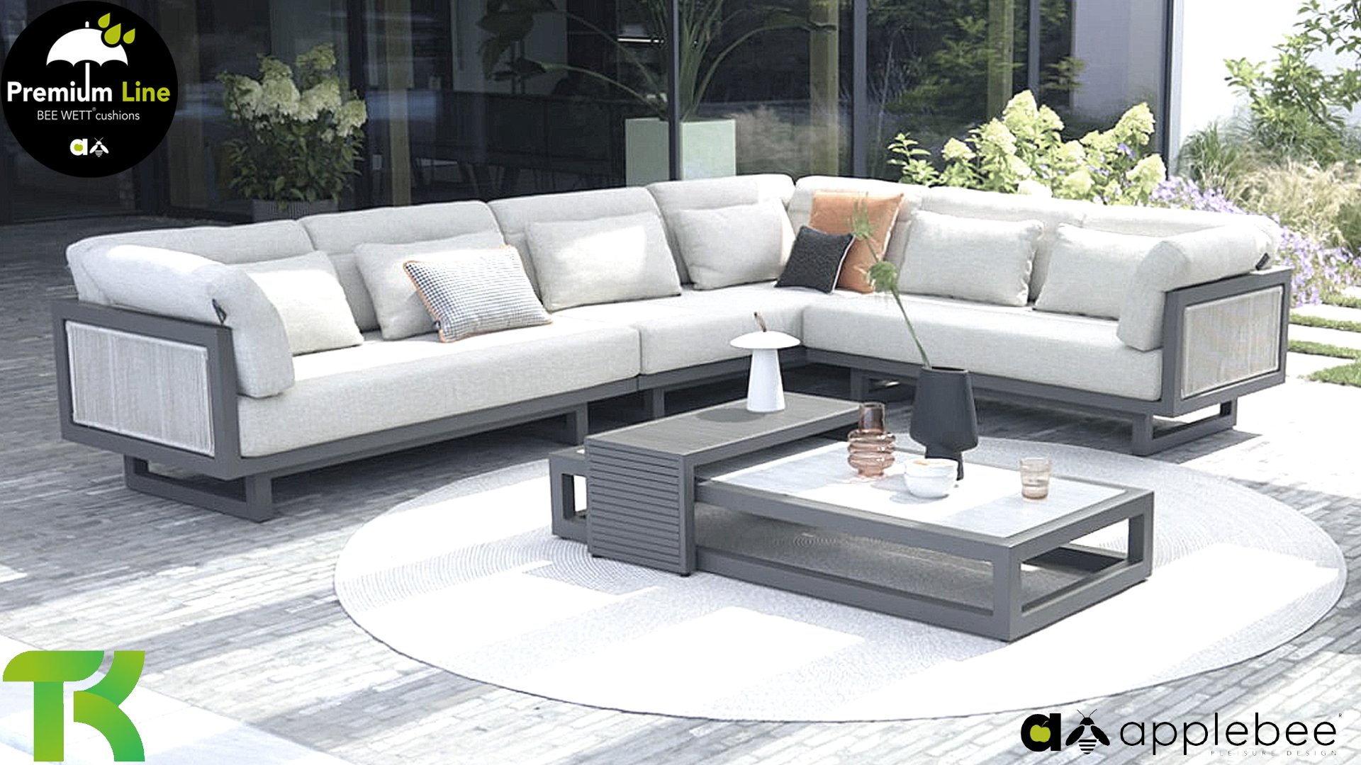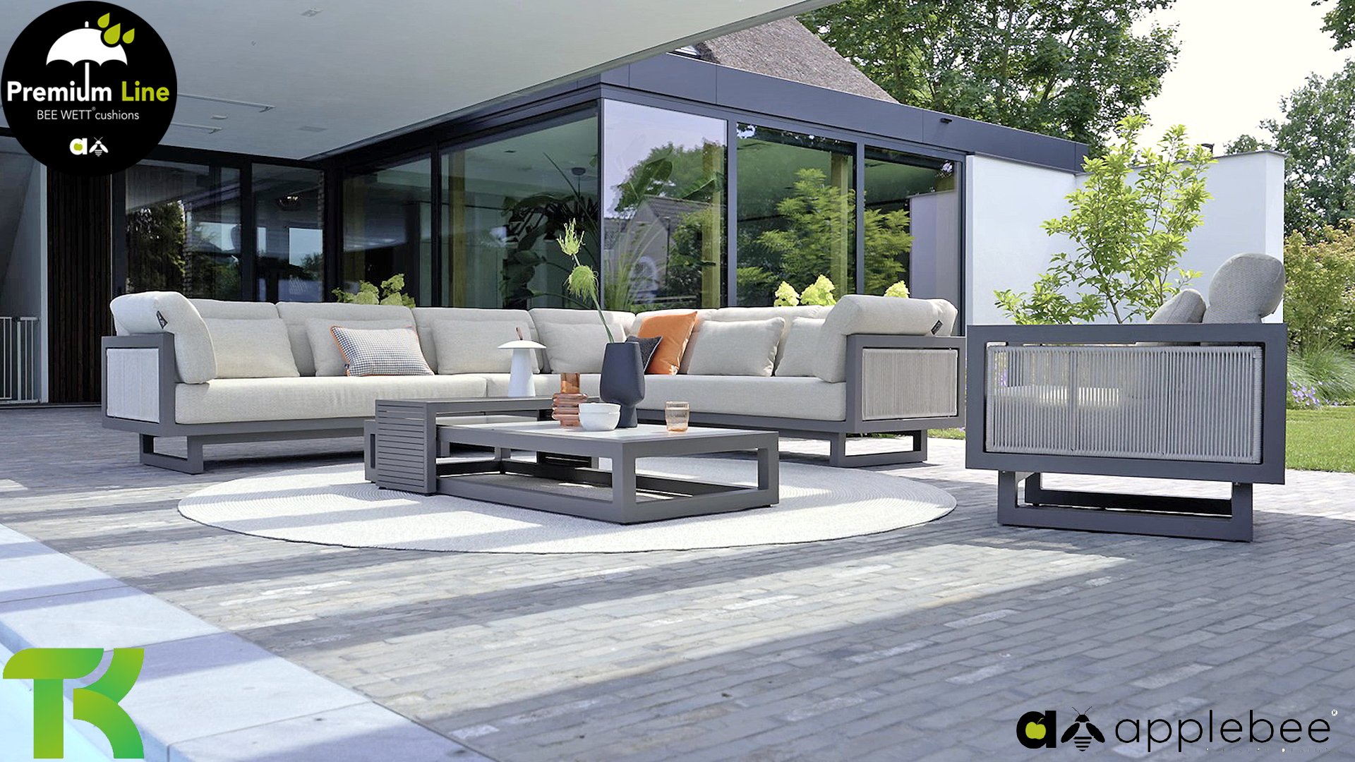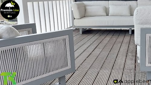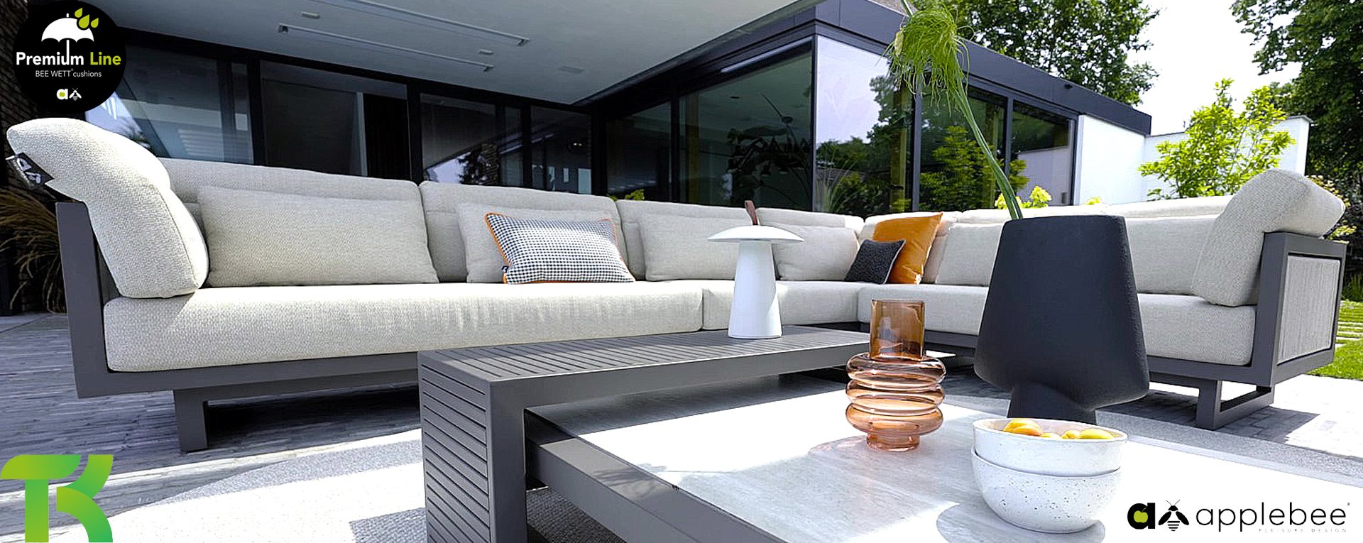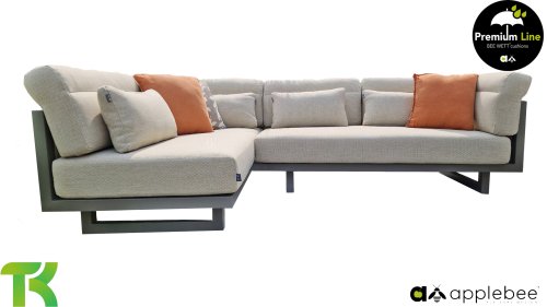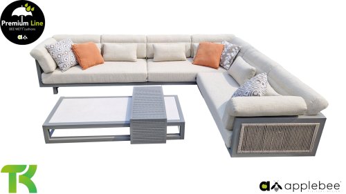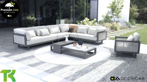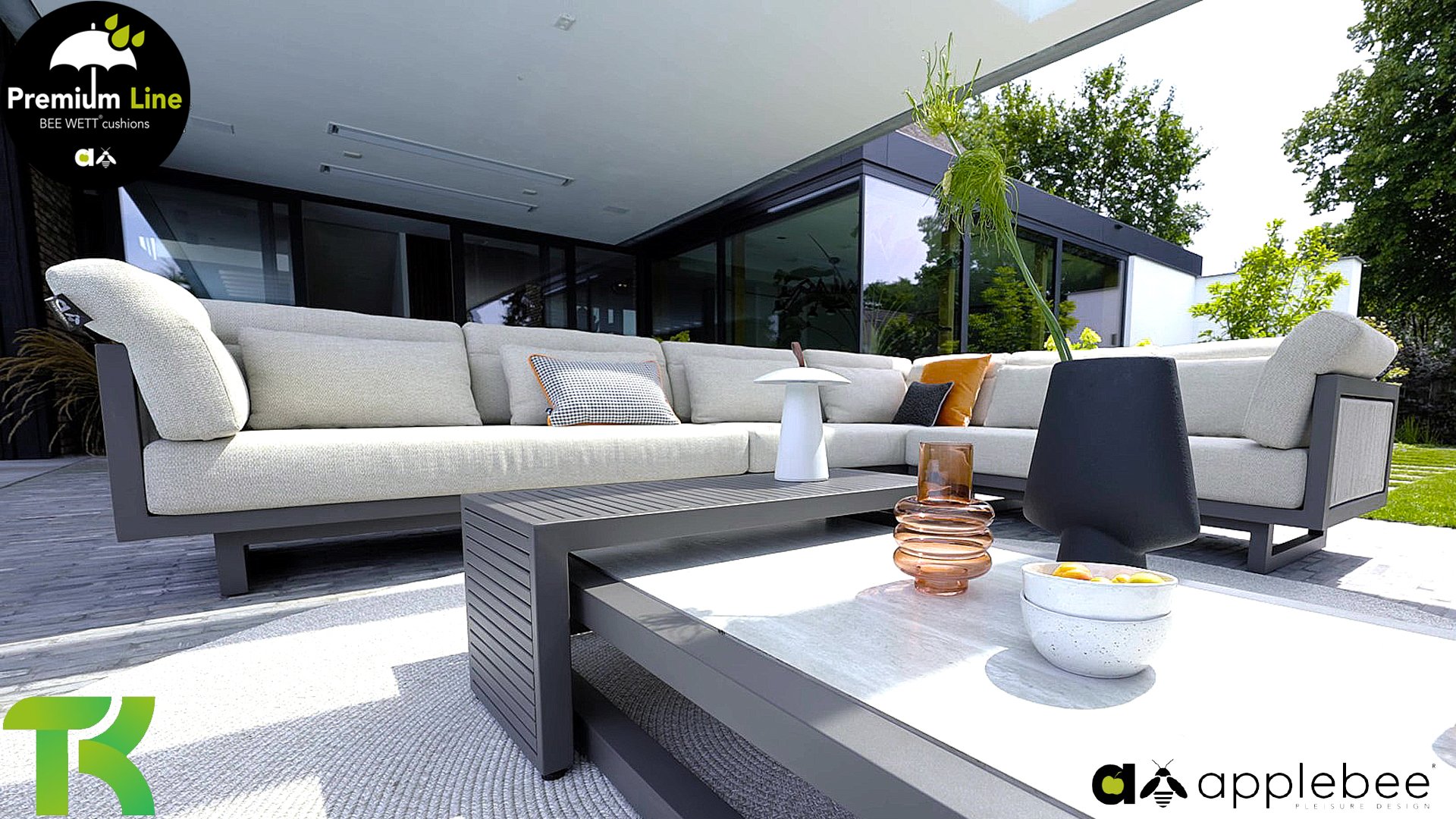Apple Bee Santorini Lounge Rope: Wenn Sie ein elegantes und kubistisches Lounge-Set mögen, aber keine Kompromisse bei Launen eingehen wollen … schauen Sie hier, das Santorini! Ein schlanker Vierkantrohrrahmen aus Aluminium, pulverbeschichtet in warmem Taupe. Dieses Set ist in zwei Versionen erhältlich. Der Unterschied liegt in den Paneelen in den Armen und im Rücken, die wie ein Gemälde vom Rahmen eingerahmt zu sein scheinen. In der ersten Version ist das Panel mit einem schönen gemischten Seil umwickelt. Dadurch bleibt das Set luftig mit einem zeitgemäßen Look. Die andere Version hat gepolsterte Paneele im gleichen Stoff wie die Kissen. Das verleiht dem Set sofort mehr Klasse und Luxus. Die Arm- und Rückenkissen des Santorini sind etwas Besonderes und biegen sich leicht über die Armlehnen. Sie verleihen den ansonsten klaren Linien einen weichen Touch. Dadurch können Sie sich auch bequem hinlegen. Bequeme Lendenkissen sind im Lieferumfang des Santorini enthalten. So können Sie sich voll und ganz einleben und auch an kühleren Tagen ein gemütliches Plätzchen schaffen.