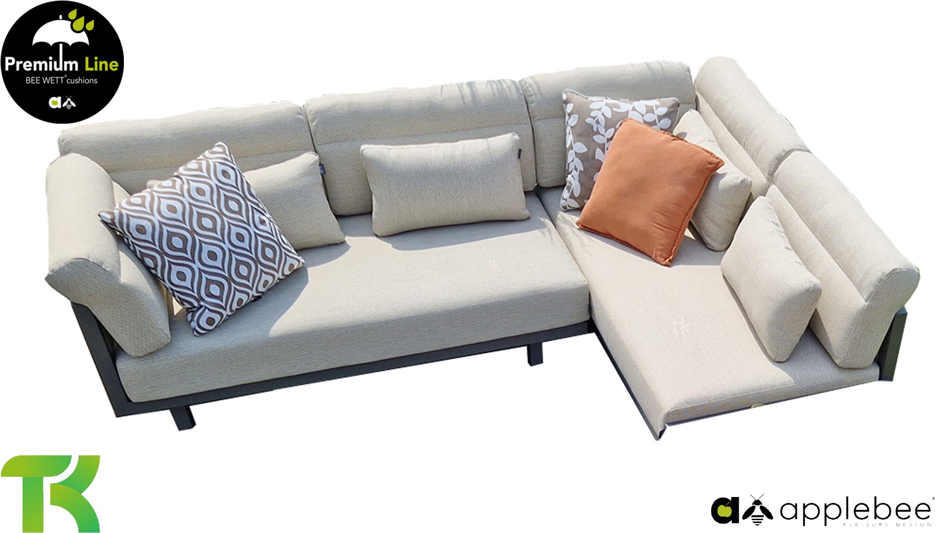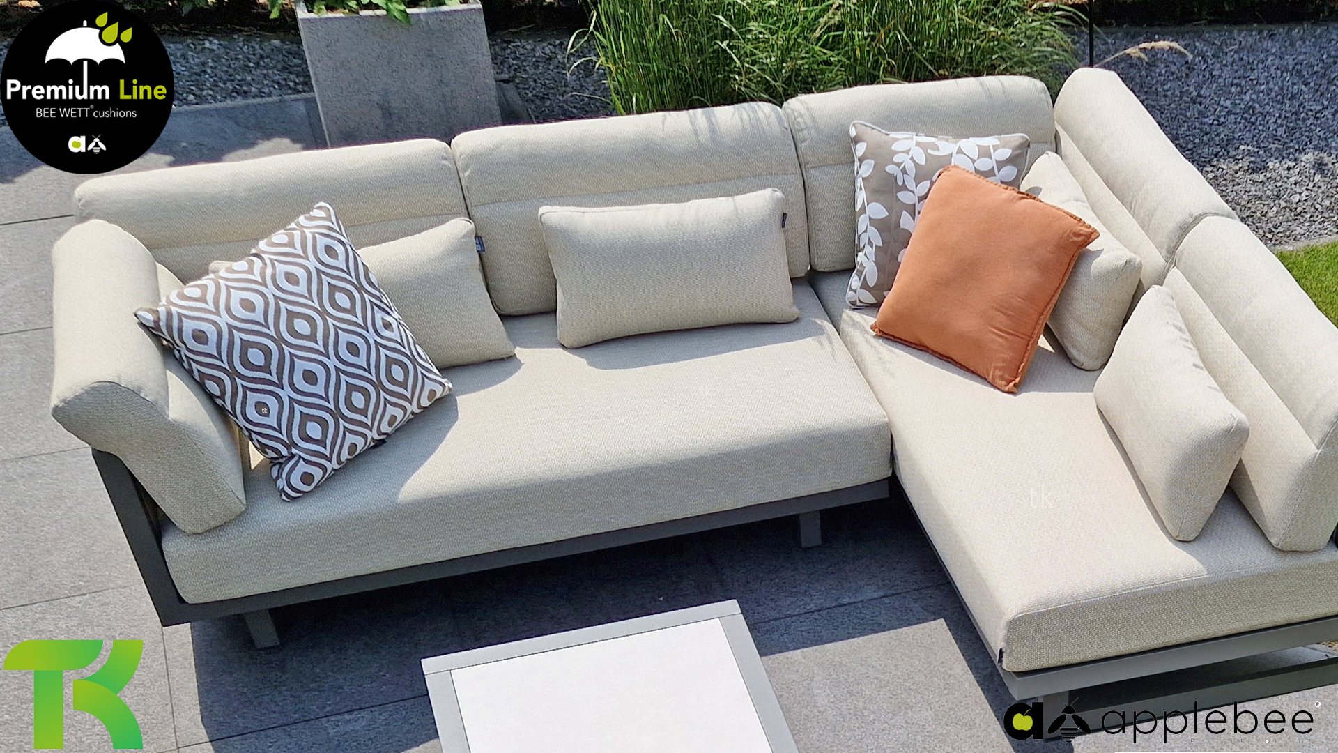 AppleBee Bee Wett sind spezielle wetterfeste Kissen die natürlich draußen liegen bleiben können. Die abnehmbaren Hüllen werden aus den besten möglichen Stoffen hergestellt und sind alle waschbar auf 30°C. Der Stoff ist zusätzlich wasserabstoßend  und garantiert UV-beständig. Eine offenes Gewebe an der Unterseite der Kissen sorgt für eine perfekte Drainage. Der Vorteil, dass die Bee Wett Kissen und Polster unglaublich viel schneller trocknen als vergleichbare andere Kissen. Das Stoff hat eine gute Beständigkeit gegen Verfaulen und Stockflecken und darüber hinaus UV-beständig, weich, komfortabel und feuchtigkeitsabstoßend ist. Die Polster sind ausziehbar und waschbar.