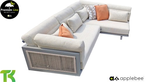 Apple Bee Santorini Lounge Rope: Wenn Sie eine elegante, kubistische Lounge-Garnitur lieben, aber dennoch Wert auf Individualität legen, dann ist die Santorini genau das Richtige für Sie! Ein schlankes, quadratisches Aluminiumrohrgestell, pulverbeschichtet in warmem Taupe. Diese Garnitur ist in zwei Ausführungen erhältlich. Der Unterschied liegt in den Paneelen an Armlehnen und Rückenlehne, die wie ein Gemälde vom Gestell eingerahmt werden. Bei der ersten Ausführung sind die Paneele mit einem wunderschönen, melierten Seil umwickelt. Dies verleiht der Garnitur eine luftige und zugleich moderne Optik. Die zweite Ausführung besticht durch gepolsterte Paneele im gleichen Stoff wie die Kissen und verleiht ihr so ​​einen Hauch von Klasse und Luxus.