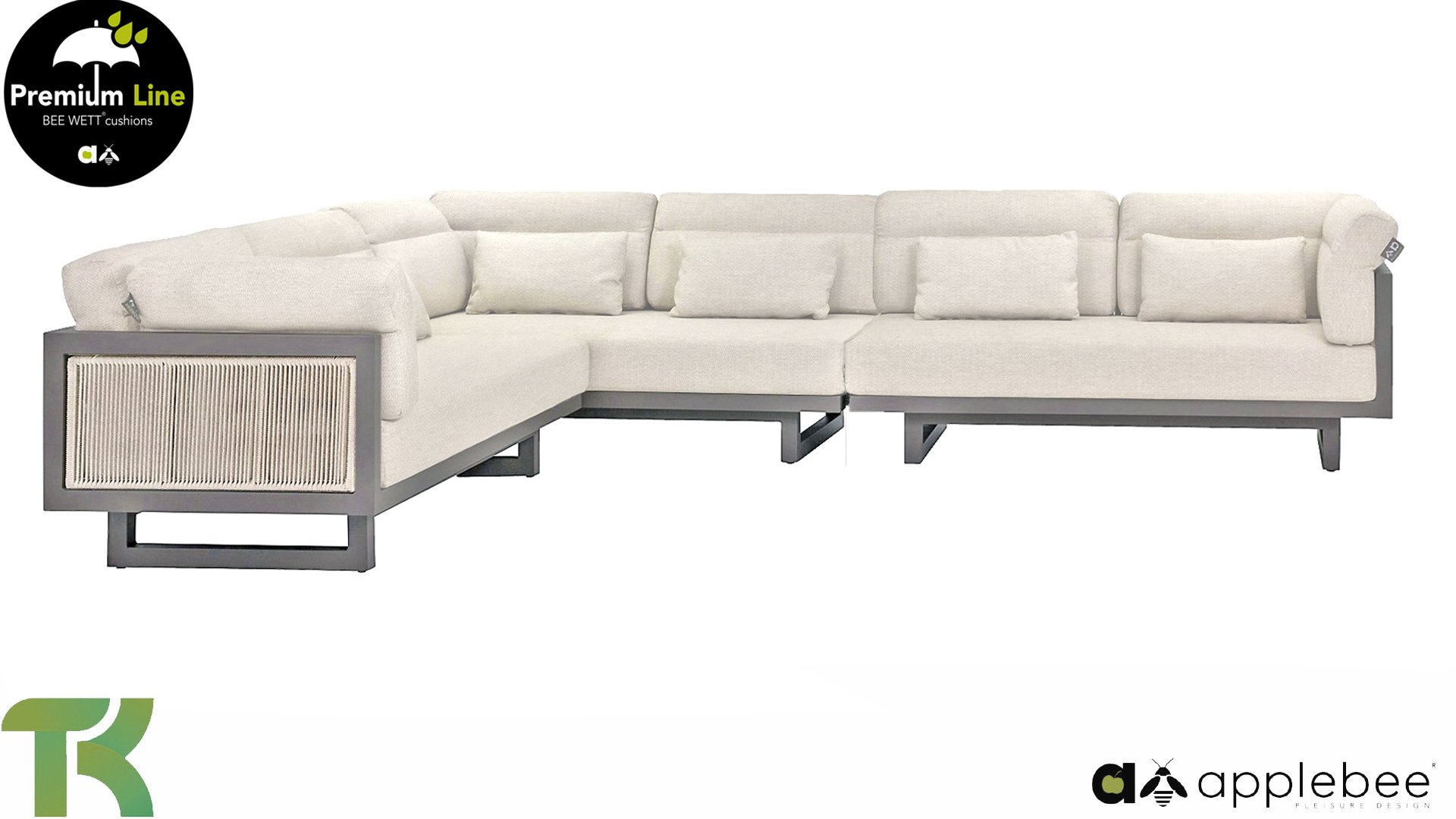Apple Bee Santorini Lounge Rope: Wenn Sie eine elegante, kubistische Lounge-Garnitur lieben, aber dennoch Wert auf Individualität legen, dann ist die Santorini genau das Richtige für Sie! Ein schlankes, quadratisches Aluminiumrohrgestell, pulverbeschichtet in warmem Taupe. Diese Garnitur ist in zwei Ausführungen erhältlich. Der Unterschied liegt in den Paneelen an Armlehnen und Rückenlehne, die wie ein Gemälde vom Gestell eingerahmt werden. Bei der ersten Ausführung sind die Paneele mit einem wunderschönen, melierten Seil umwickelt. Dies verleiht der Garnitur eine luftige und zugleich moderne Optik. Die zweite Ausführung besticht durch gepolsterte Paneele im gleichen Stoff wie die Kissen und verleiht ihr so einen Hauch von Klasse und Luxus.