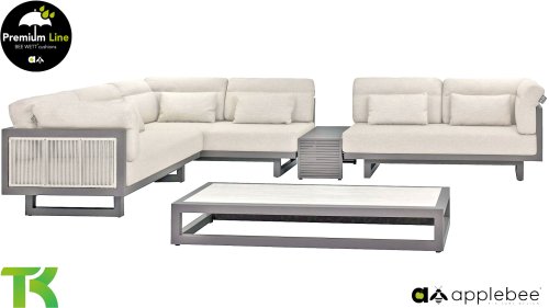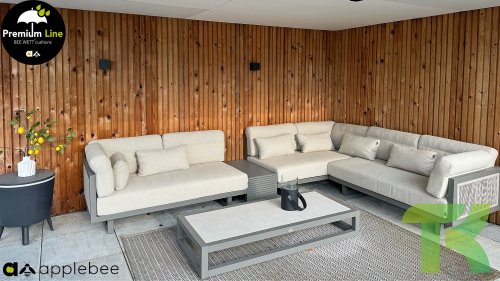 Apple Bee Santorini Lounge Rope: Wenn Sie eine elegante, kubistische Lounge-Garnitur lieben, aber dennoch Wert auf Individualität legen, dann ist die Santorini genau das Richtige für Sie! Ein schlankes, quadratisches Aluminiumrohrgestell, pulverbeschichtet in warmem Taupe. Diese Garnitur ist in zwei Ausführungen erhältlich. Der Unterschied liegt in den Paneelen an Armlehnen und Rückenlehne, die wie ein Gemälde vom Gestell eingerahmt werden. Bei der ersten Ausführung sind die Paneele mit einem wunderschönen, melierten Seil umwickelt. Dies verleiht der Garnitur eine luftige und zugleich moderne Optik. Die zweite Ausführung besticht durch gepolsterte Paneele im gleichen Stoff wie die Kissen und verleiht ihr so ​​einen Hauch von Klasse und Luxus.