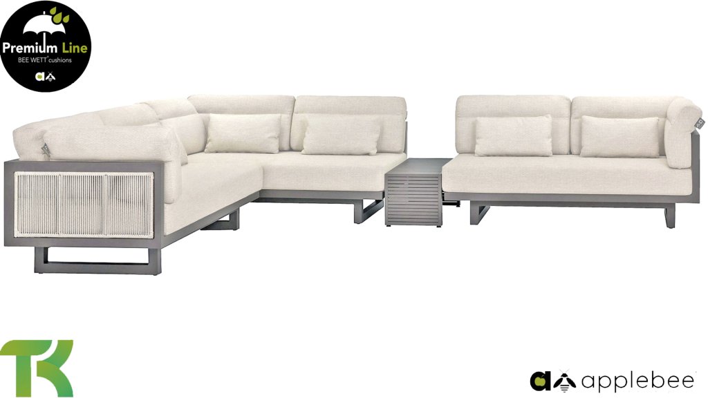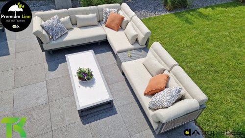 Apple Bee Santorini Lounge Rope: Wenn Sie eine elegante, kubistische Lounge-Garnitur lieben, aber dennoch Wert auf Individualität legen, dann ist die Santorini genau das Richtige für Sie! Ein schlankes, quadratisches Aluminiumrohrgestell, pulverbeschichtet in warmem Taupe. Diese Garnitur ist in zwei Ausführungen erhältlich. Der Unterschied liegt in den Paneelen an Armlehnen und Rückenlehne, die wie ein Gemälde vom Gestell eingerahmt werden. Bei der ersten Ausführung sind die Paneele mit einem wunderschönen, melierten Seil umwickelt. Dies verleiht der Garnitur eine luftige und zugleich moderne Optik. Die zweite Ausführung besticht durch gepolsterte Paneele im gleichen Stoff wie die Kissen und verleiht ihr so ​​einen Hauch von Klasse und Luxus.