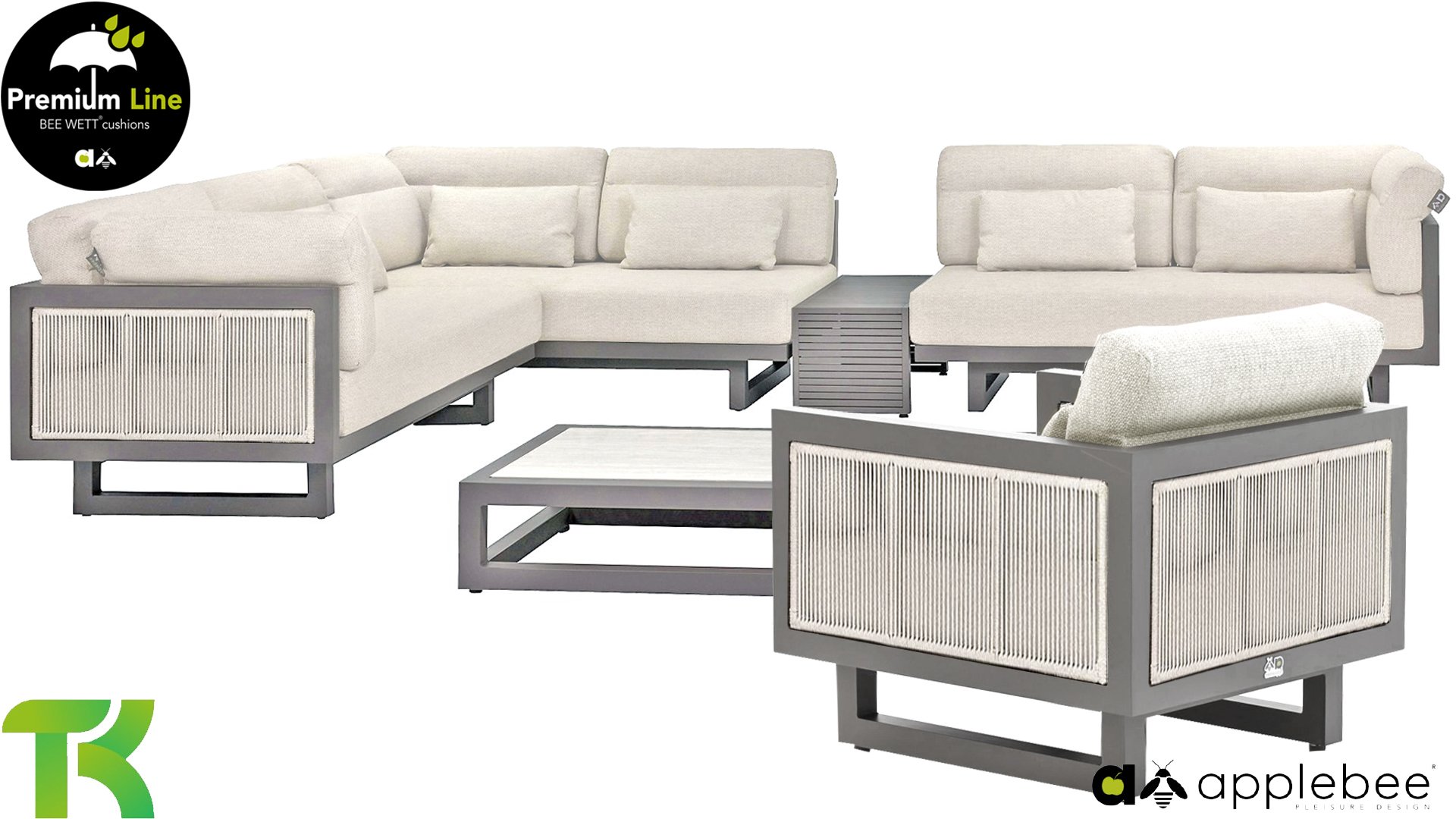 Apple Bee Santorini Lounge Rope: Wenn Sie eine elegante, kubistische Lounge-Garnitur lieben, aber dennoch Wert auf Individualität legen, dann ist die Santorini genau das Richtige für Sie! Ein schlankes, quadratisches Aluminiumrohrgestell, pulverbeschichtet in warmem Taupe. Diese Garnitur ist in zwei Ausführungen erhältlich. Der Unterschied liegt in den Paneelen an Armlehnen und Rückenlehne, die wie ein Gemälde vom Gestell eingerahmt werden. Bei der ersten Ausführung sind die Paneele mit einem wunderschönen, melierten Seil umwickelt. Dies verleiht der Garnitur eine luftige und zugleich moderne Optik. Die zweite Ausführung besticht durch gepolsterte Paneele im gleichen Stoff wie die Kissen und verleiht ihr so einen Hauch von Klasse und Luxus.