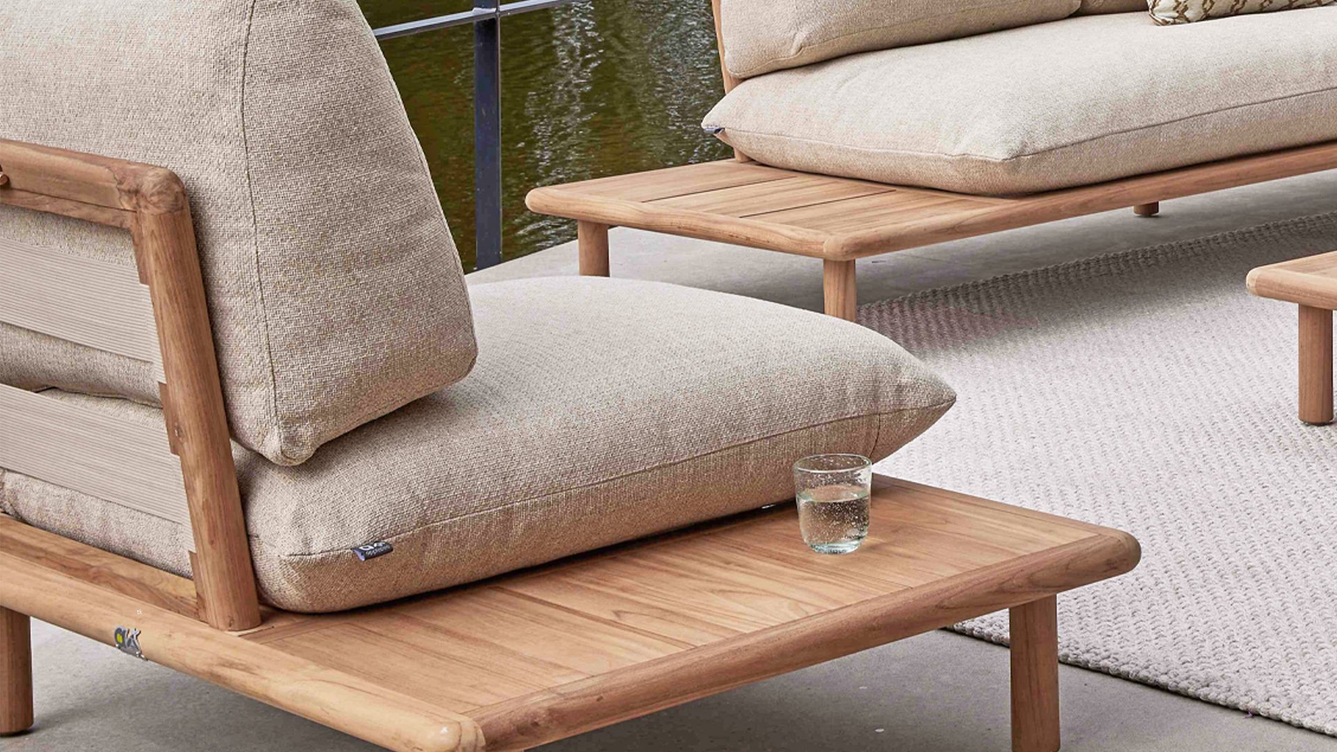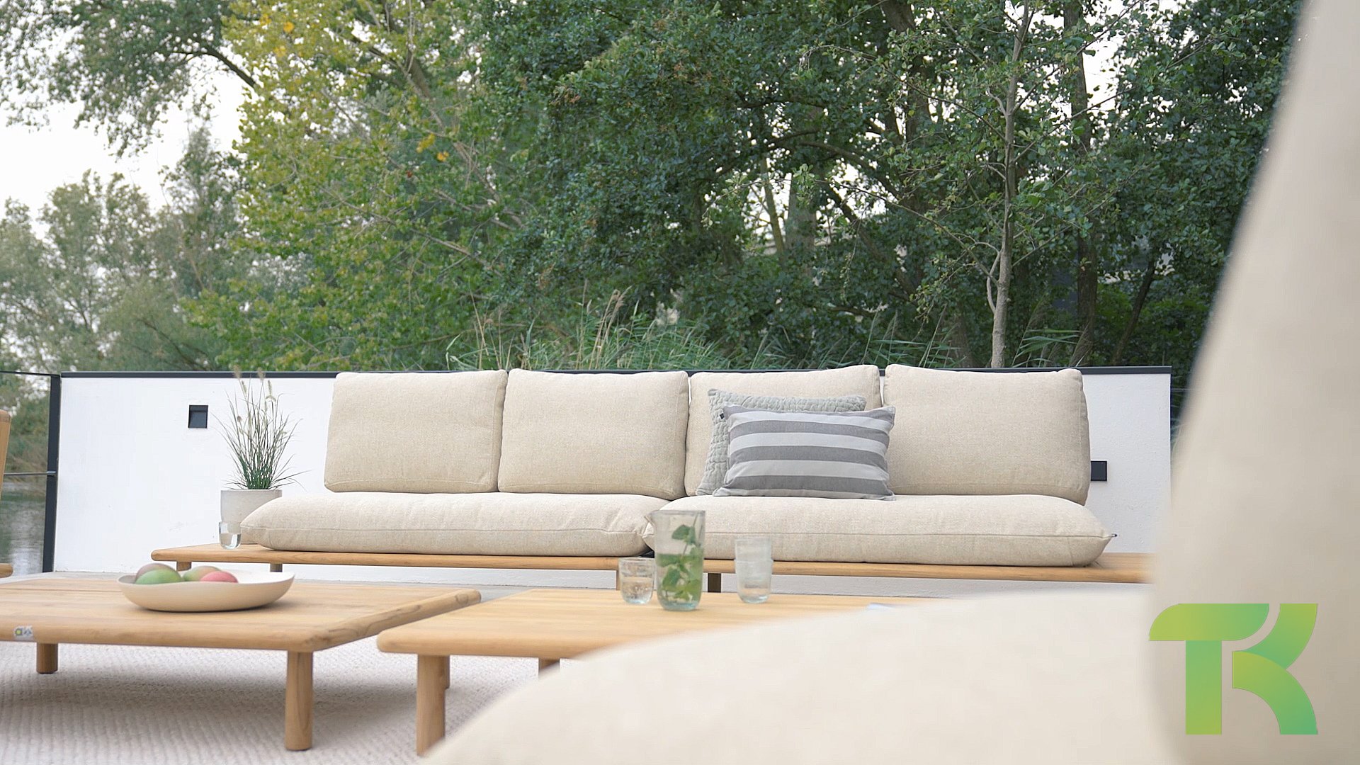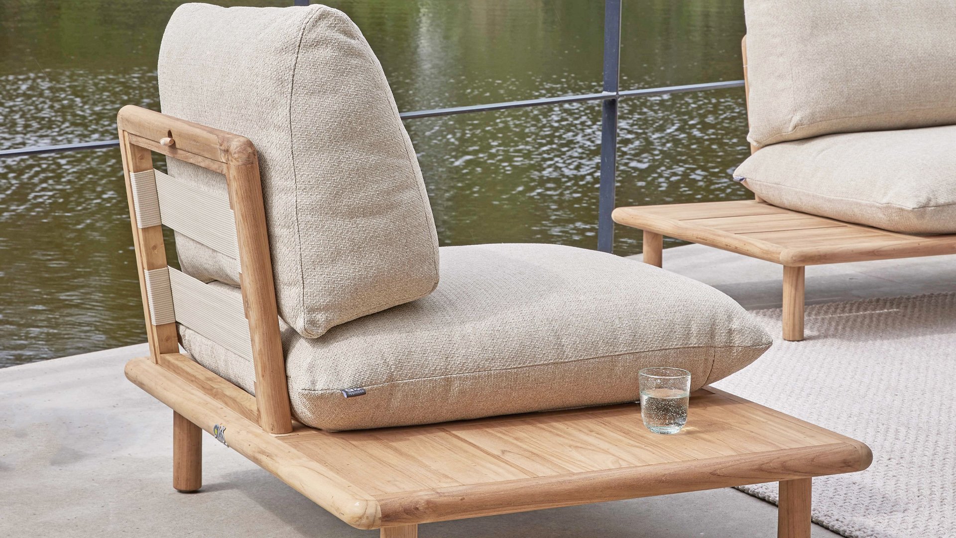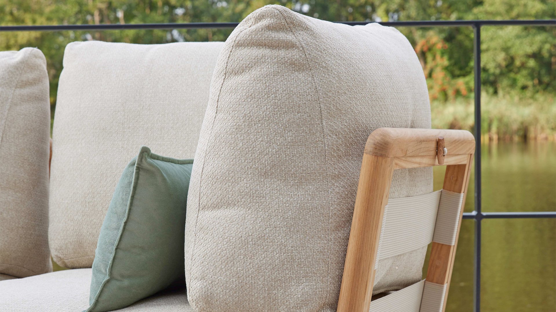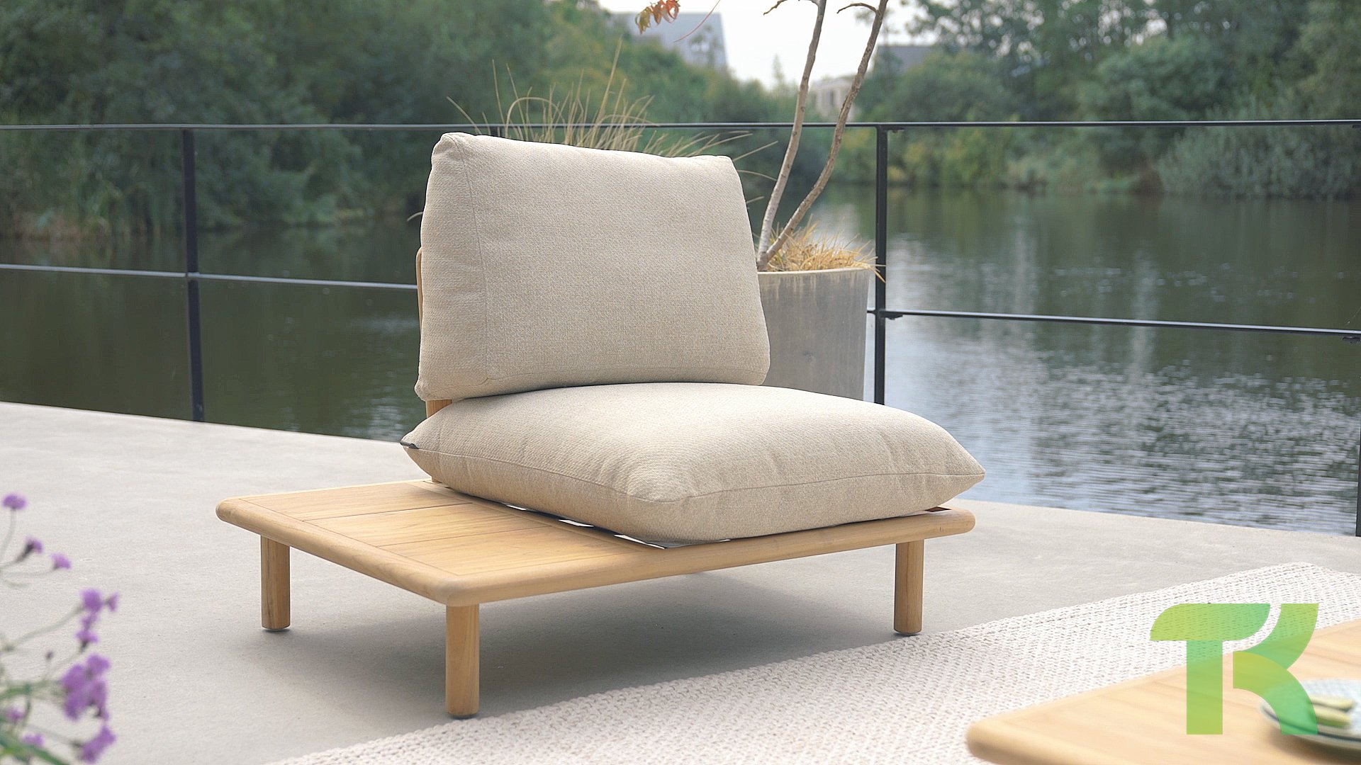 Benutzerfreundlichkeit ist das Schlüsselwort für das Design des Sling. Auf den integrierten Tischen können Sie Ihre Sachen bequem verstauen. Die Abmessungen der Module sind großzügig, sodass Sie es sich richtig gemütlich machen können. Das Design der Kissen und Kissenträger unterstreicht die entspannte Atmosphäre, die dieses Set ausstrahlt. Ein schönes Detail ist der Knopf, der durch den Teakholzrahmen gelegt wird, um das Rückenkissen zu halten.