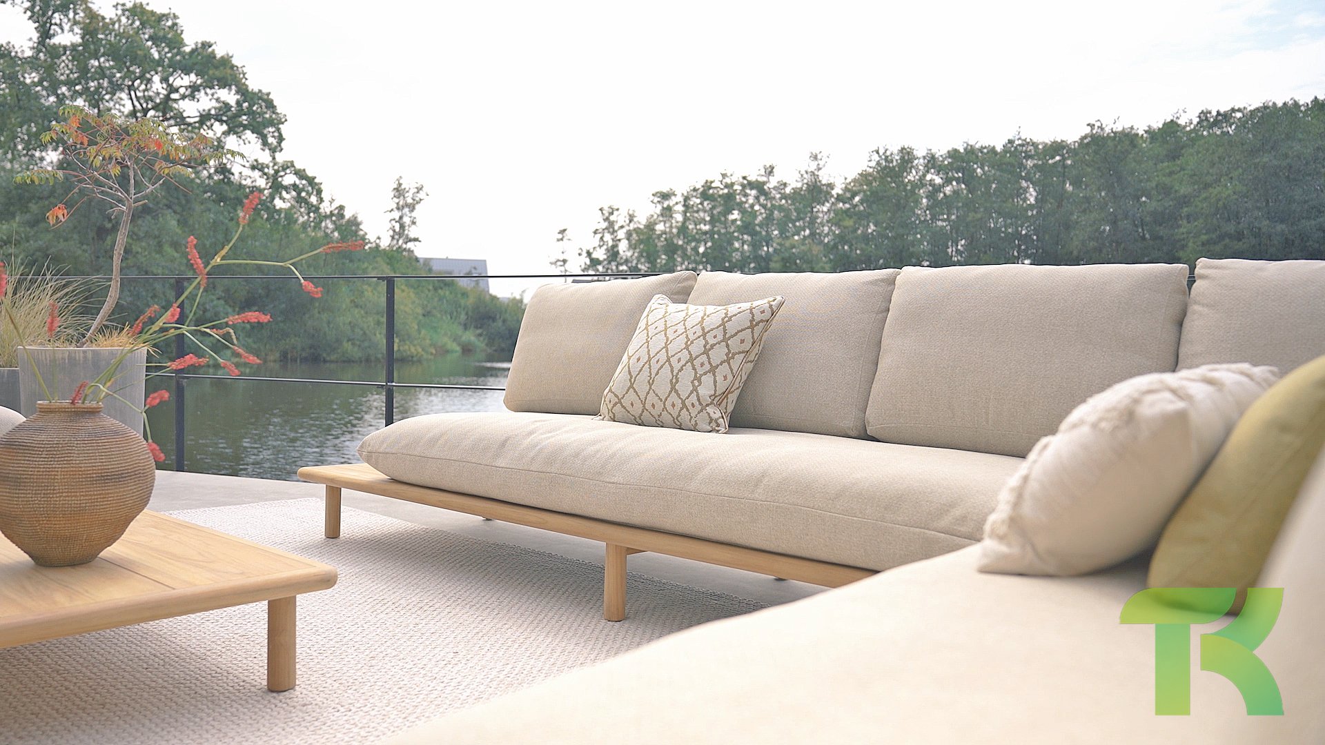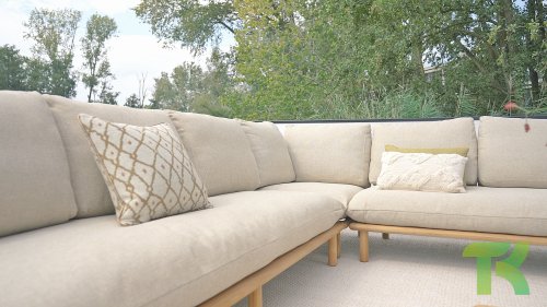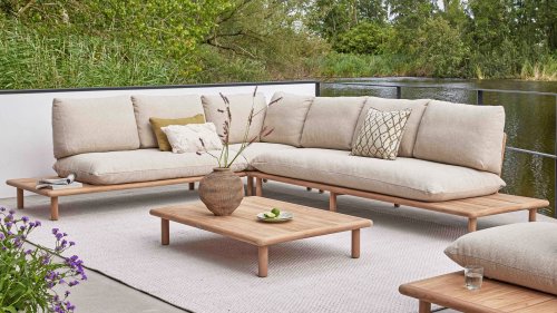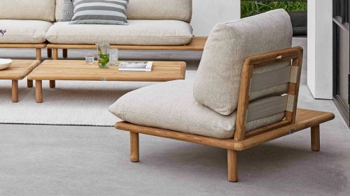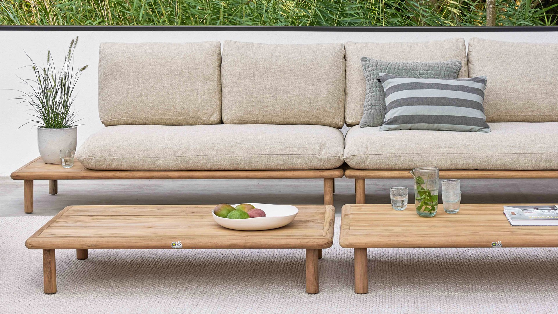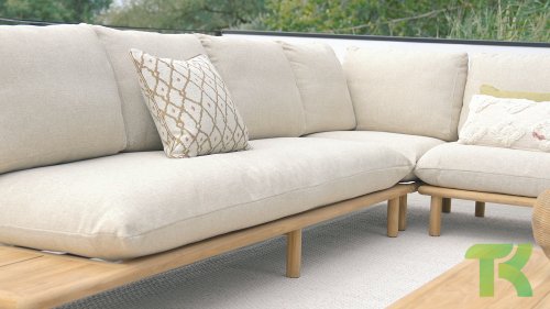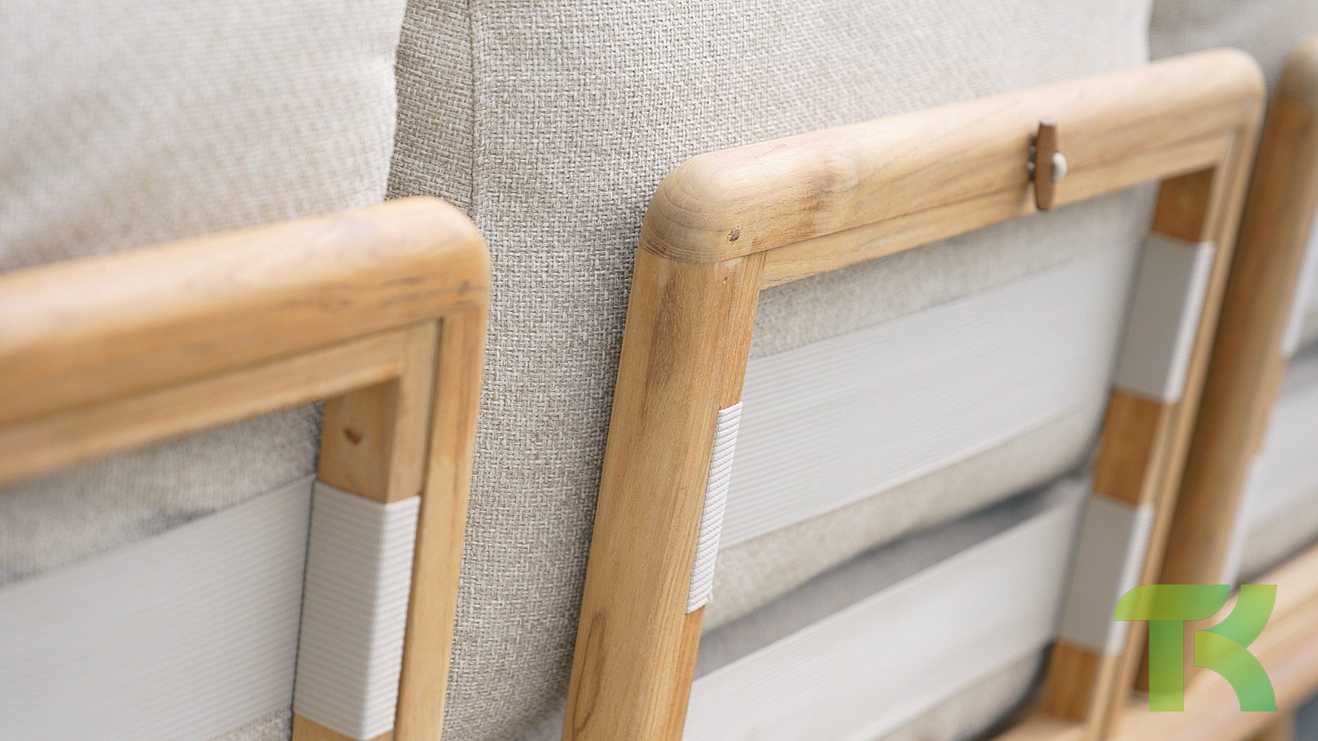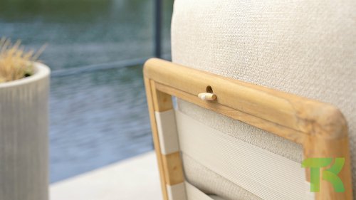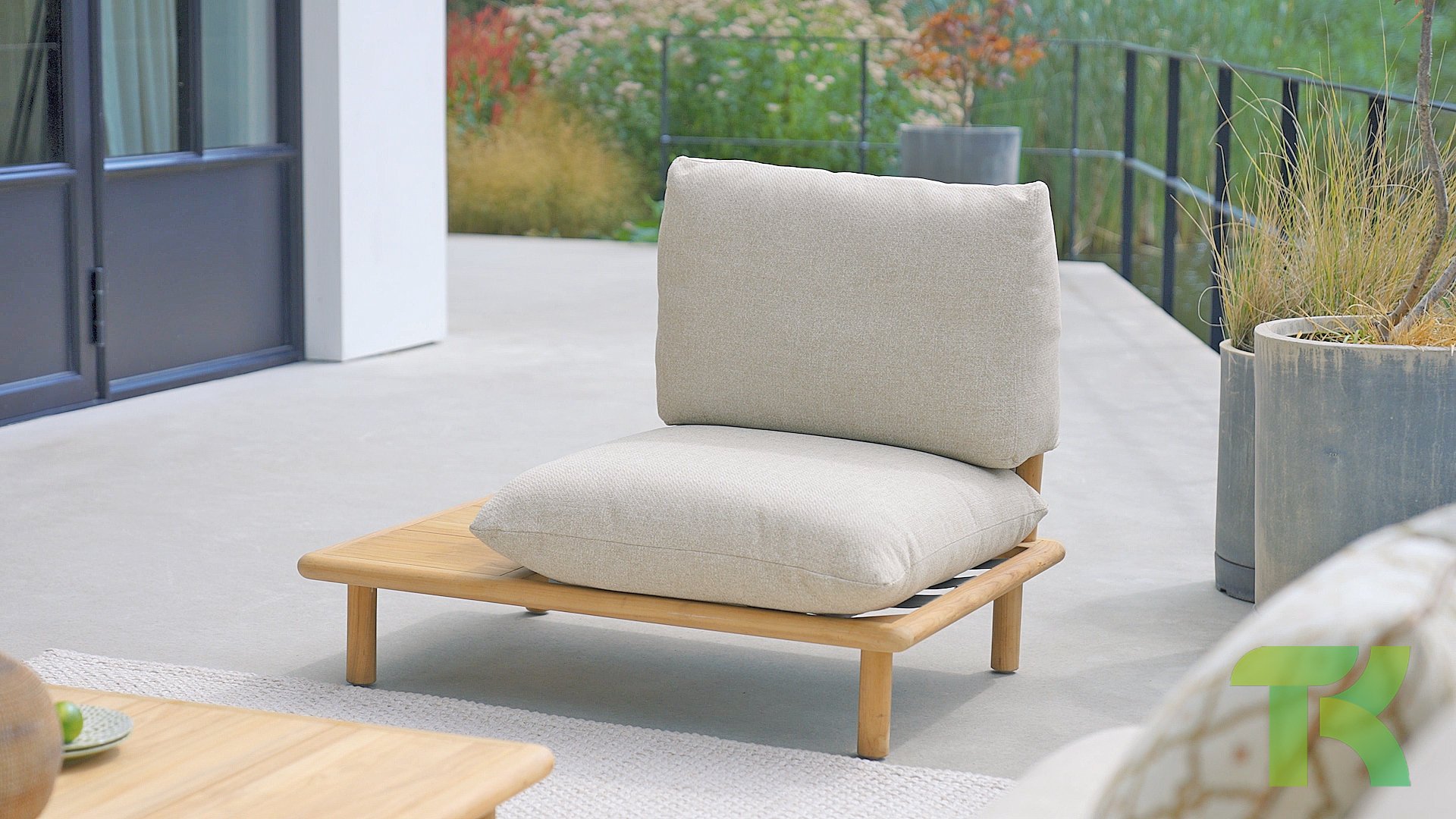 Benutzerfreundlichkeit ist das Schlüsselwort für das Design des Sling. Auf den integrierten Tischen können Sie Ihre Sachen bequem verstauen. Die Abmessungen der Module sind großzügig, sodass Sie es sich richtig gemütlich machen können. Das Design der Kissen und Kissenträger unterstreicht die entspannte Atmosphäre, die dieses Set ausstrahlt. Ein schönes Detail ist der Knopf, der durch den Teakholzrahmen gelegt wird, um das Rückenkissen zu halten.