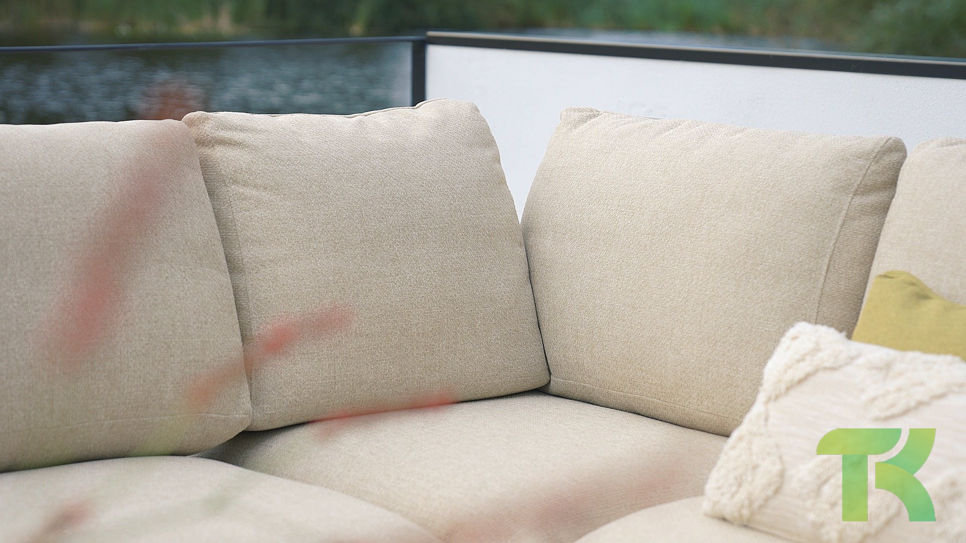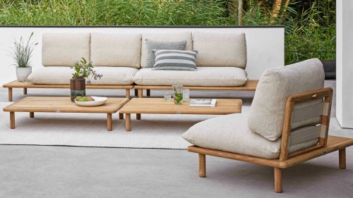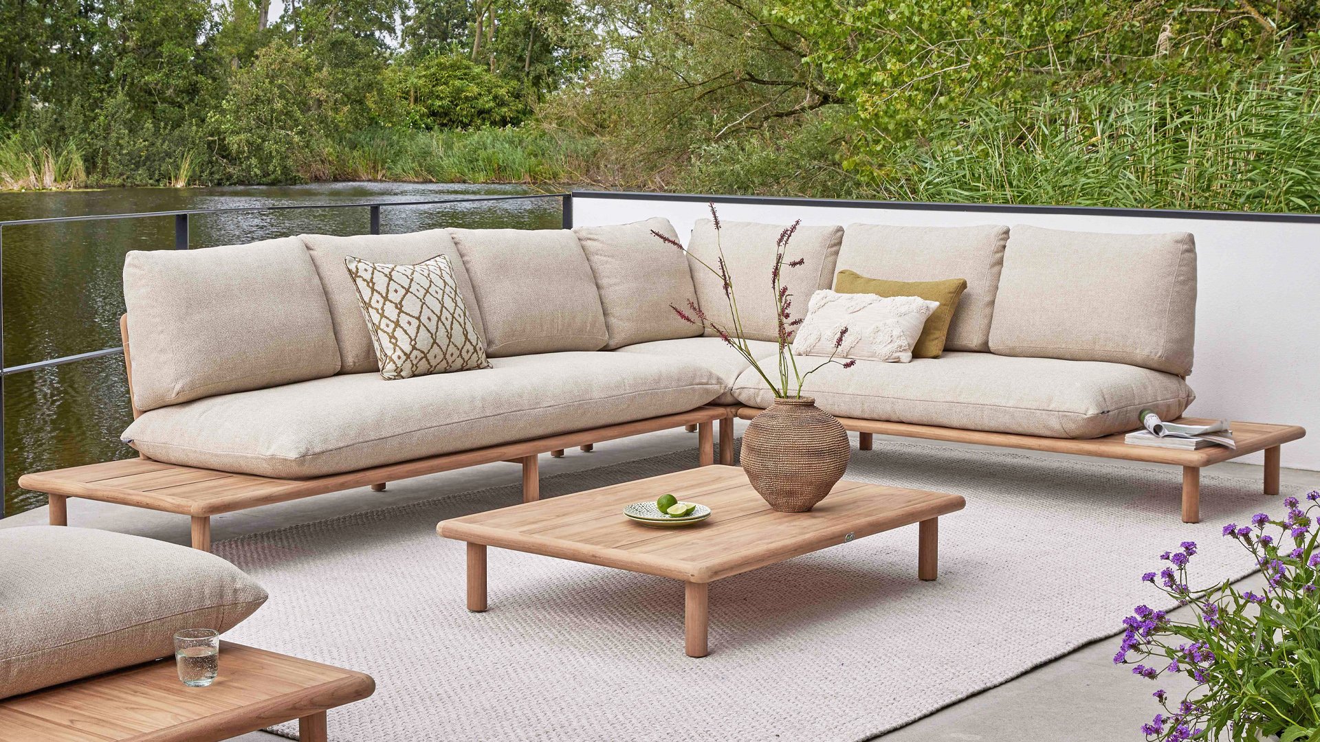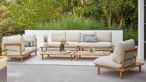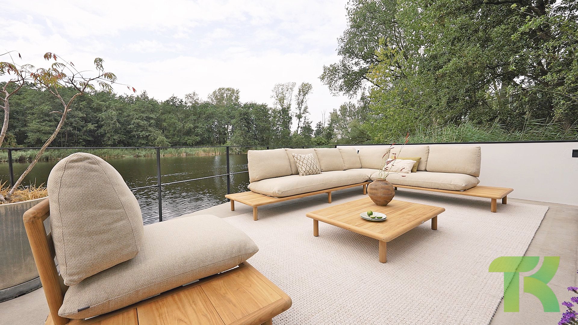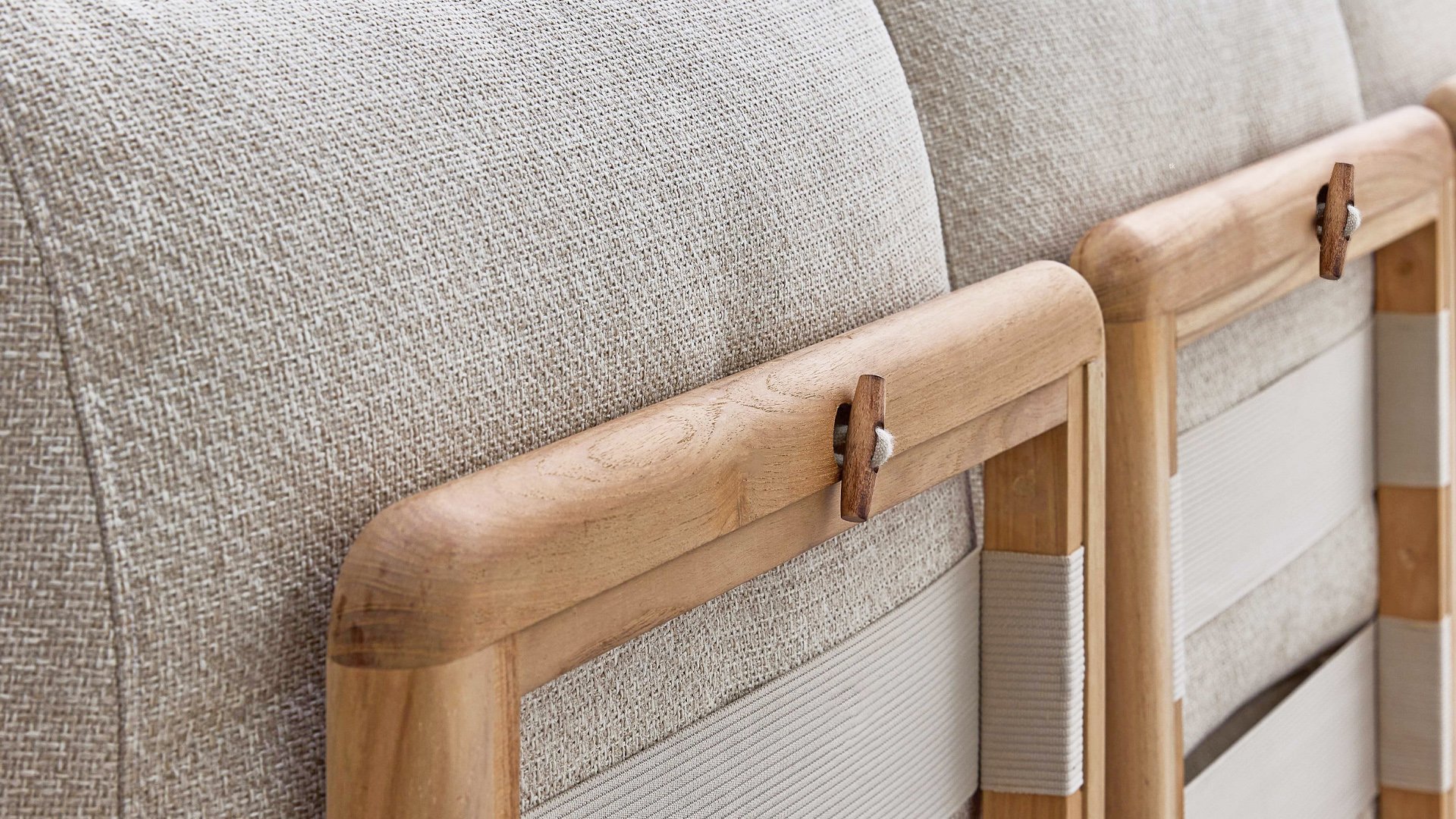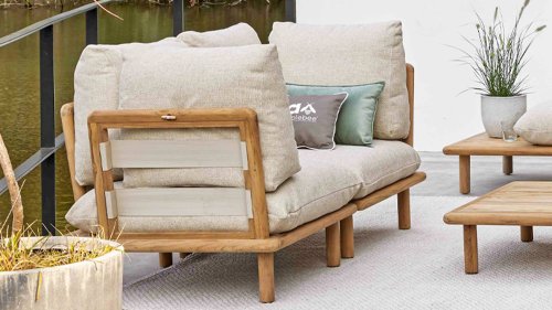 Benutzerfreundlichkeit ist das Schlüsselwort für das Design des Sling. Auf den integrierten Tischen können Sie Ihre Sachen bequem verstauen. Die Abmessungen der Module sind großzügig, sodass Sie es sich richtig gemütlich machen können. Das Design der Kissen und Kissenträger unterstreicht die entspannte Atmosphäre, die dieses Set ausstrahlt. Ein schönes Detail ist der Knopf, der durch den Teakholzrahmen gelegt wird, um das Rückenkissen zu halten.