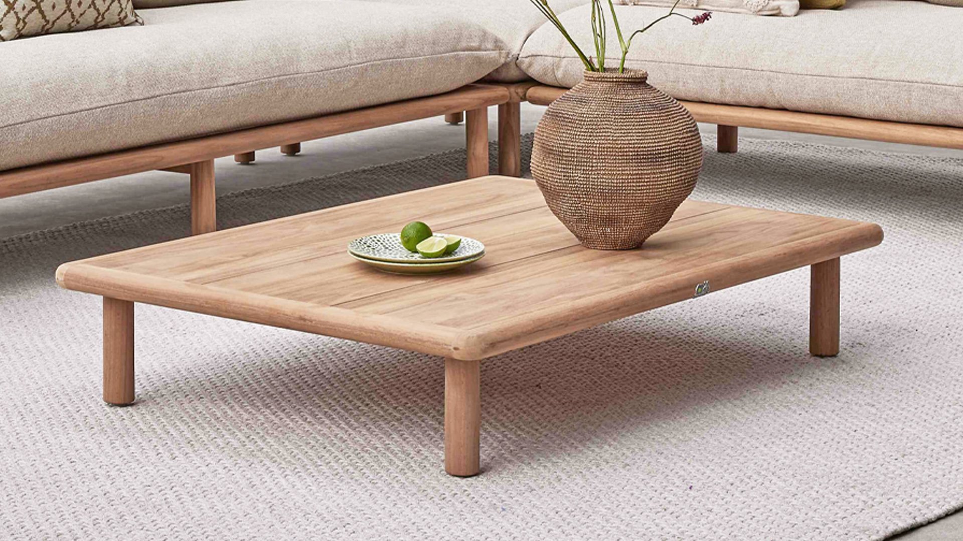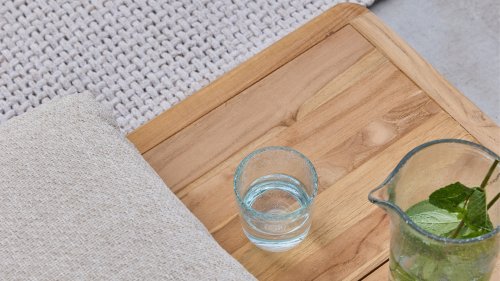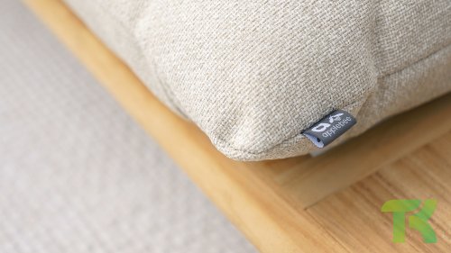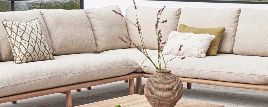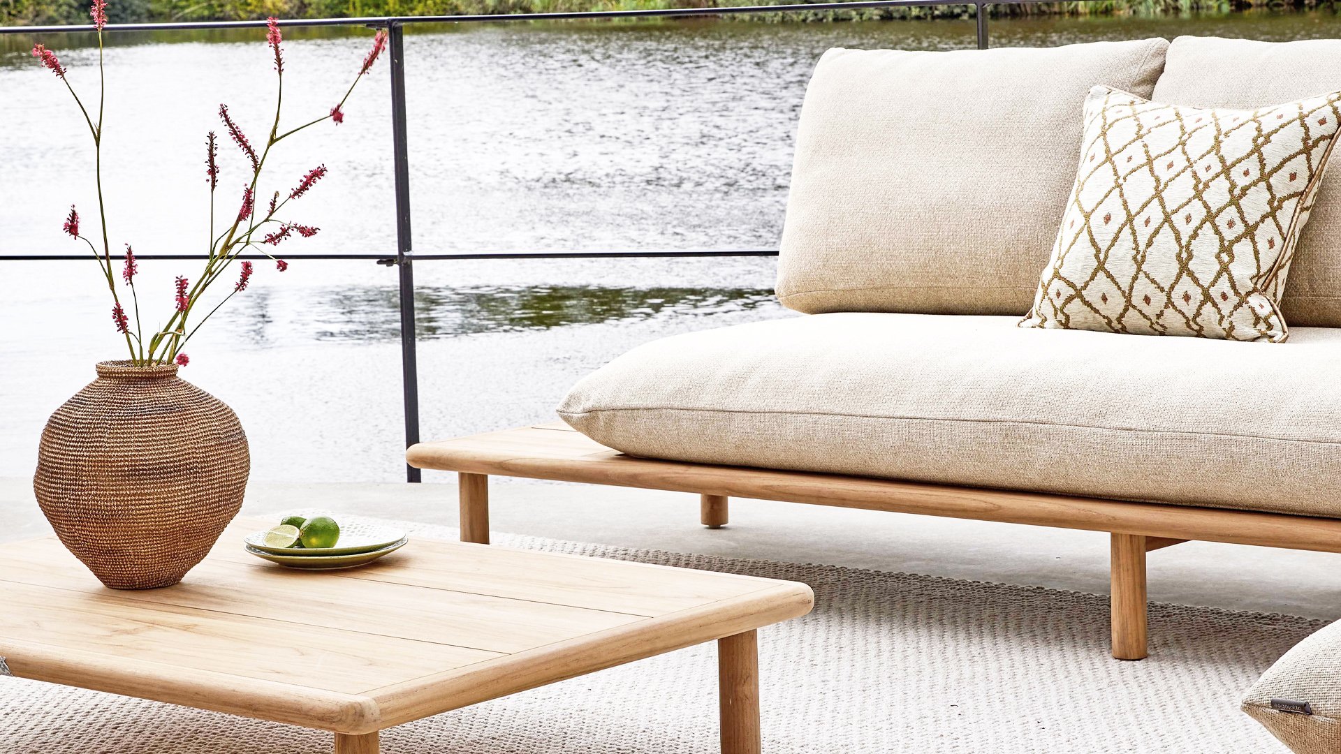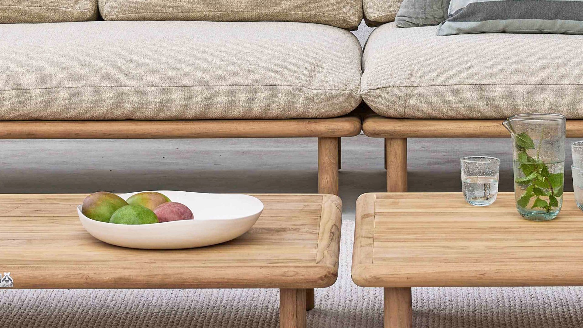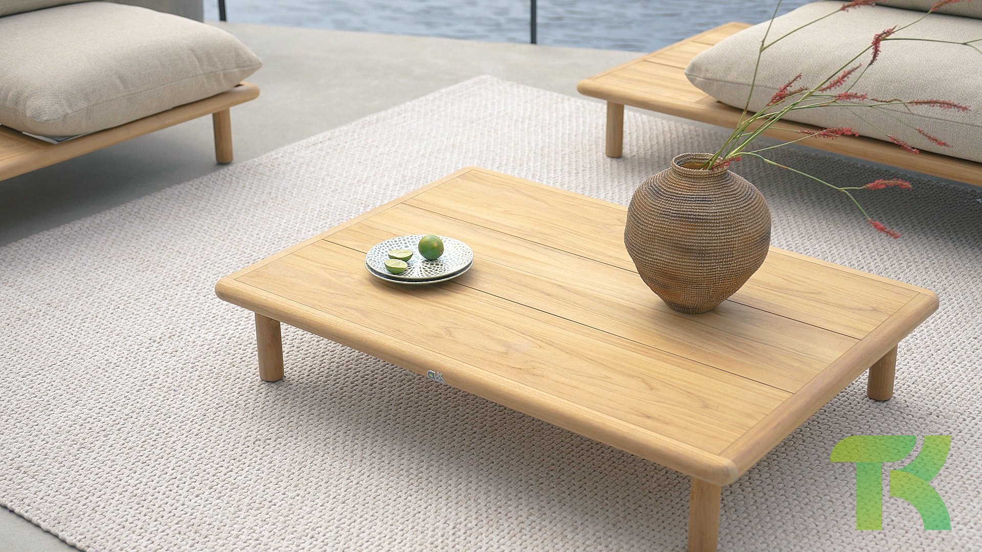 Benutzerfreundlichkeit ist das Schlüsselwort für das Design des Sling. Auf den integrierten Tischen können Sie Ihre Sachen bequem verstauen. Die Abmessungen der Module sind großzügig, sodass Sie es sich richtig gemütlich machen können. Das Design der Kissen und Kissenträger unterstreicht die entspannte Atmosphäre, die dieses Set ausstrahlt. Ein schönes Detail ist der Knopf, der durch den Teakholzrahmen gelegt wird, um das Rückenkissen zu halten.
