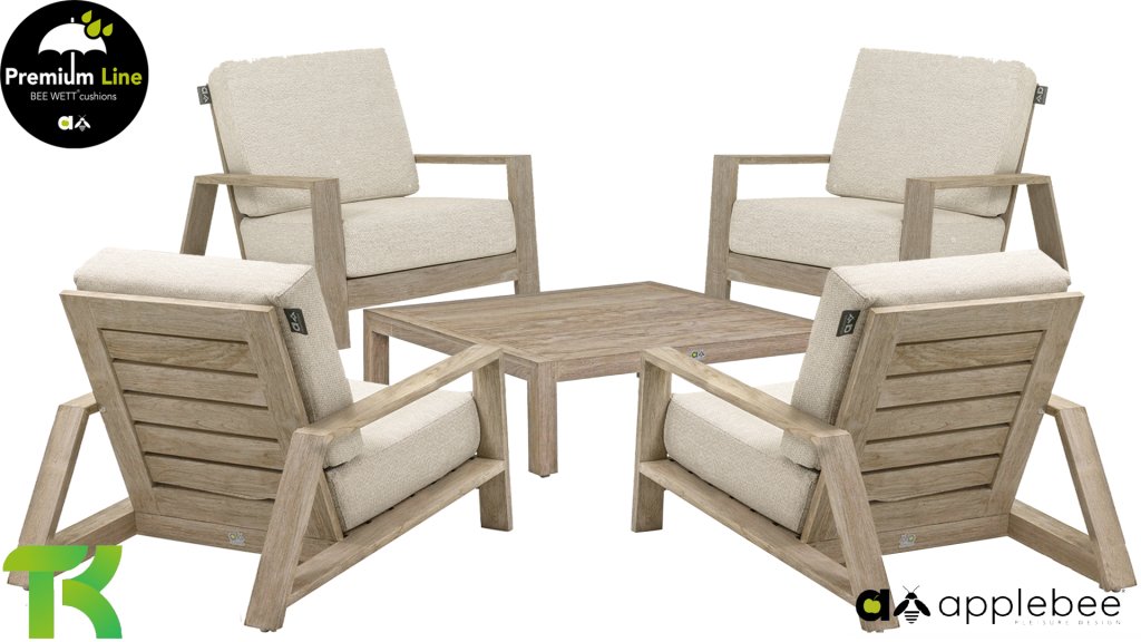 Die Apple Bee Spring Teak-Kollektion besticht durch ihr minimalistisches und klares Design, das dank seiner einzigartigen Formgebung dennoch beeindruckt. Elegante diagonale Linien, handgefertigtes Teakholz in Küstenoptik und weiche, bequeme Kissen mit sandfarbenem Bezug zeichnen dieses Set aus. Gefertigt aus hochwertigem Teakholz, ist es auch ohne Kissen ein wahrer Augenschmaus in Ihrem Garten. Ein harmonisches Gesamtbild! Mit ein paar schönen Dekokissen nach Ihrem Geschmack schaffen Sie im Handumdrehen Ihre ganz persönliche Wohlfühloase in der Sonne.