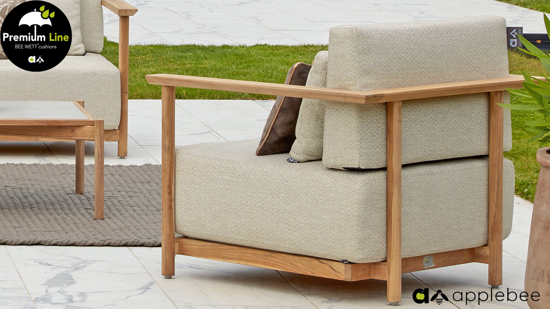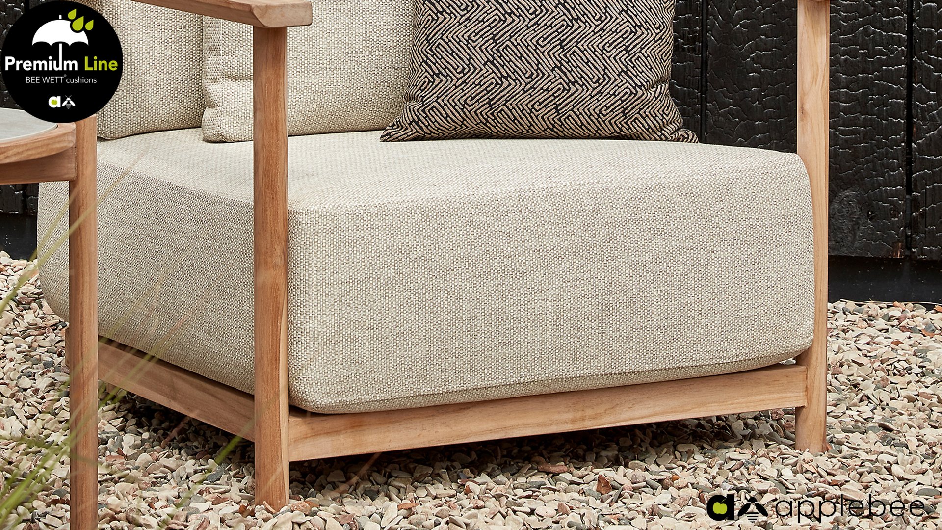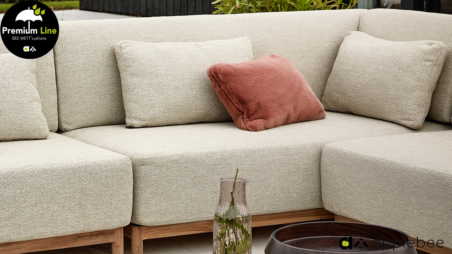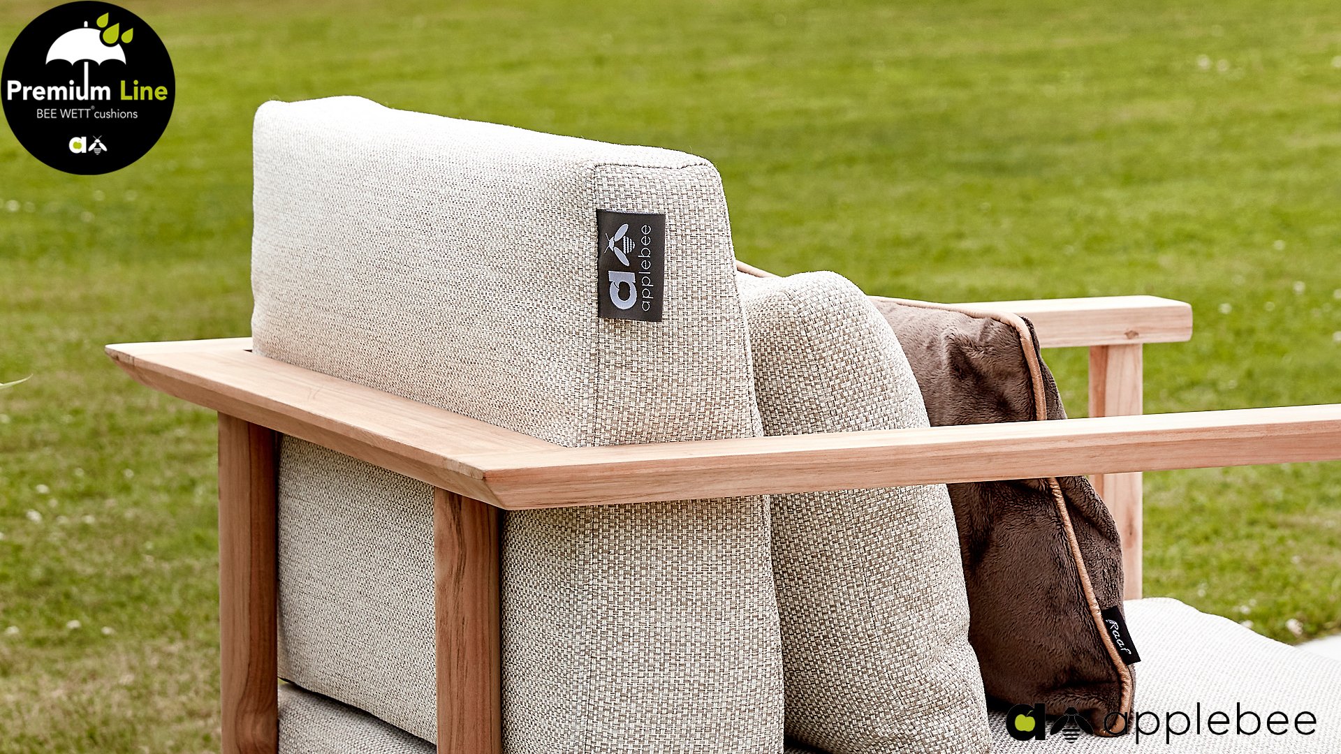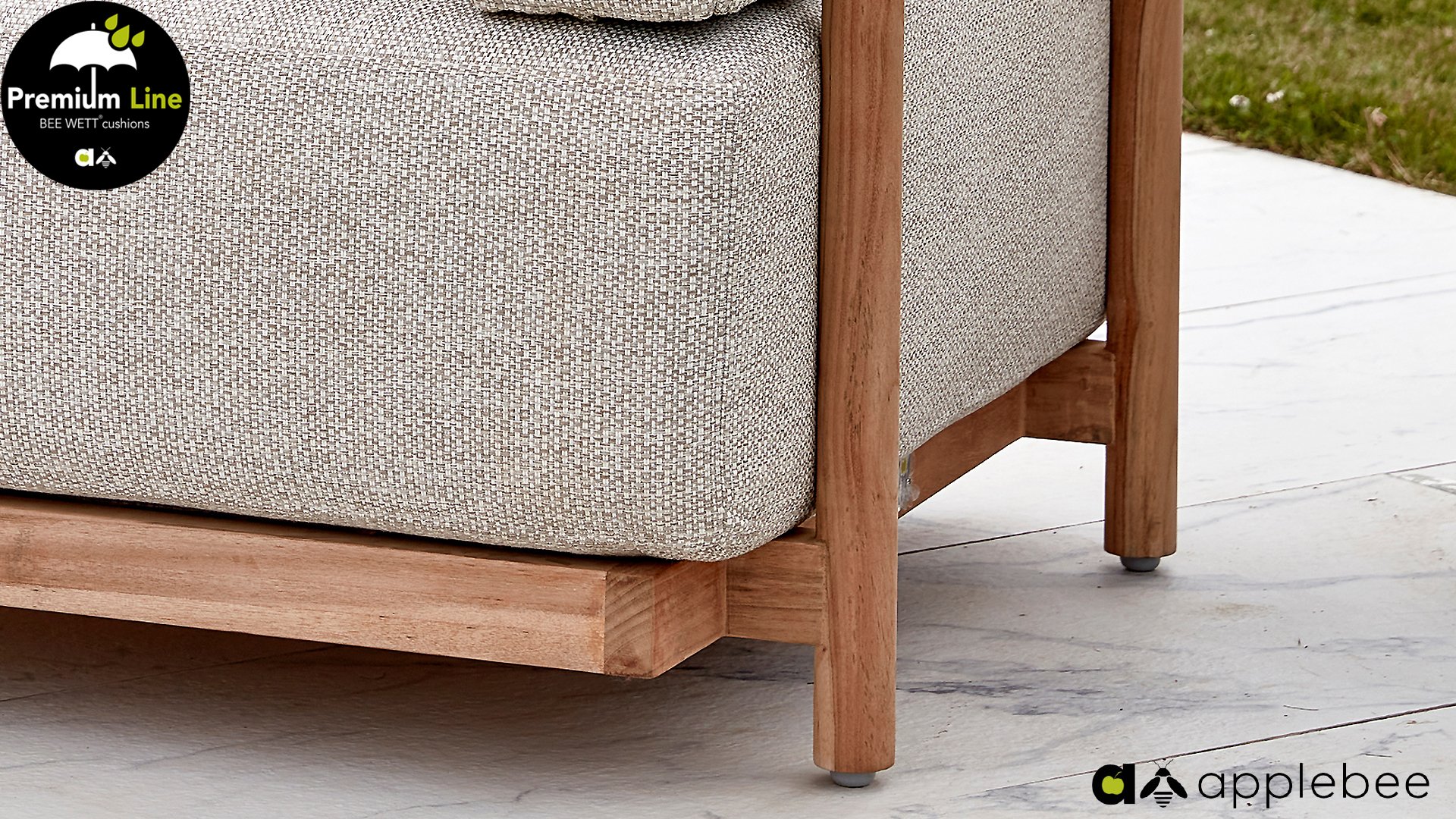 Apple Bee St. Lucia Teak Lounge: Wie luxuriös sollen die Kissen Ihres Lounge-Sets sein? Die St. Lucia Teak Lounge hat nicht weniger als 25 cm dicke Sitzkissen, natürlich in Apple Bee Bee Wett-Qualität. Obwohl Sie das vielleicht nicht erwarten, trocknen diese Kissen auch deutlich schneller als Kissen mit Standardschaum.