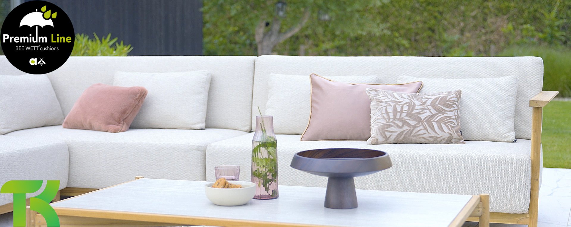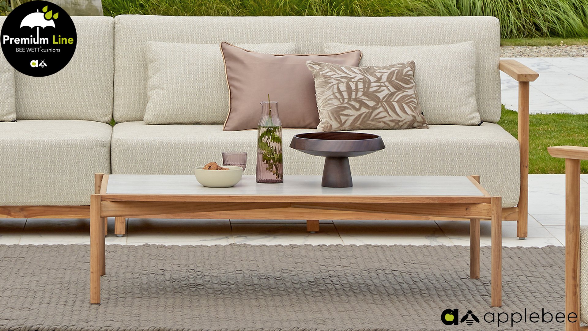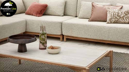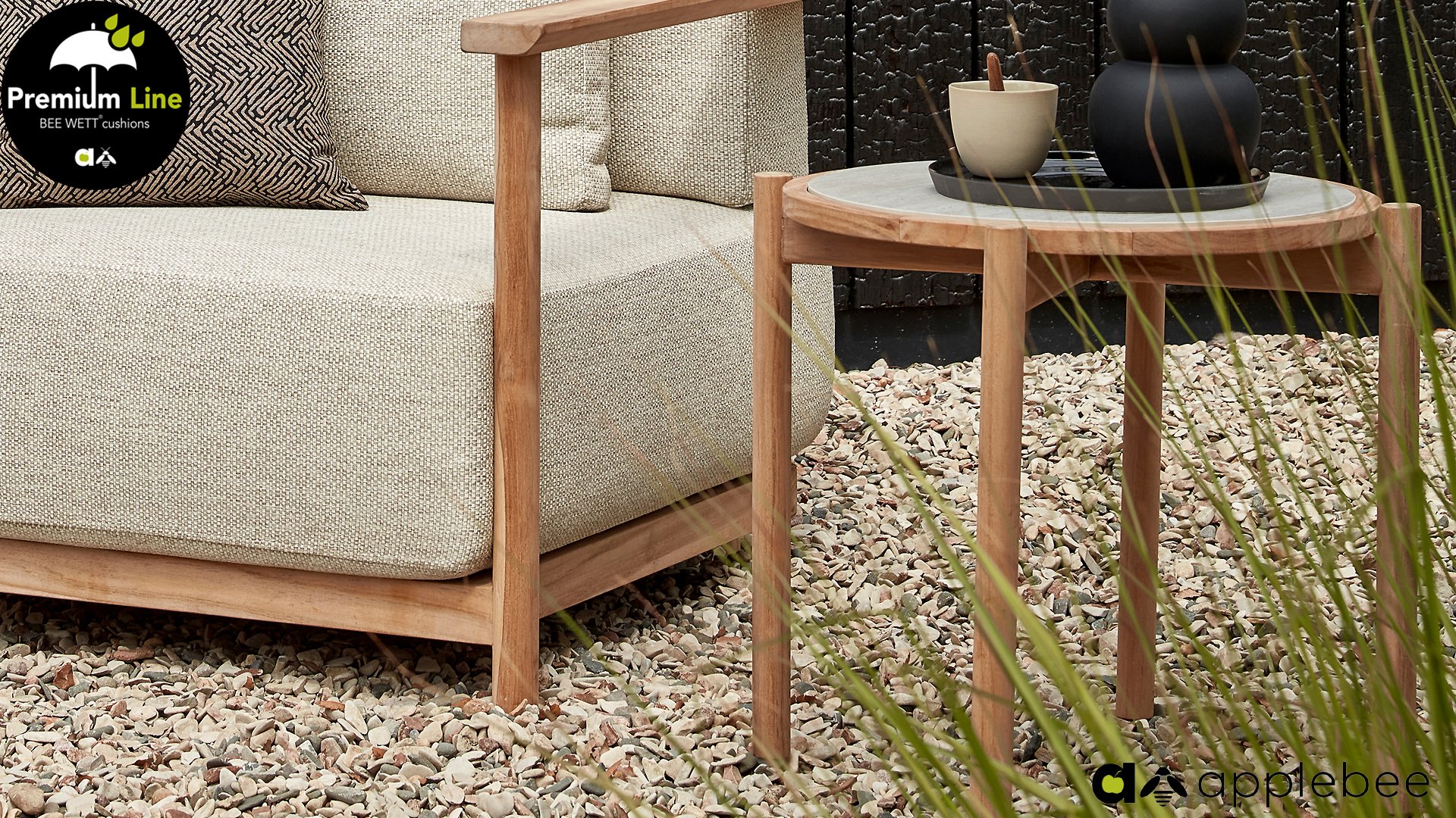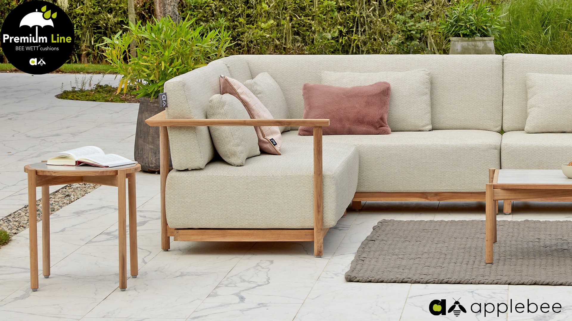 Apple Bee St. Lucia Teak Lounge: Wie luxuriös sollen die Kissen Ihres Lounge-Sets sein? Die St. Lucia Teak Lounge hat nicht weniger als 25 cm dicke Sitzkissen, natürlich in Apple Bee Bee Wett-Qualität. Obwohl Sie das vielleicht nicht erwarten, trocknen diese Kissen auch deutlich schneller als Kissen mit Standardschaum.