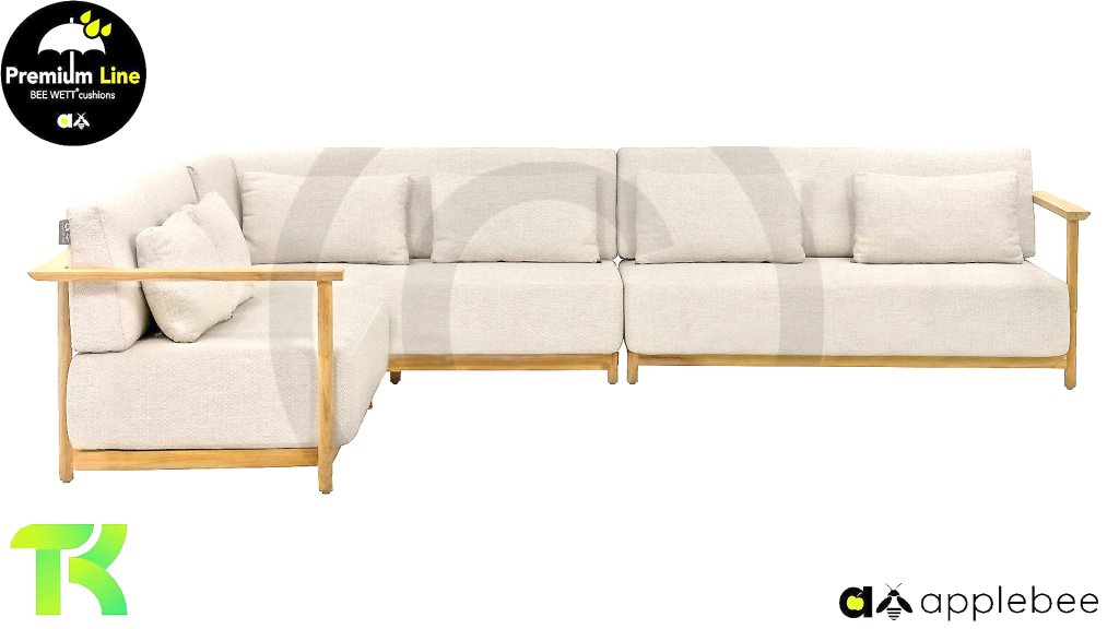 Apple Bee St. Lucia Teak Lounge: Wie luxuriös möchten Sie die Kissen Ihrer Loungeset haben? Die St. Lucia Teak Lounge hat Sitzkissen von beeindruckenden 25 cm Dicke, natürlich in der Apple Bee Bee Wett Qualität. Trotzdem, dass Sie es vielleicht nicht erwarten, trocknen diese Kissen auch wesentlich schneller als Kissen mit Standardschaum. Durch die extrem dicken Kissen erhält die St. Lucia sofort ein sehr luxuriöses Aussehen, bleibt aber durch die klare Form und Stabilität zeitgemäß. Dies liegt natürlich auch am Rahmen aus hochwertigem SVLK-Teakholz in natürlicher Farbe. Die runden Beine gehen elegant in eine geschmackvoll geformte Lehne über, die von der Armlehne über den Rücken verläuft und Sie sozusagen umarmt. St. Lucia ist robust und gleichzeitig raffiniert in den richtigen Proportionen!
