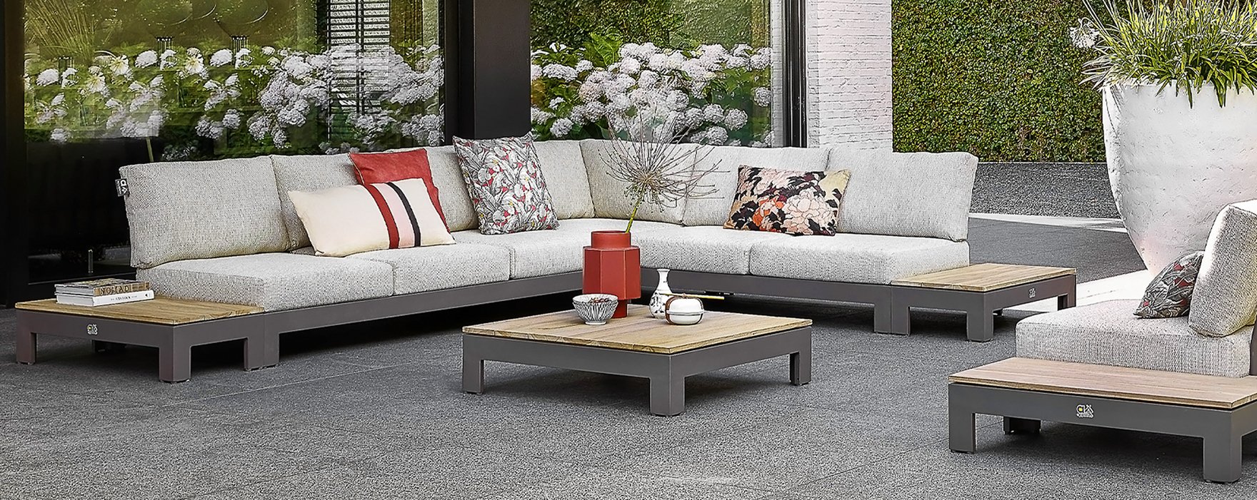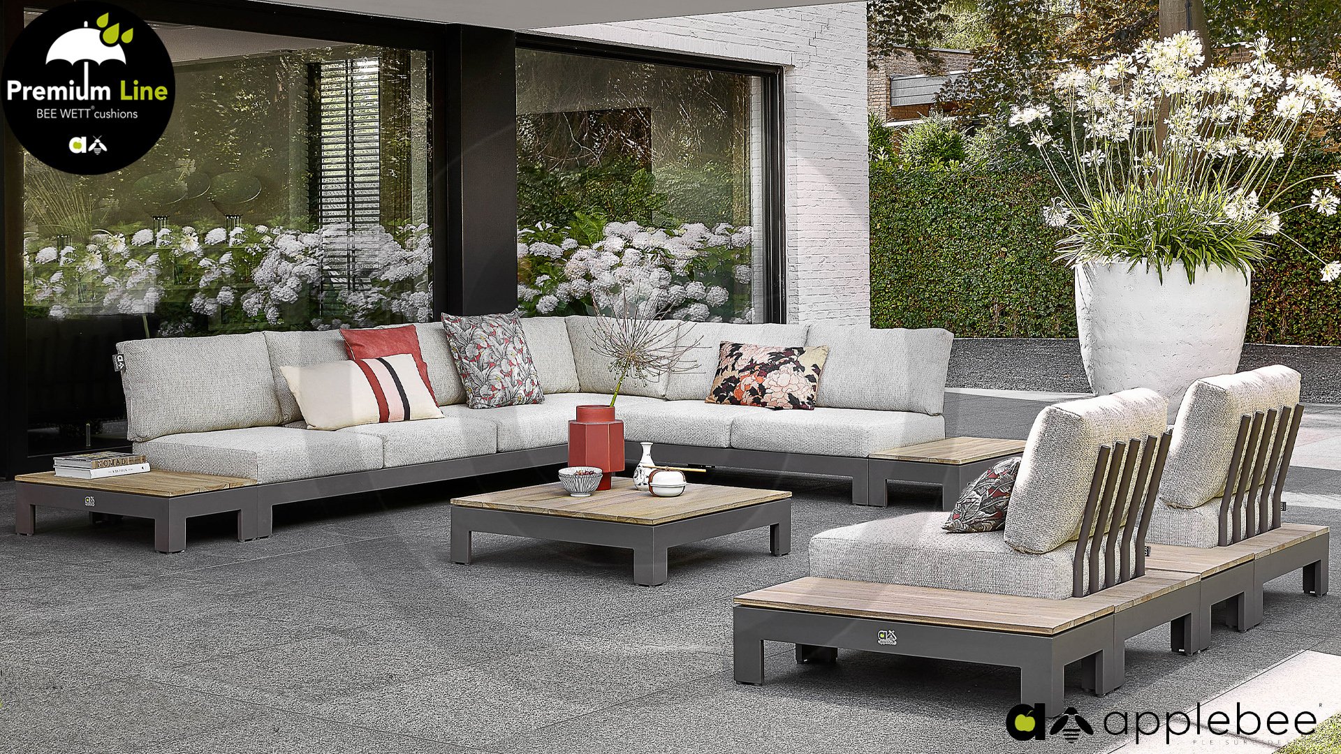 Das Grundmaterial des Apple Bee Lounge ist Taupe pulverbeschichtetes Aluminium und Coastal farbig Teakholz. Die BEE WETT®-Kissen haben eine grobe Gewebestruktur, aber einen weichen Griff. Durch Variation dieser kann das Lounge-Set in kompakter oder großzügiger Anordnung gestaltet werden, die Wahl liegt ganz bei Ihnen! Auf diese Weise passt das Set in jeden Garten. Sie können Ihrer Kreativität freien Lauf lassen und verschiedene Kombinationen