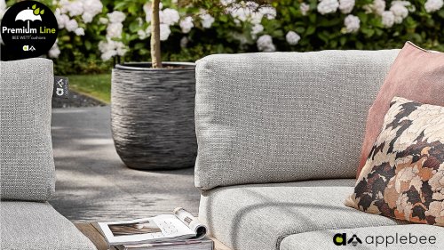 Apple Bee Möbel werden hergestellt aus den besten Materialien. Das gilt ebenso auch für die Kissen und Polster. Bee Wett sind spezielle wetterfeste Kissen die natürlich draussen liegen bleiben können. Die abnehmbaren Hüllen werden aus den bestenmöglichen Stoffen hergestellt und sind alle waschbar. Der Stoff ist zusätzlich wasserabstoßend und garantiert UV-beständig. Anders als bei dem gewöhnlichen Schaum nimmt die einzigartige Bee Wett Füllung keine Feuchtigkeit mehr auf. Eine offenes Gewebe an der Unterseite der Kissen sorgt für eine perfekte Drainage. Der Vorteil, dass die Bee-Wett® Kissen und Polster unglaublich viel schneller trocknen als vergleichbare andere Kissen. Das Bee Wett-Kissen wird mit einem Olefin Stoff bezogen, der eine gute Beständigkeit gegen Verfaulen und Stockflecken aufweist, und darüber hinaus UV-beständig, weich, komfortabel und feuchtigkeitsabstoßend ist.