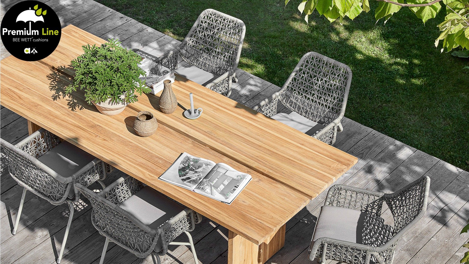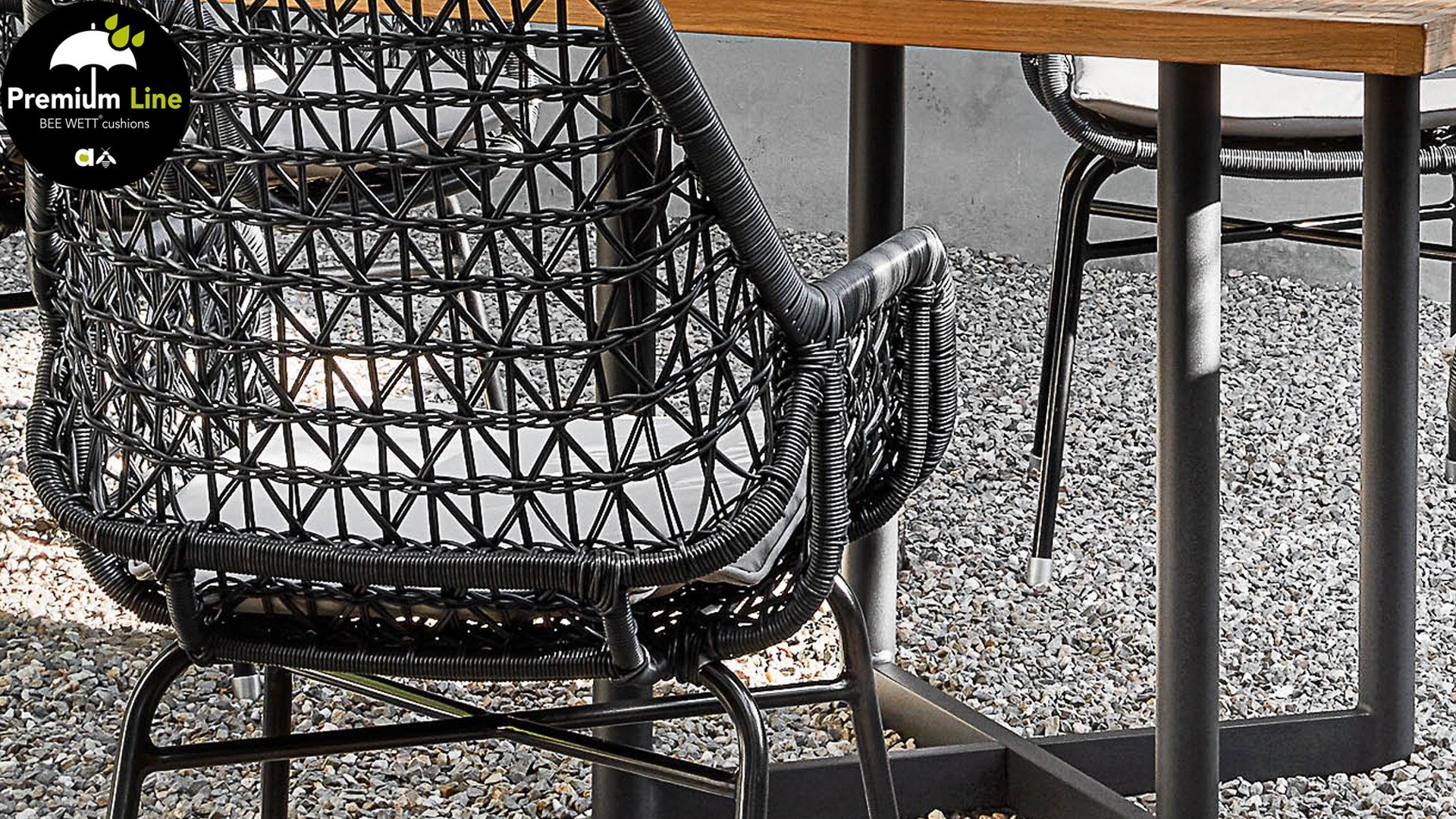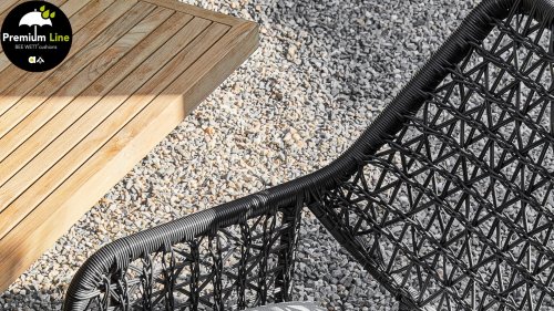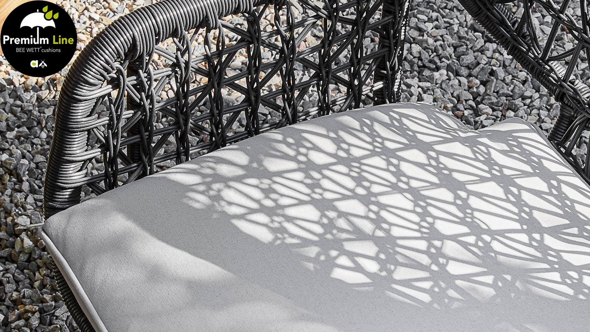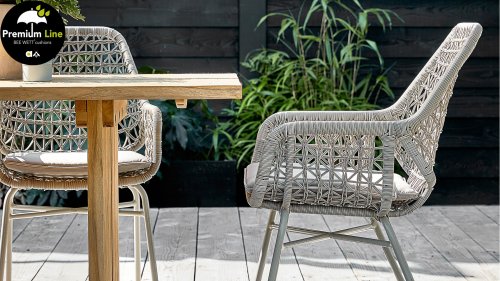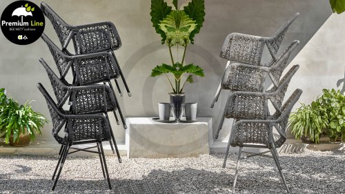 Die gewebten Fäden der Zara Esszimmerstühle sind ebenso kunstvoll geknüpft und verspielt und erzeugen so einen transparenten Effekt. Man könnte sie fast Makramee-Kunst nennen! Der Stuhl besteht aus einem Aluminiumrahmen und ist daher rostfrei. Zara ist zudem stapelbar und somit leicht zu verstauen. Die Stühle verfügen außerdem über ein abnehmbares Sitzkissen mit BEE WETT®-Technologie.