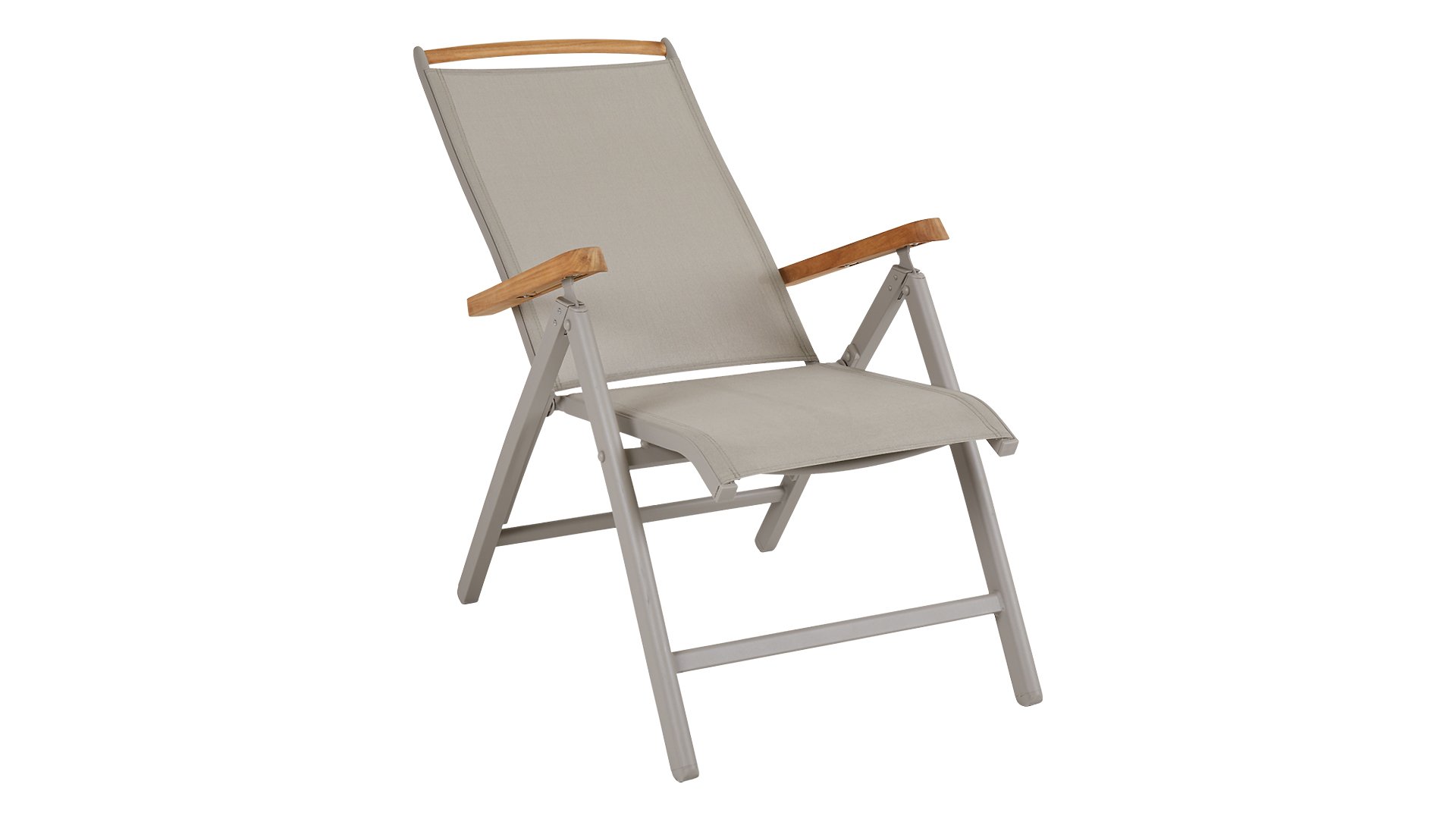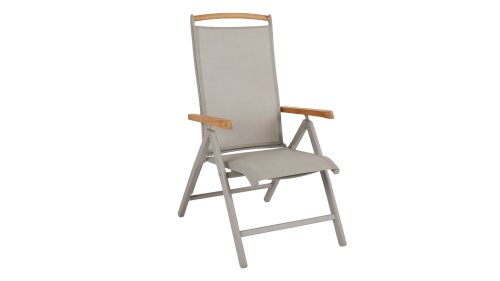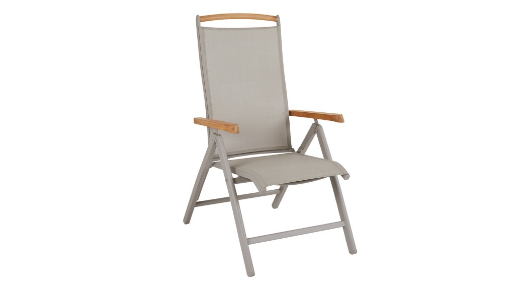 Verstellbarer funktioneller Stuhl von Brafab. Geeignet zum Essen am Tisch oder zum Entspannen. Aufgrund des Textilene-Sitzes ist dieser Stuhl bequem ohne Kissen zu verwenden. Die Khaki-Farbe in Kombination mit warmem Teakholz macht diesen verstellbaren Stuhl zu einem eleganten Möbelstück!