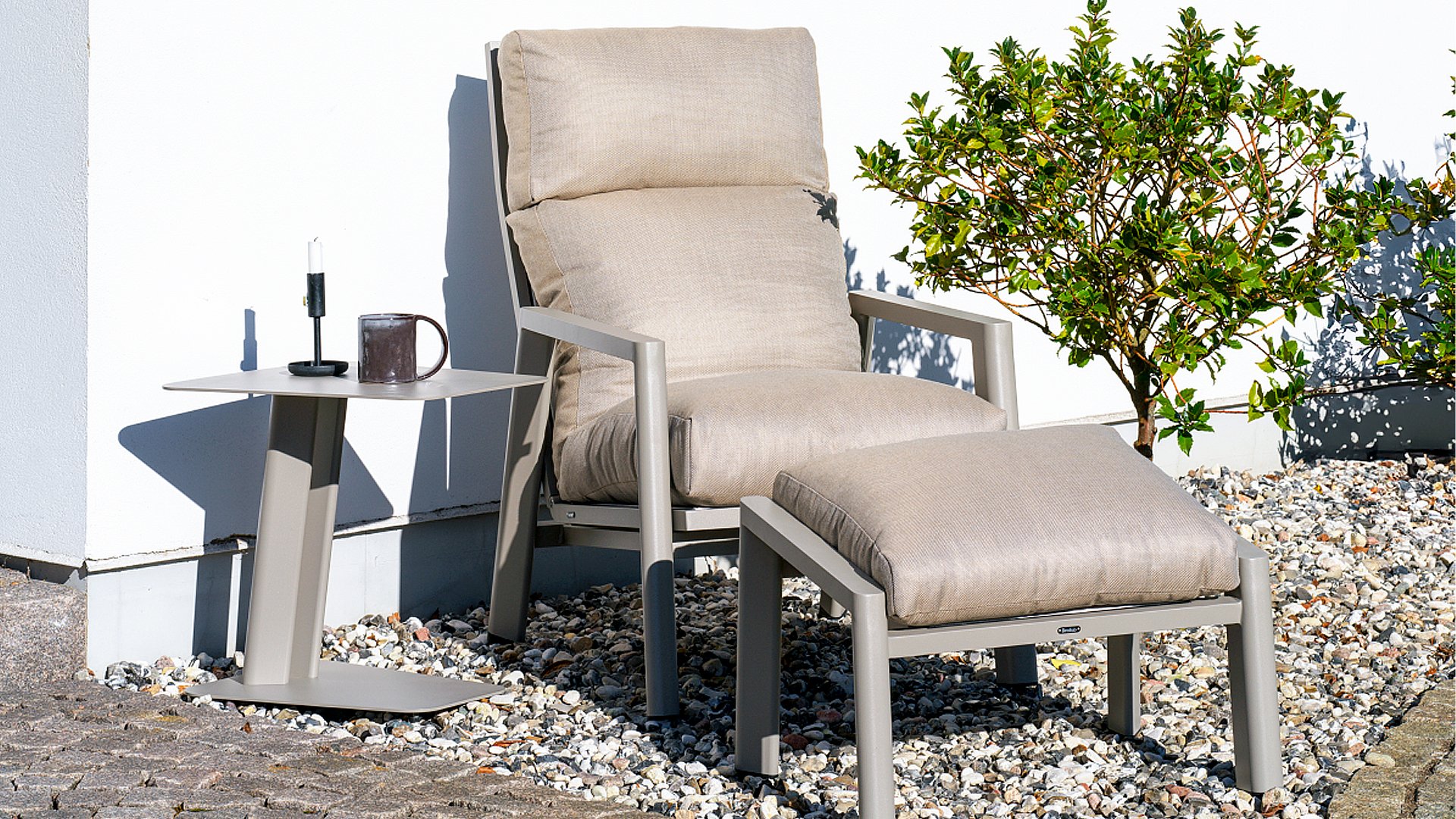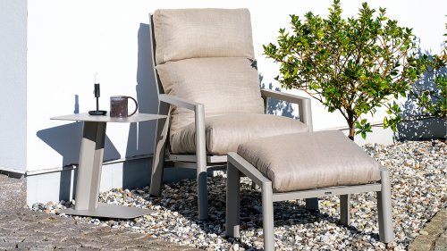 Brafab Slide Lounge: einem bequemen Loungesessel mit stufenloser Verstellung der Rückenlehne aus modernen Materialien. Der Fußhocker ist eine wertvolle Erweiterung, um den Loungekomfort zusätzlich zu erhöhen.