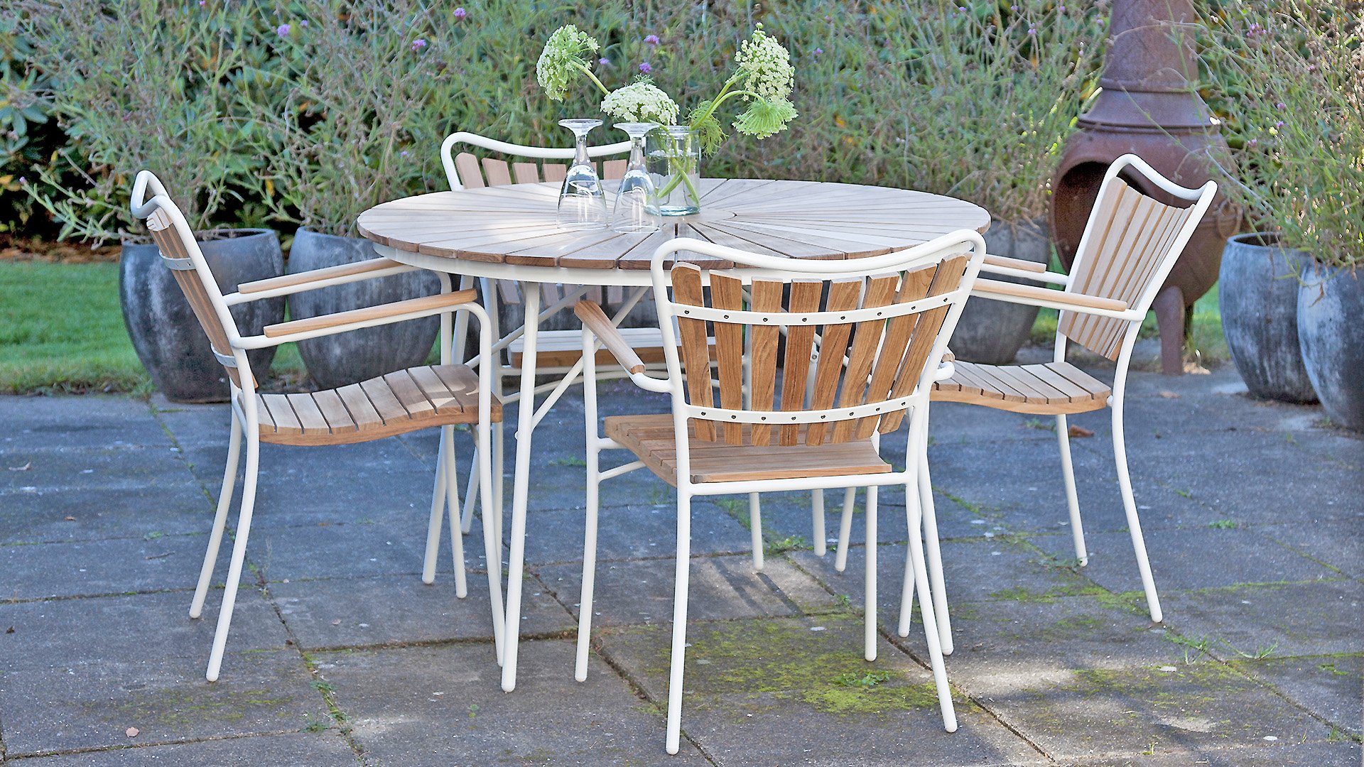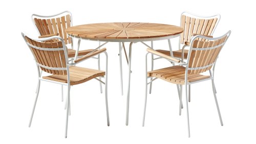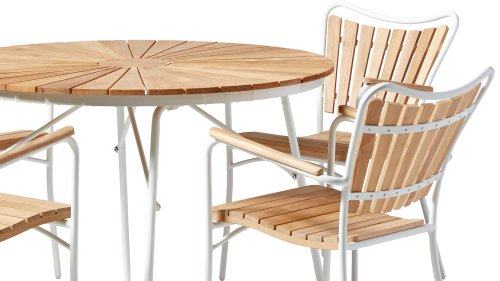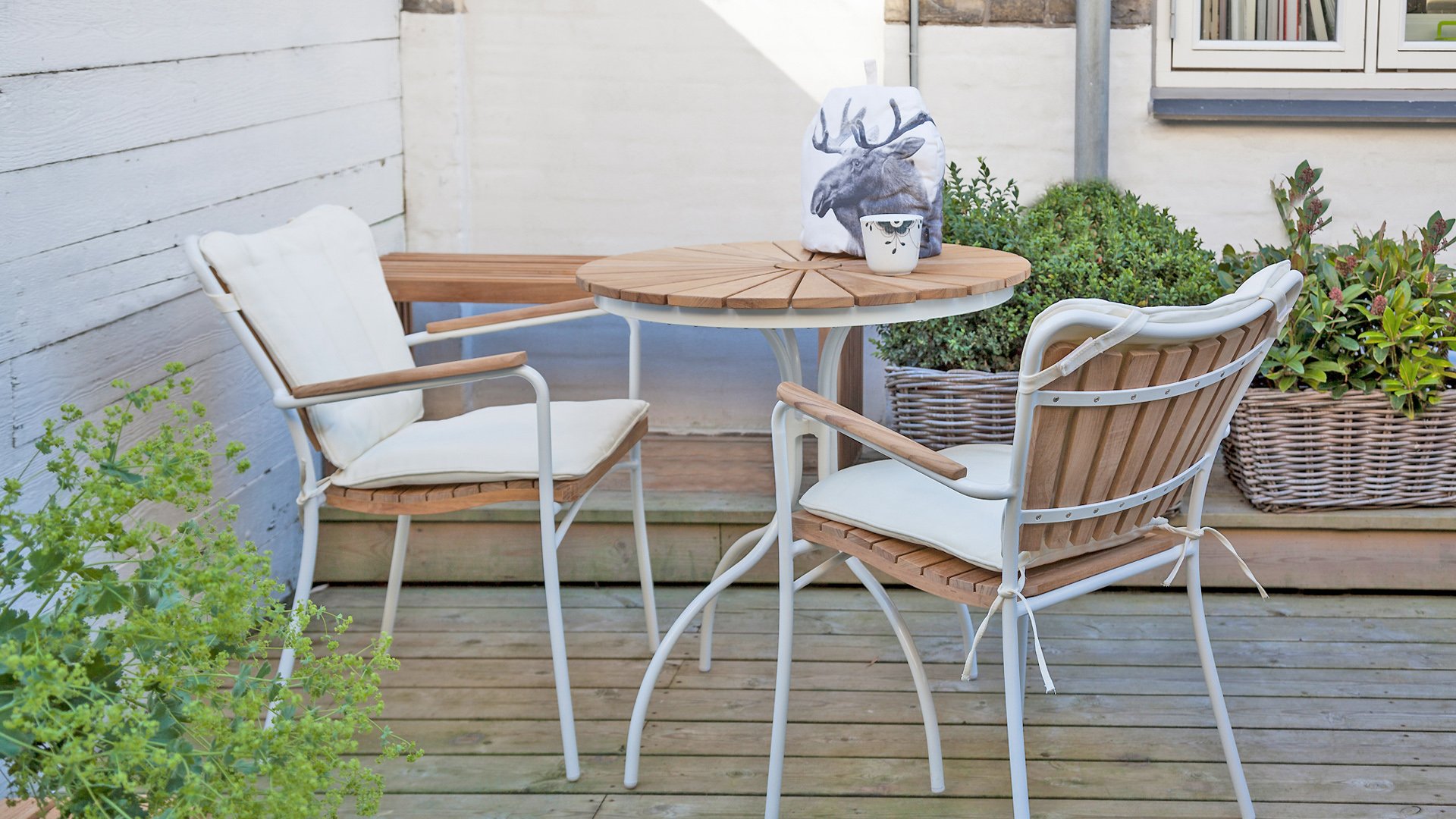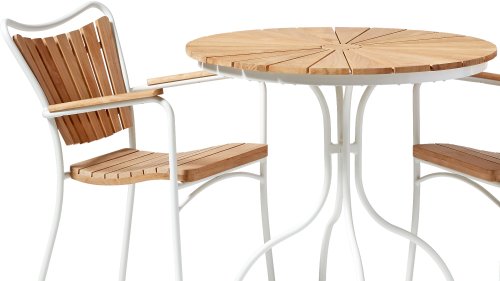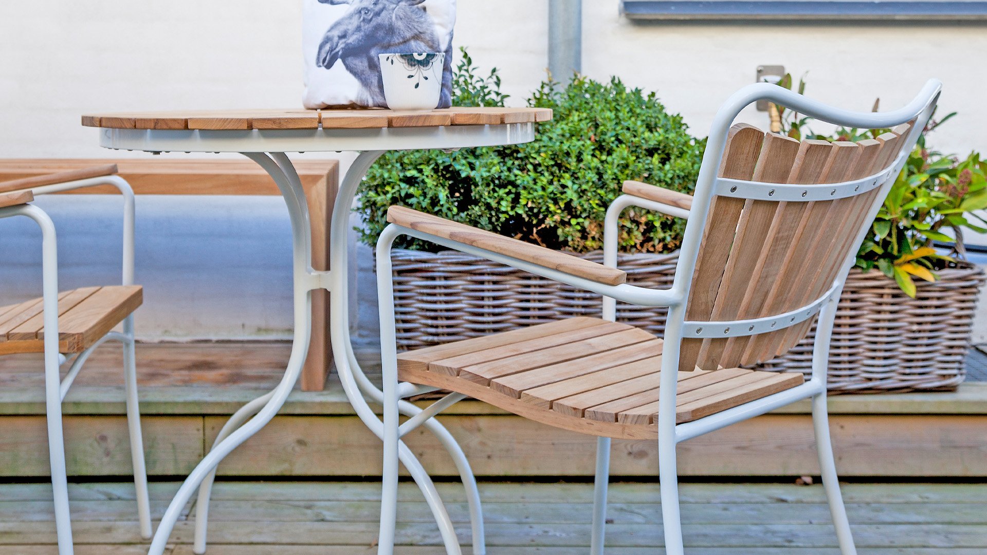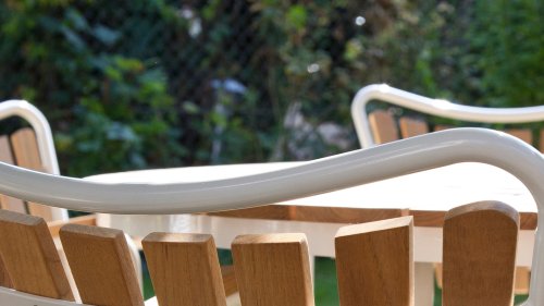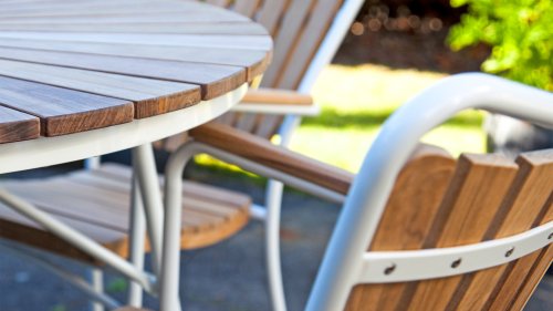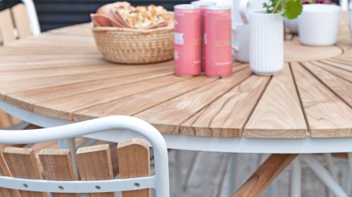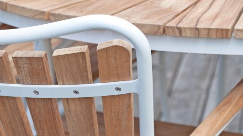 Sowohl die Ellen-Tische als auch die Ellen-Stühle von CINAS sind mit anthrazitfarbenem oder weißem pulverbeschichtetem Aluminiumrahmen erhältlich. Das warme Teakholz in Kombination mit den anthrazitfarbenen oder weißen Rahmen ist eine sehr schöne Kombination.