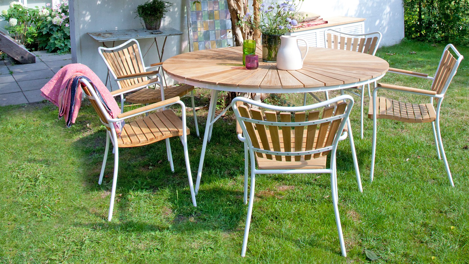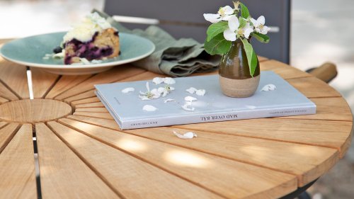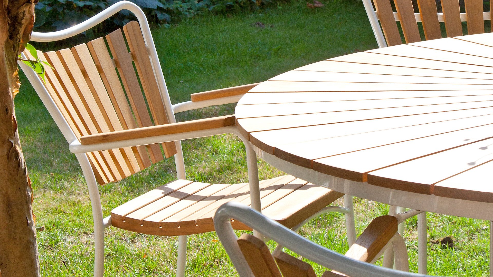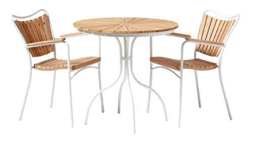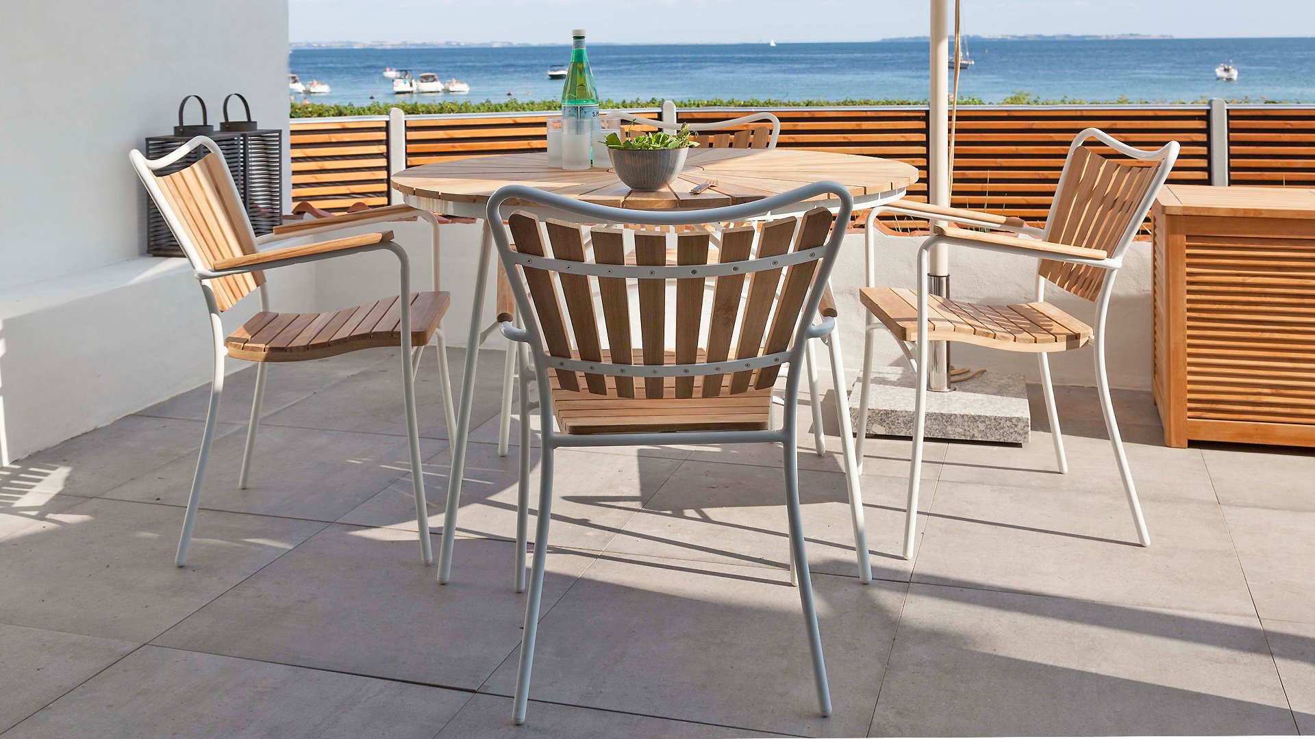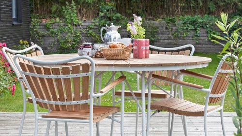 Sowohl die Ellen-Tische als auch die Ellen-Stühle von CINAS sind mit anthrazitfarbenem oder weißem pulverbeschichtetem Aluminiumrahmen erhältlich. Das warme Teakholz in Kombination mit den anthrazitfarbenen oder weißen Rahmen ist eine sehr schöne Kombination.