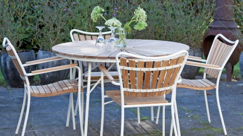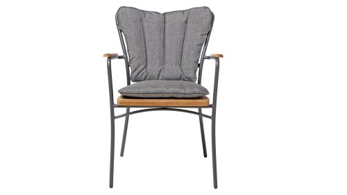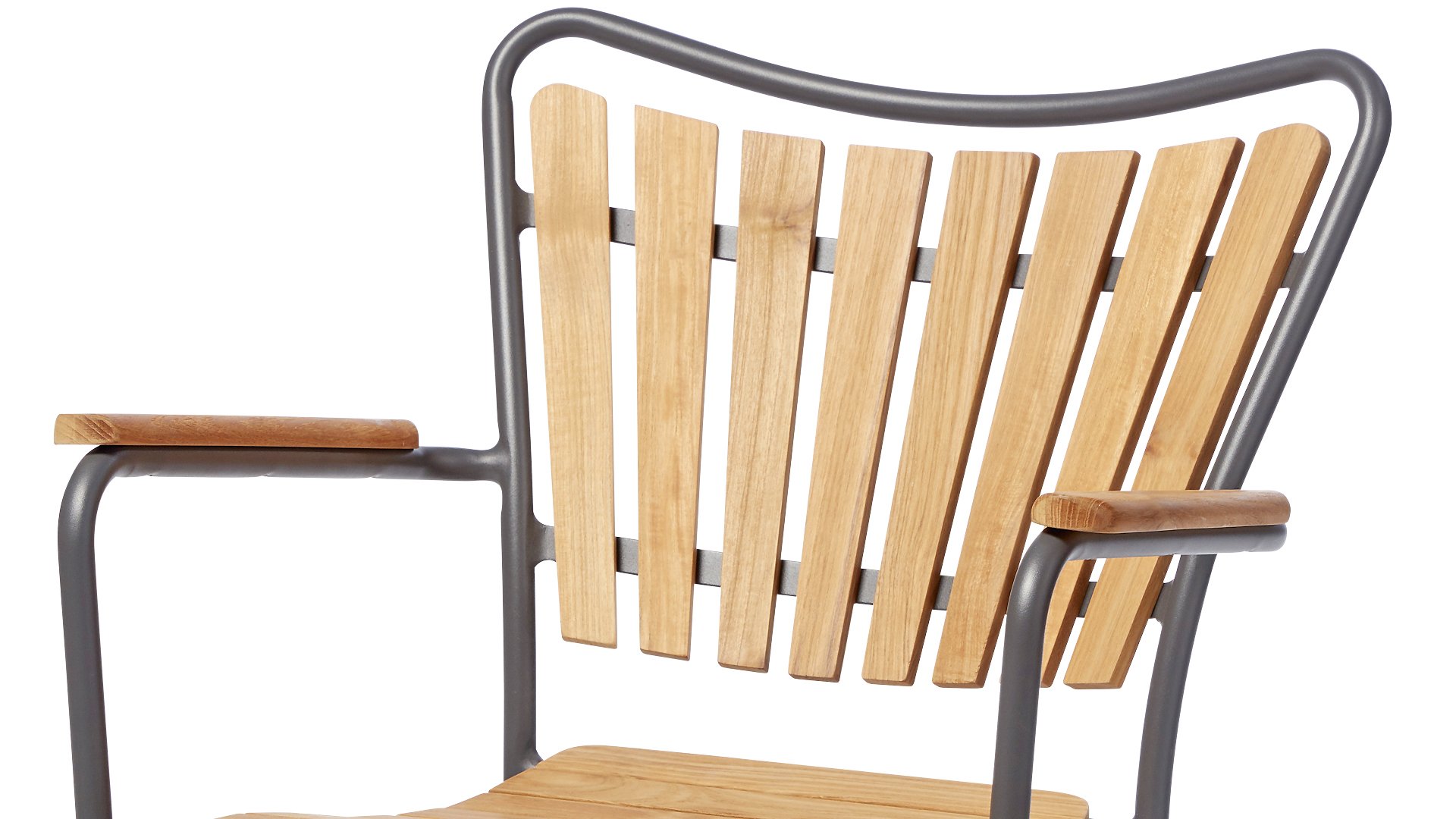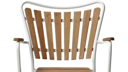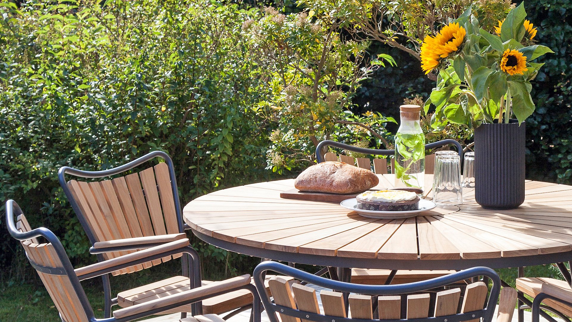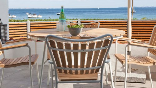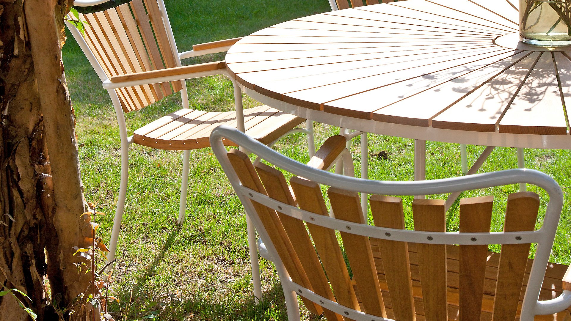 Sowohl die Ellen-Tische als auch die Ellen-Stühle von CINAS sind mit anthrazitfarbenem oder weißem pulverbeschichtetem Aluminiumrahmen erhältlich. Das warme Teakholz in Kombination mit den anthrazitfarbenen oder weißen Rahmen ist eine sehr schöne Kombination.
