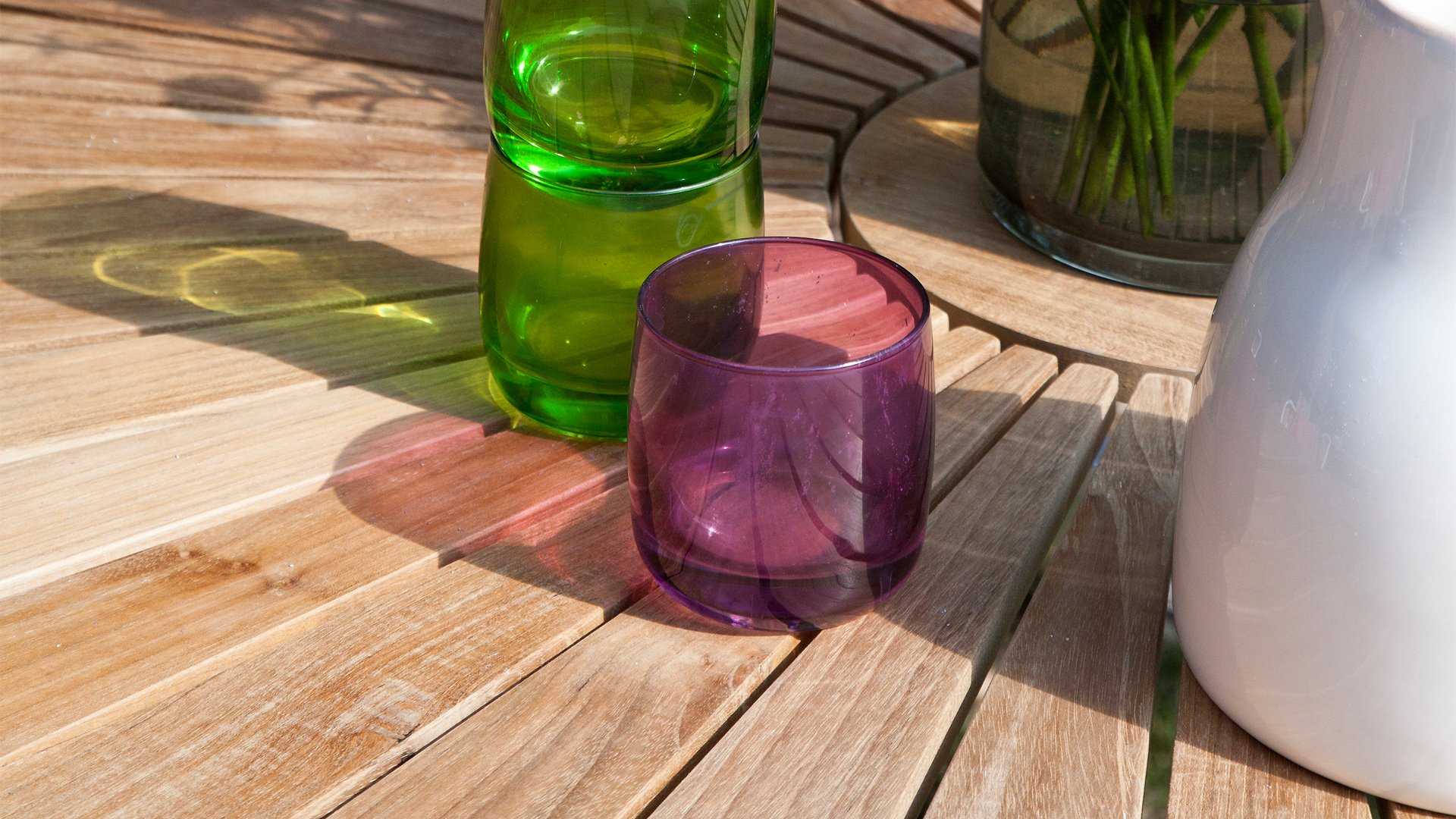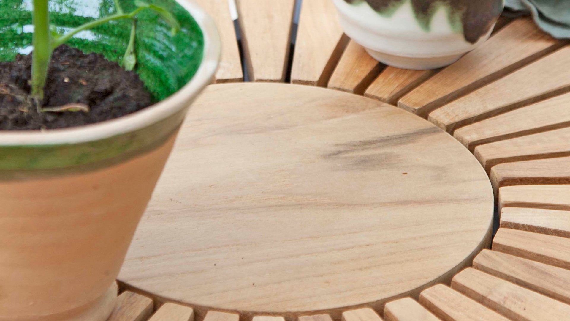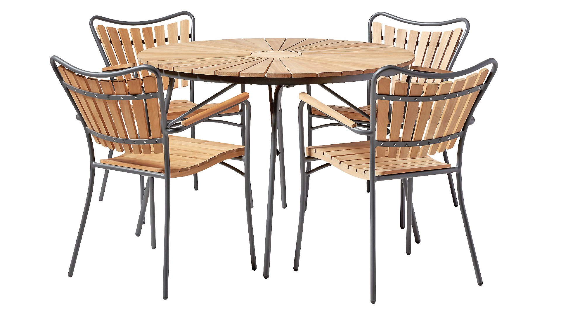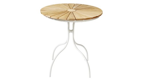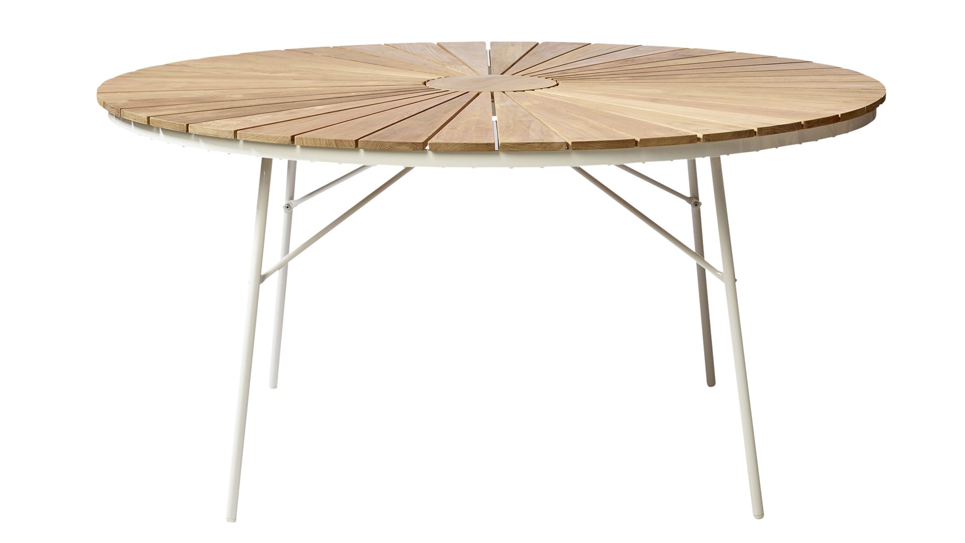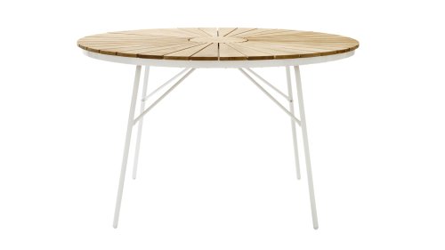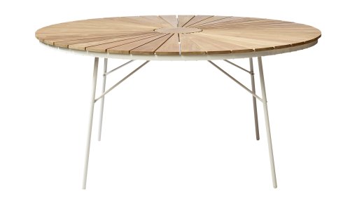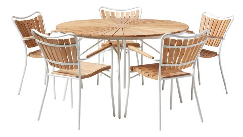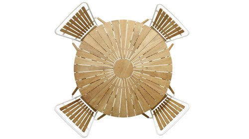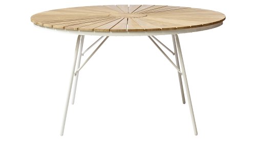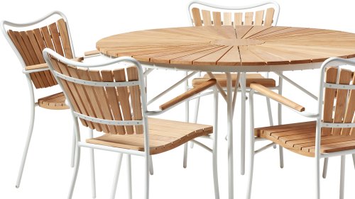 Die schönen CINAS Ellen-Tische haben eine einzigartige Teakholzplatte in Form von Sonnenstrahlen, wenn Ihnen das nicht warm wird!