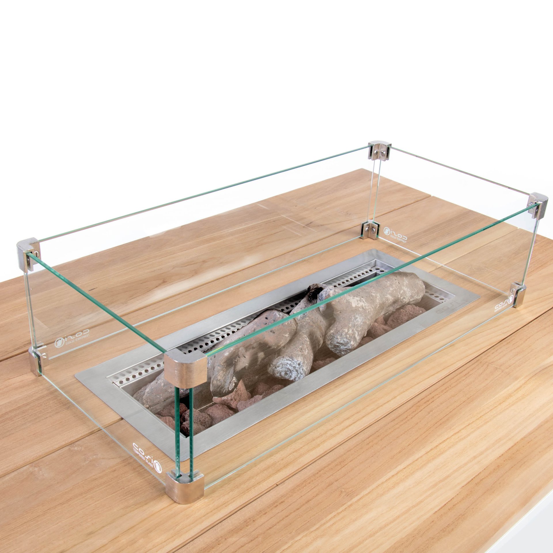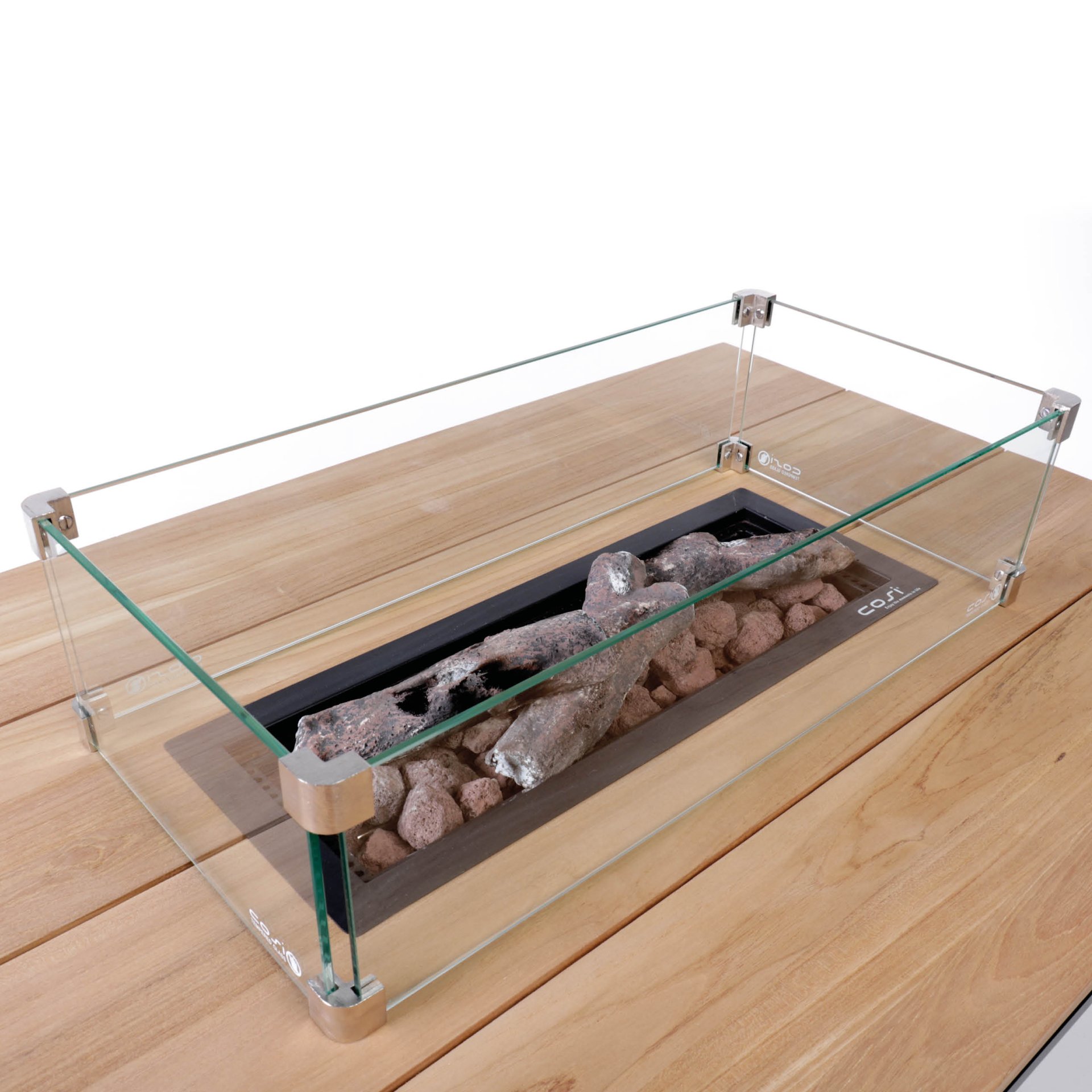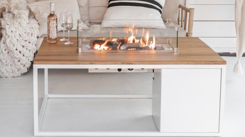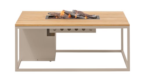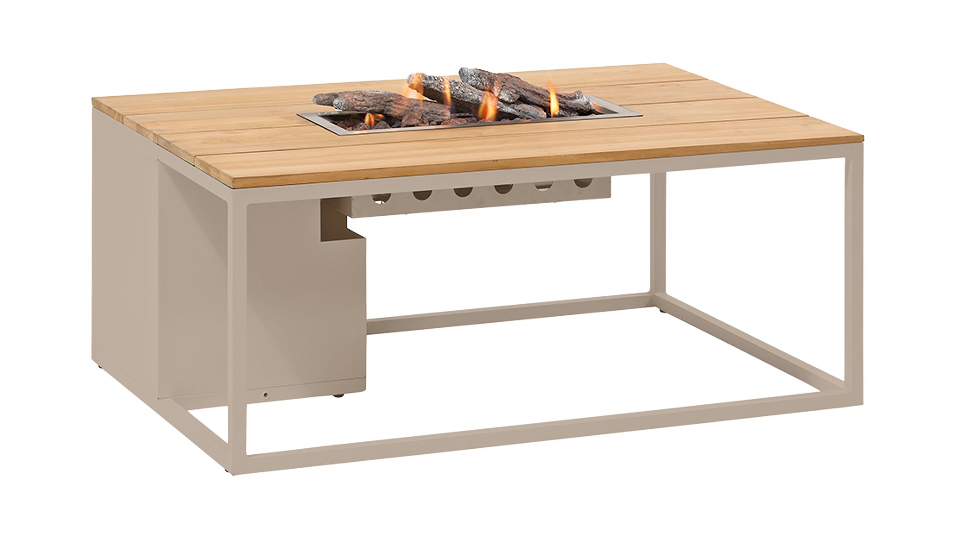 Der Cosiloft 120 Lounge-Tisch kann problemlos mit einer großen Auswahl an Lounge-Sets kombiniert werden. Der Cosiloft 120 Lounge-Tisch verfügt über einen geraden Brenner, der ausreichend Platz bietet, um all Ihre Freunde und Familie zu einem Drink einzuladen. Der Cosiloft ist 80 cm breit und 120 cm lang. Dieser Feuertisch hat, genau wie der Cosiloft 100, einen schönen, offenen Aluminiumrahmen, der mit einer der drei Tischplatten kombiniert werden kann: Teak, Schwarz und Grau. Der Rahmen ist in zwei Farben erhältlich: Weiß für einen modernen Look oder Schwarz für einen industriellen Stil. Trotz seiner schönen Loungemöbelhöhe passt in den Cosiloft 120 sogar eine 5 kg Gasflasche. Diese ist gut in das reine Design des Cosiloft-Tisches integriert. Bei jedem Cosiloft wird eine Abdeckplatte für den Brenner mitgeliefert. Wenn Sie das Feuer nicht eingeschaltet haben, können Sie dennoch die gesamte Tischoberfläche nutzen.