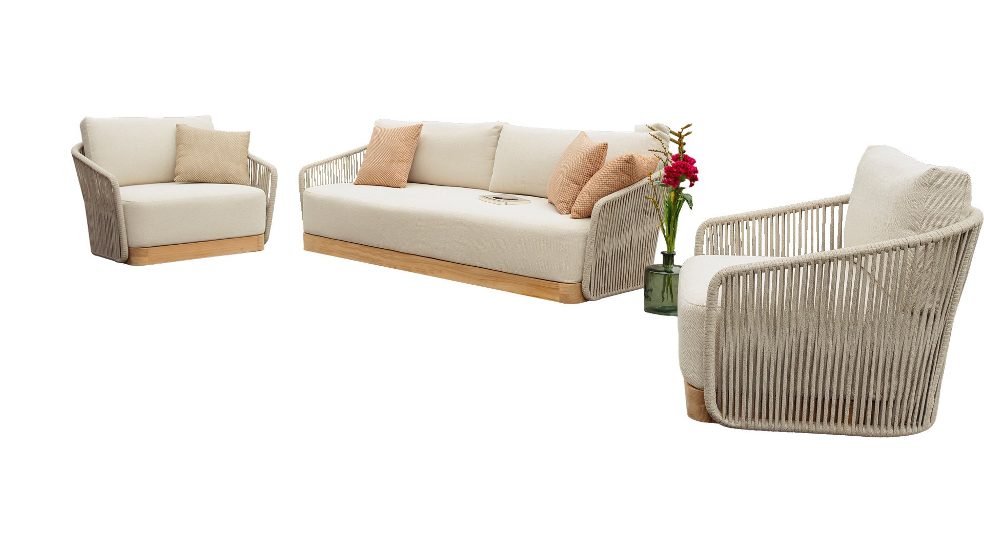 Materialien von Spitzenqualität – Allwetter-Kissen, pflegeleichte Gestelle und hochwertiges Rope sorgen dafür, dass Ihr Set jahrelang schön bleibt.