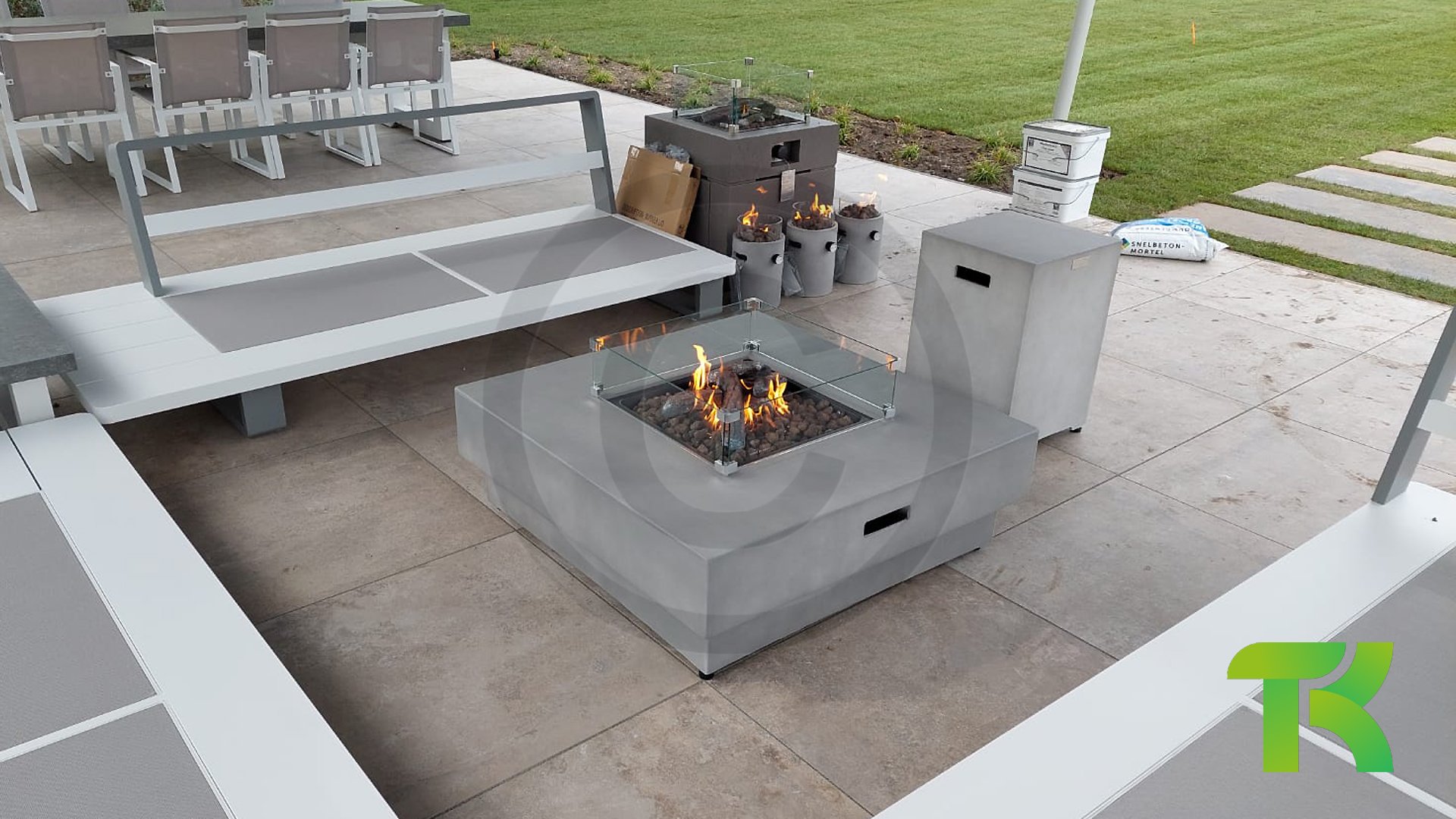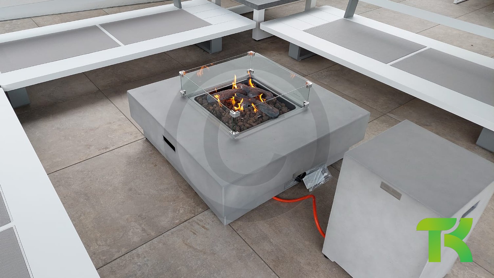 Feuertische inkl. Abdeckung, Holzscheite, Lavasteine und Gasleitung (2,5m).