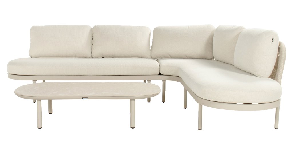 Die Bilboa Eck-Lounge in den Farben Sand, Cappuccino oder Soft Green lädt zum ultimativen Entspannen ein. Das Aluminiumgestell und die beigen Kissen sind pflegeleicht und wetterbeständig. Die runden Formen und die stilvollen Rope-Details in Kombination mit dem passenden Couchtisch schaffen eine gemütliche, warme Lounge- und Sitzecke.
