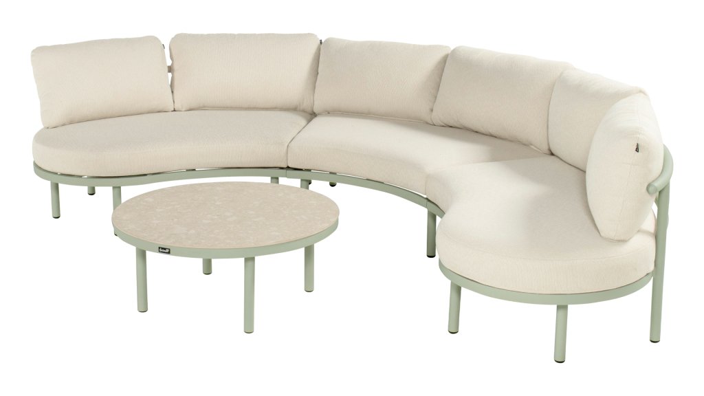 Das Palma runde Loungeset in den Farben Sand, Cappuccino oder Soft Green lädt zum ultimativen Entspannen ein. Der Aluminiumrahmen und die beigen Kissen sind pflegeleicht und wetterbeständig. Die runde Form und der passende Couchtisch sorgen für eine gemütliche, warme Sitzecke.