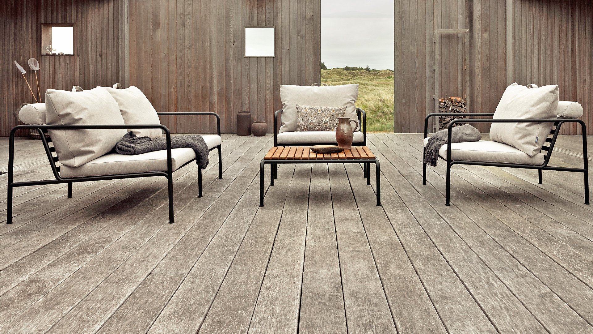 Die HOUE AVON-Kollektion wurde aus dem Wunsch heraus entworfen, etwas mit einem sehr leichten Erscheinungsbild und einem niedrigen, schlanken Profil zu schaffen, während ein hohes Maß an Komfort beibehalten wird. Der wartungsfreie Rahmen und die Konstruktion der großen weichen Rückenkissen ist genau das: die Einfachheit der Struktur, bei der niedrige Linien dafür sorgen, dass das Design immer stolz aussieht, ob mit oder ohne Kissen - Sommer oder Winter. Die Griffe der Kissen sind ein Statement für die Funktion des Produkts und machen sie bei Bedarf leicht zu greifen und zu verstauen.