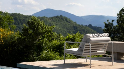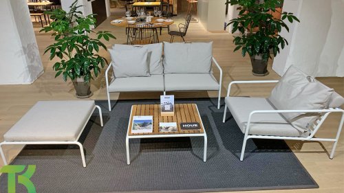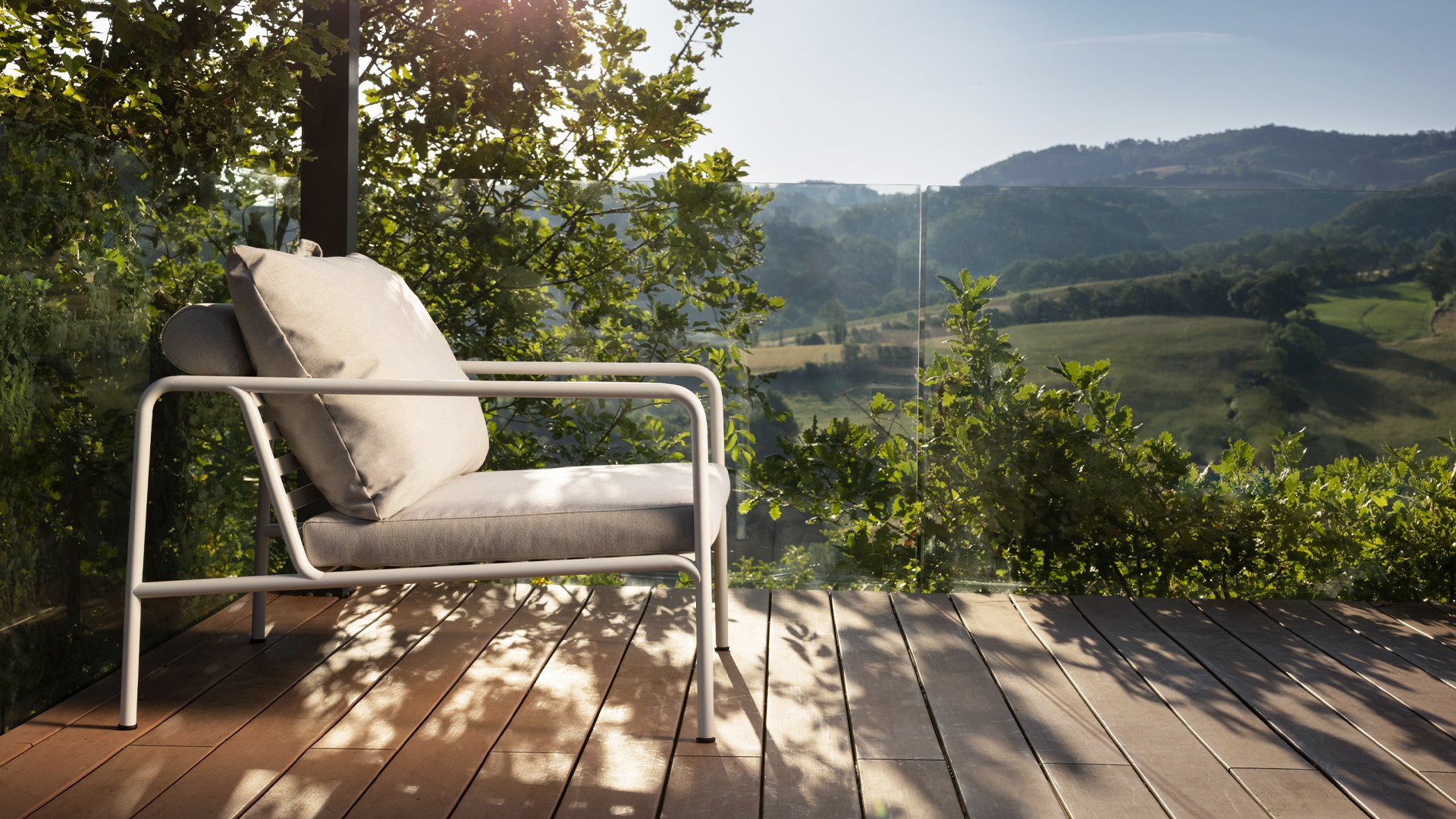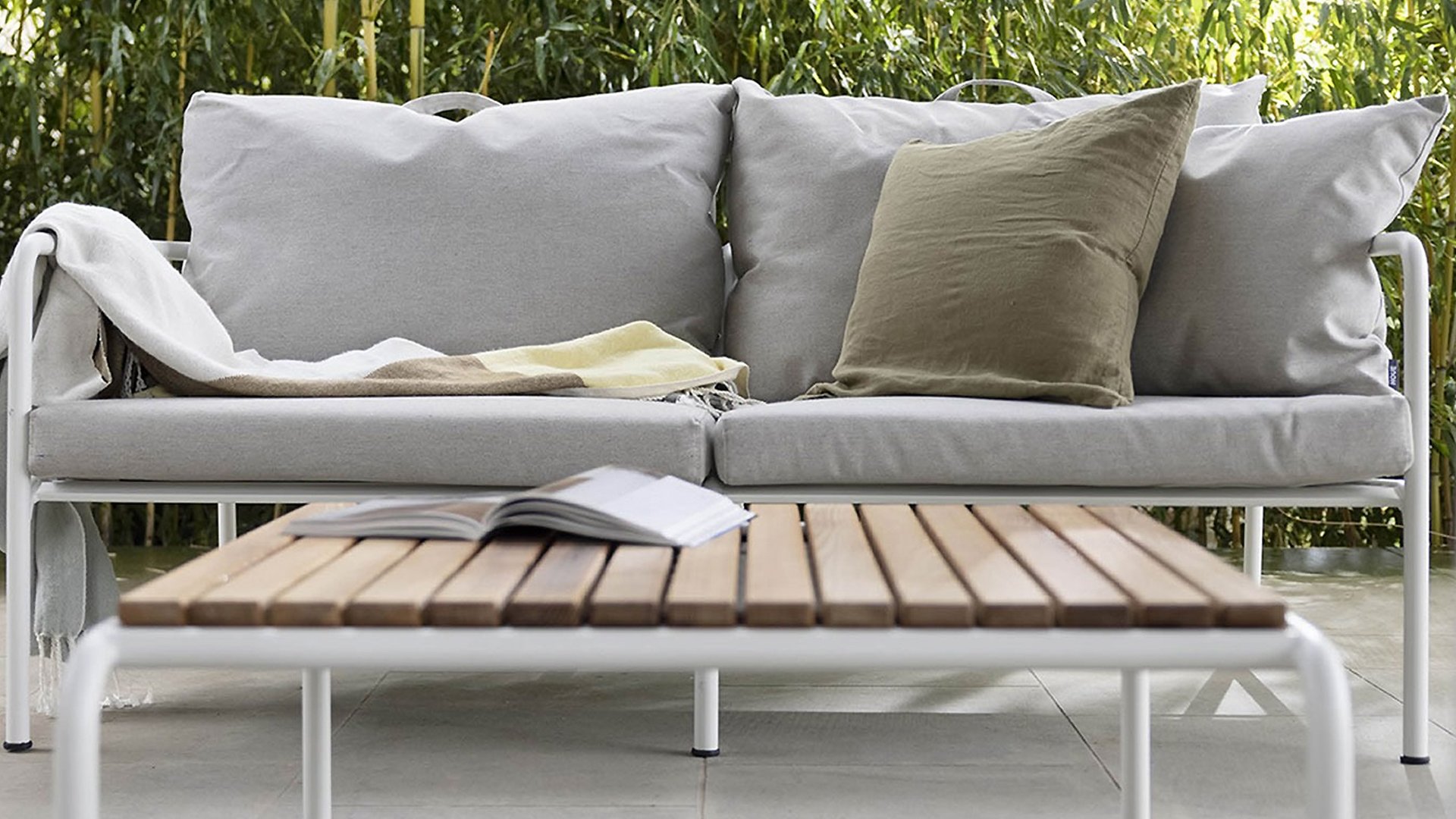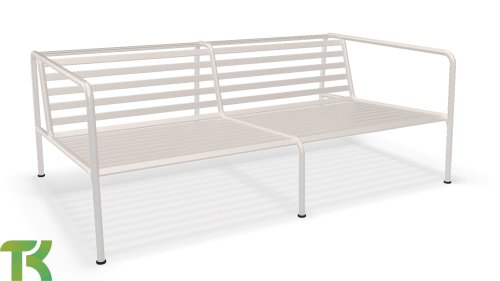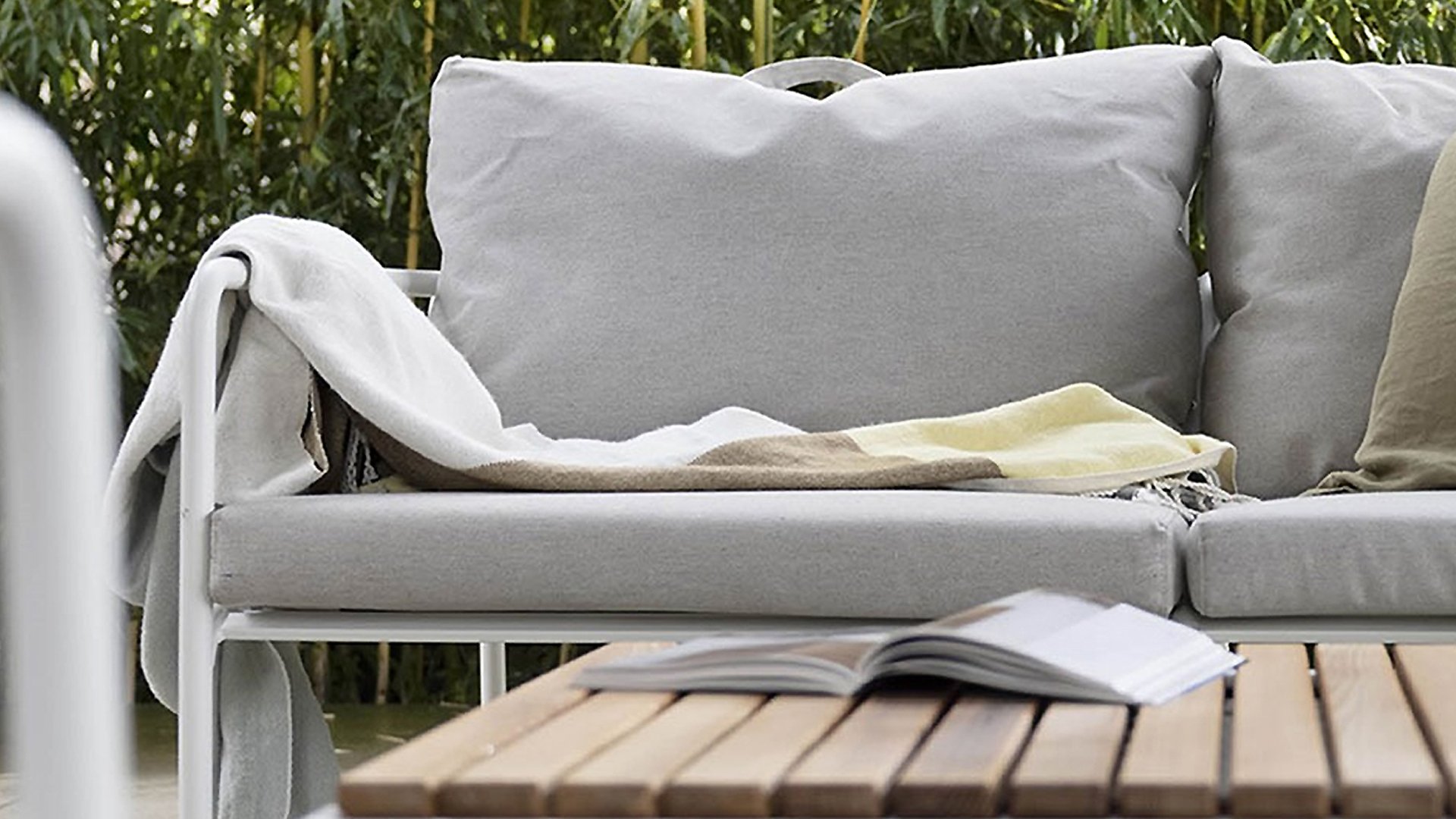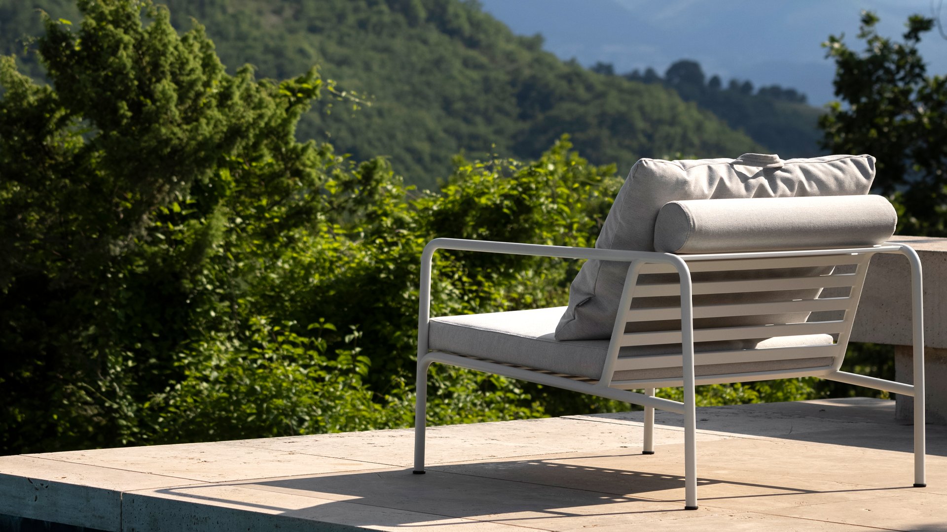 Der wartungsfreie Pulverbeschichteter Rahmen und die Konstruktion der großen weichen Rückenkissen sind genau das - die Einfachheit der Struktur, bei der niedrige Linien dafür sorgen, dass das Design sowohl mit als auch ohne Kissen immer stolz erscheint - Sommer oder Winter. Die Griffe der Kissen sind eine Aussage über die Funktion des Produkts und machen sie bei Bedarf leicht zu greifen und aufzubewahren.