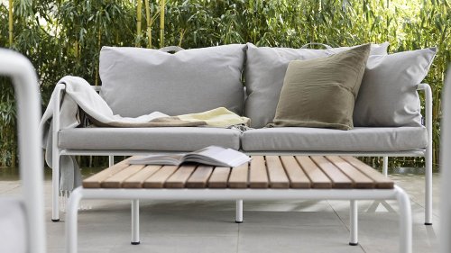 Die HOUE AVON Lounge-Kollektion von Houe besteht aus einem 2-Sitzer-Sofa, einem Loungesessel und einer Ottoman mit Kissen aus Sunbrella Heritage-Stoff sowie einem Lounge-Tischrahmen, der mit oder ohne Eschenholz thermisch behandelte-Tischplatte verwendet werden kann. Die Rahmen bestehen aus pulverbeschichtetem schwarzem Stahl. Der zeitlose Charakter von Avon-Möbeln sorgt dafür, dass Sie sie endlos mit anderen Gartenmöbeln kombinieren können.