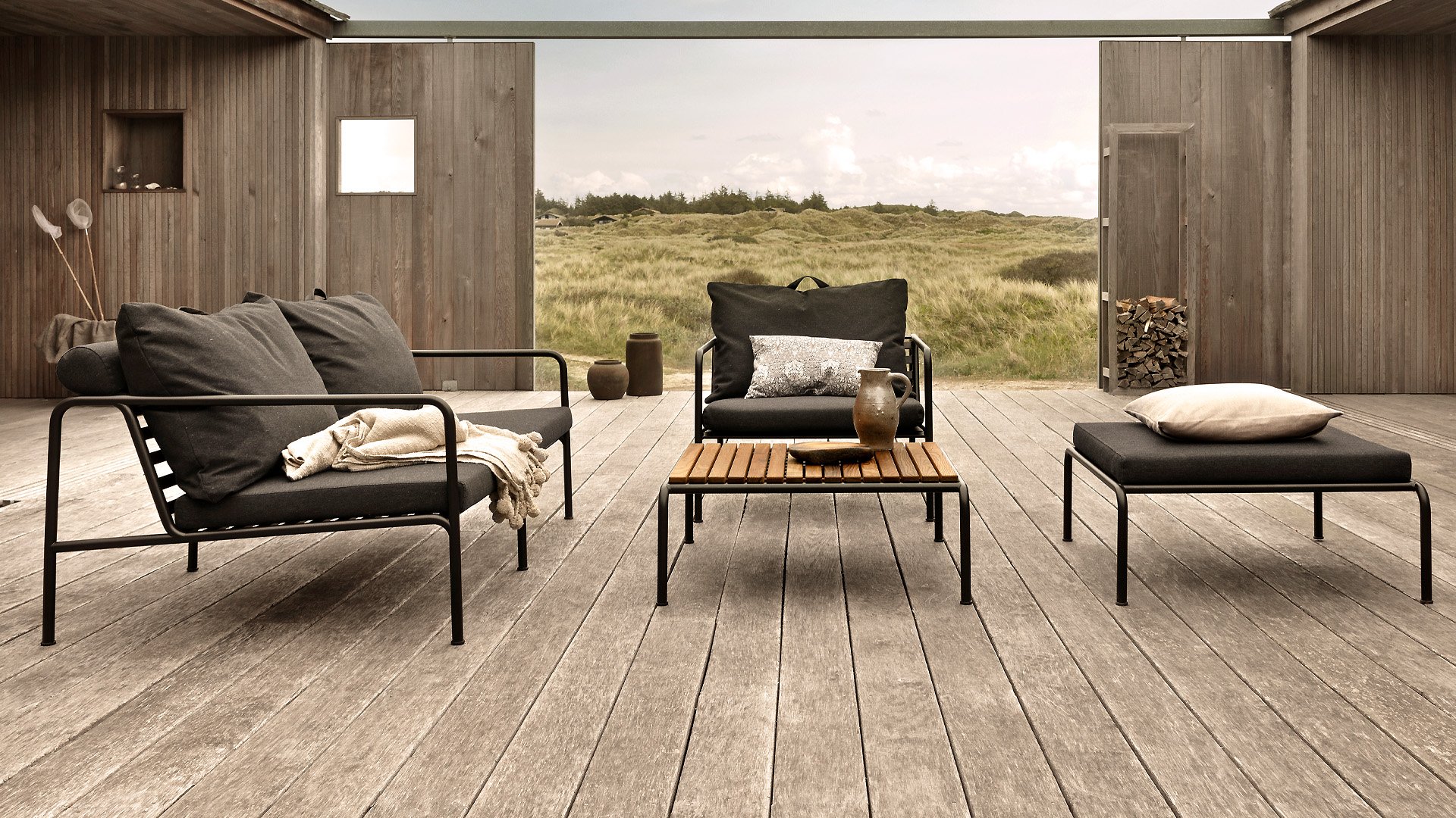 Die HOUE AVON-Kollektion wurde mit dem Wunsch entworfen, etwas mit sehr leichter Ausstrahlung und flachem Profil, aber mit einem hohen Komfortniveau zu schaffen. Das wartungsfreie Gestell und die Konstruktion der großen weichen Rückenkissen sind genau das: die Einfachheit der Struktur, bei der niedrige Linien sicherstellen, dass das Design immer stolz aussieht, sowohl mit als auch ohne Kissen - im Sommer oder Winter. Die Griffe der Kissen sind ein Statement zur Funktion des Produkts, sie sind so gestaltet, dass sie leicht zu greifen und bei Bedarf einfach zu verstauen sind.