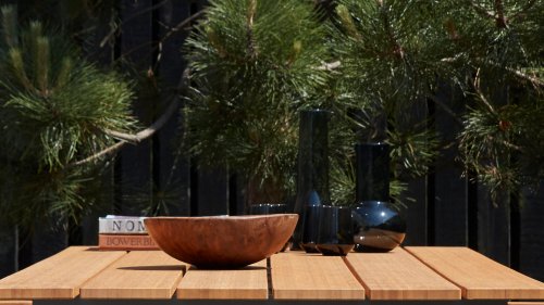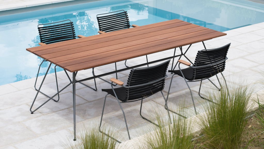 Houe Sketch Gartentisch mit Bambusplatte. Dieser wunderschöne minimalistische Gartentisch der dänischen Designmarke Houe ist in 2 Längen erhältlich: 160 cm und 220 cm. Das Gestell besteht aus Stahl in Kombination mit einer speziellen Pulverbeschichtung, die den Tisch für den Außenbereich geeignet macht. Dieser Tisch passt perfekt zu den Click Dining Gartenstühlen von Houe, das Gestell hat die gleiche Farbe wie das Gestell der Stühle. Da Bambus viel schneller wächst, ist er eine nachhaltige Alternative zu Teak. Bambus sollte 2-3 mal im Jahr geölt werden, dann behält er seine schöne warme Farbe.