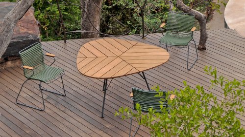 Dieser einzigartige Tisch von Houe hat seinen Namen nicht gestohlen, die Ähnlichkeit mit einem Blatt ist frappierend... Durch die dreieckige Form und die Platzierung des Fußes können bis zu 9 Personen im Leaf speisen. Der von Henrik Pedersen entworfene Tisch Leaf besteht aus grau pulverbeschichtetem Metall mit einer Tischplatte aus Bambuslatten. Bambus ist eine schnell wachsende Pflanze. Vorausgesetzt, es wird richtig gepflegt, ist es ein haltbareres Material als Teak. Wir empfehlen Bambus 2-3 mal im Jahr zu ölen, dann hält der Tisch sehr lange und behält seine warmen Farben.