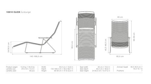 Die Houe Click Sonnenliegen sind in folgenden Farben erhältlich: Schwarz, Dunkelgrau, Staubiges Grün, Multi-1 Rot/Gelb, Multi-2 Blau/Grün, Olivgrün, Paprika, Petrol, Taubenblau, Kieferngrün, Sand, Staubiges Hellblau, Dunkelblau
