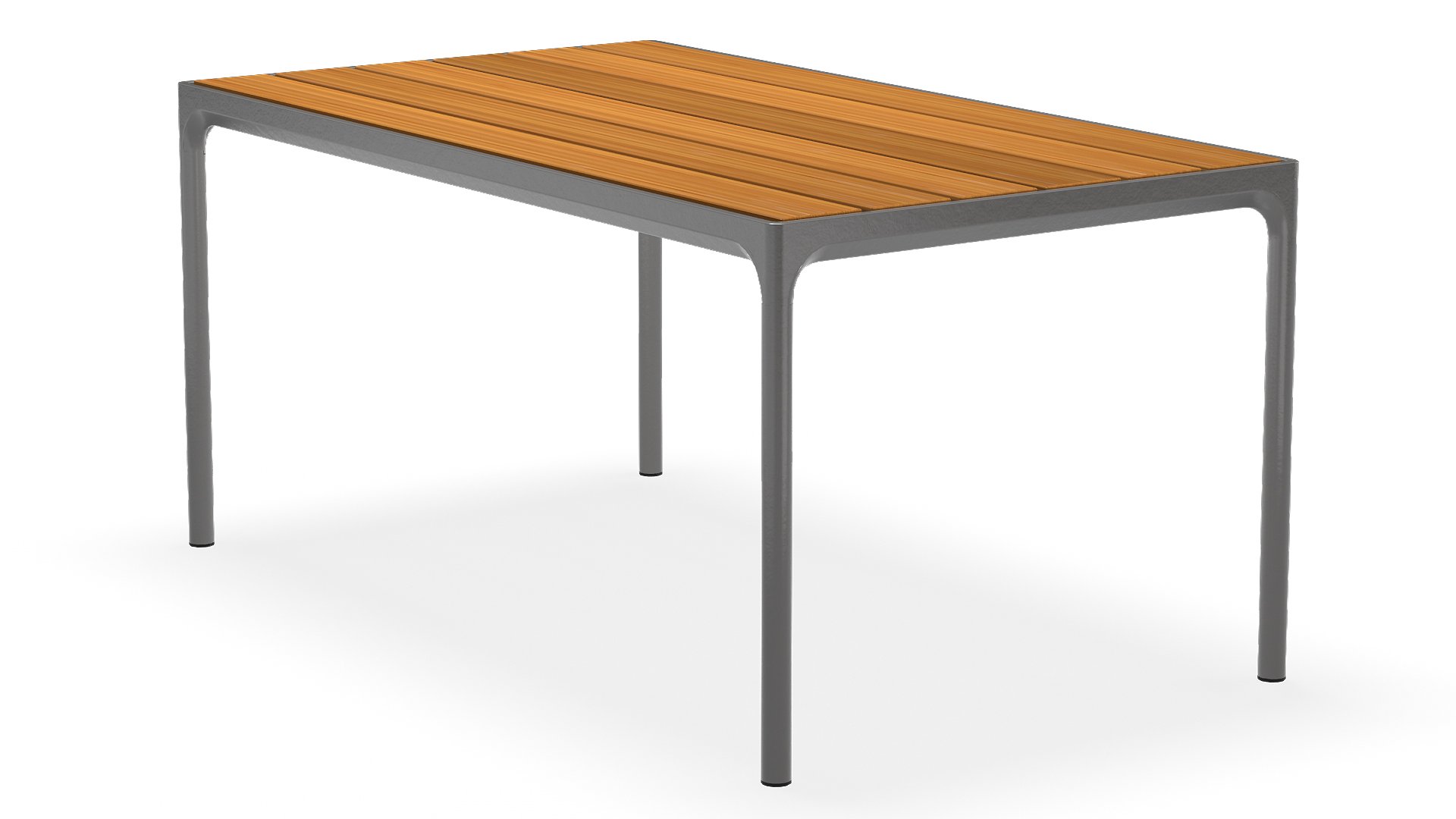 Der Four Tisch von Houe ist ein robustes Modell, das gut in ein industrielles oder robustes Interieur passt. Der Tisch wurde entwickelt, um Wind und Wetter standzuhalten. Der Four Tisch hat einen robusten Aluminiumrahmen, der in pulverbeschichtetem Grau oder Schwarz erhältlich ist. Die Bambustischplatte hat eine Struktur, die sich sehr gut für den Außenbereich eignet. Der Tisch ist in den Größen mit einer Länge von 90, 160, 210 und 270cm und haben alle eine Breite von 90 cm und eine Höhe von 74 cm (Bartisch 111 cm hoch). Bambus ist eine nachhaltigere Alternative zu Teakholz. Wir empfehlen jedoch, den Bambus 2-3 Mal im Jahr mit Öl zu behandeln, um die warmen Farben des Tisches zu erhalten.