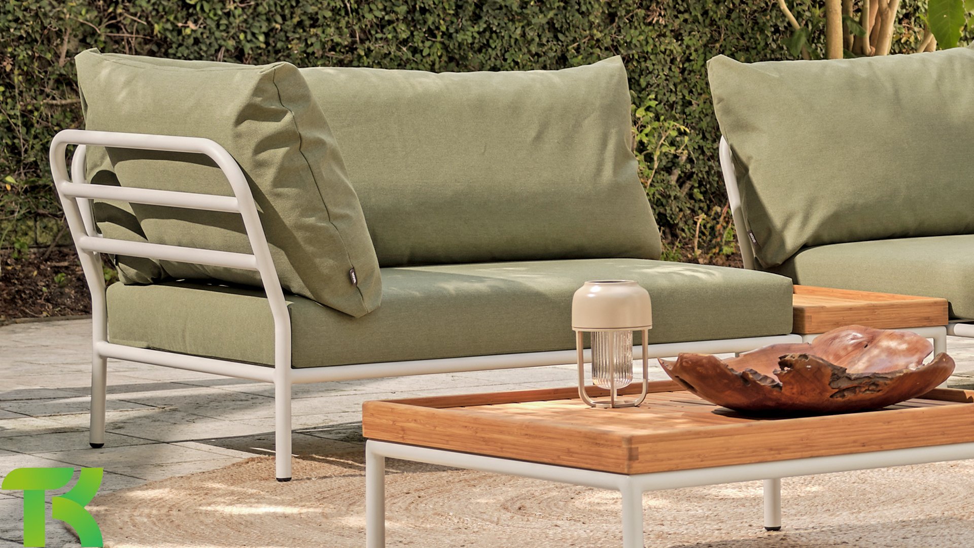 Wasser fließt direkt durch den speziellen Schaum hindurch, während ein weiteres Material, Dacron, dafür sorgt, dass die Kissen ihre originale Form behalten. Die Polster sind ausziehbar und waschbar. Die Kissen in der Lounge sind mit einem speziellen Outdoor-Stoff mit einer Basis aus Quickdry-Schaum versehen. Dadurch sind die Kissen in kürzester Zeit wieder trocken und es bildet sich kein Schimmel. Die Stoffe sind leicht mit einem milden Reinigungsmittel zu reinigen. Die Kissen sind abnehmbar und bei 30 Grad waschbar. Die Kissen in Alpengrün und Esche in Hellgrau / Ecru-Farbe und die Char Farbe bestehen aus Sunbrella Heritage-Material, das zu 50% aus recyceltem Acryl besteht. Bunte Faserenden aus dem Recycling des Primärmaterials können im Stoff auftreten und die Stofffarbe von Charge zu Charge variieren. Dadurch entsteht ein einzigartiger Stoff mit natürlichem Aussehen und Vintage-Charme. Der Stoff ist Oeko-tex-zertifiziert, wasserabweisend, schmutzabweisend und wartungsfreundlich.