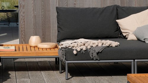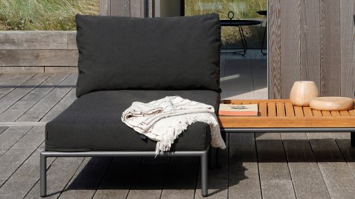 Bunte Faserenden aus dem Recycling des Primärmaterials können im Stoff auftreten und die Stofffarbe von Charge zu Charge variieren. Dadurch entsteht ein einzigartiger Stoff mit natürlichem Aussehen und Vintage-Charme. Der Stoff ist Oeko-tex-zertifiziert, wasserabweisend, schmutzabweisend und wartungsfreundlich. Für jedes Houe Level-Teil sind maßgeschneiderte Abdeckungen erhältlich! Die verschiedenen Elemente dieser Kollektion können auf unterschiedliche Weise miteinander kombiniert werden, was zu einer hochwertigen Lounge-Ecke auf Ihrer Terrasse führt. Das Sofamodul besteht aus pulverbeschichtetem Aluminium und verfügt über Kissen aus wasserabweisendem, dunkelgrauem Material.