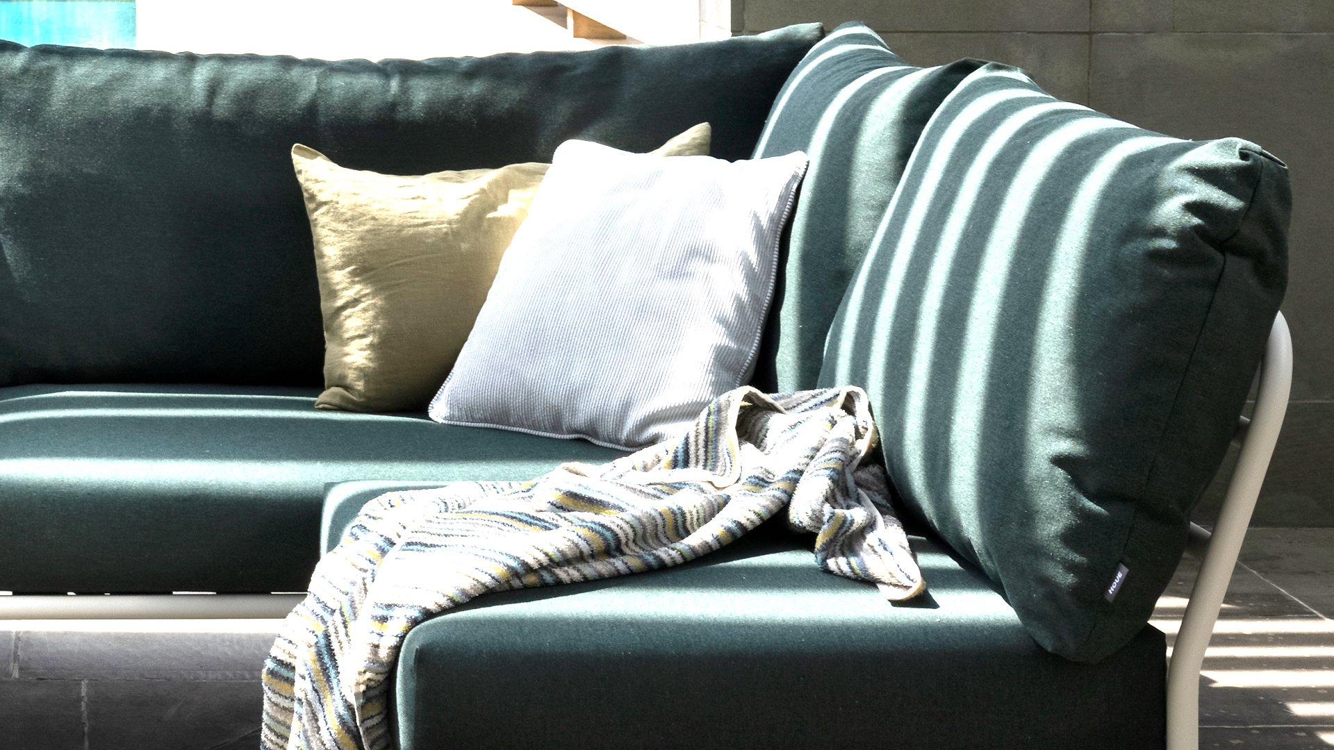 Wasser fließt direkt durch den speziellen Schaum hindurch, während ein weiteres Material, Dacron, dafür sorgt, dass die Kissen ihre originale Form behalten. Die Polster sind ausziehbar und waschbar. Die Kissen in der Lounge sind mit einem speziellen Outdoor-Stoff mit einer Basis aus Quickdry-Schaum versehen. Dadurch sind die Kissen in kürzester Zeit wieder trocken und es bildet sich kein Schimmel. Die Stoffe sind leicht mit einem milden Reinigungsmittel zu reinigen. Die Kissen sind abnehmbar und bei 30 Grad waschbar.Die Kissen in Alpengrün und Esche in Hellgrau / Ecru-Farbe die Char Farbe bestehen aus Sunbrella Heritage-Material, das zu 50% aus recyceltem Acryl besteht. Bunte Faserenden aus dem Recycling des Primärmaterials können im Stoff auftreten und die Stofffarbe von Charge zu Charge variieren. Dadurch entsteht ein einzigartiger Stoff mit natürlichem Aussehen und Vintage-Charme. Der Stoff ist Oeko-tex-zertifiziert, wasserabweisend, schmutzabweisend und wartungsfreundlich.