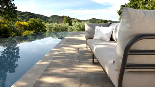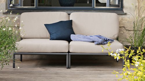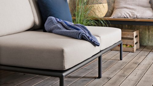 Bunte Faserenden aus dem Recycling des Primärmaterials können im Stoff auftreten und die Stofffarbe von Charge zu Charge variieren. Dadurch entsteht ein einzigartiger Stoff mit natürlichem Aussehen und Vintage-Charme. Der Stoff ist Oeko-tex-zertifiziert, wasserabweisend, schmutzabweisend und wartungsfreundlich. Für jedes Houe Level-Teil sind maßgeschneiderte Abdeckungen erhältlich! Die verschiedenen Elemente dieser Kollektion können auf unterschiedliche Weise miteinander kombiniert werden, was zu einer hochwertigen Lounge-Ecke auf Ihrer Terrasse führt. Das Sofamodul besteht aus pulverbeschichtetem Aluminium und verfügt über Kissen aus wasserabweisendem, dunkelgrauem Material.