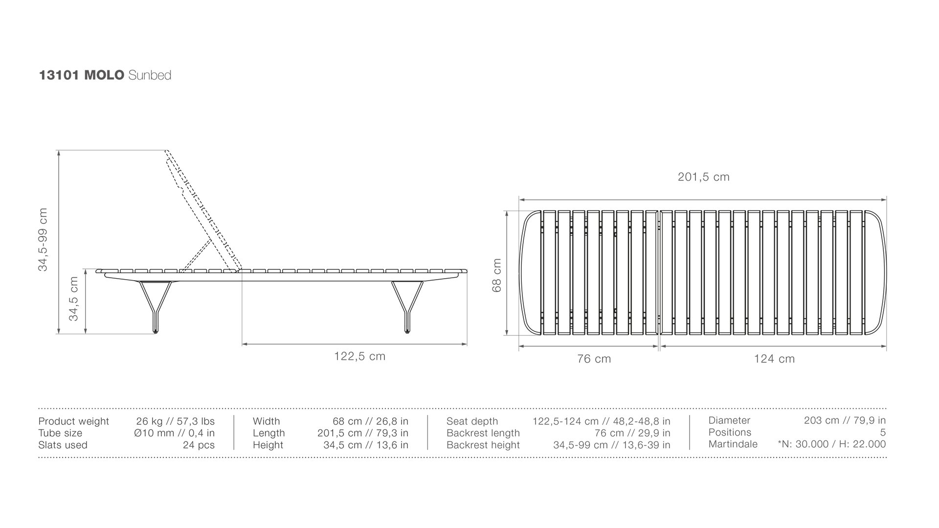 Bemaß: ± 201x68x35/90cm (LxBxH)